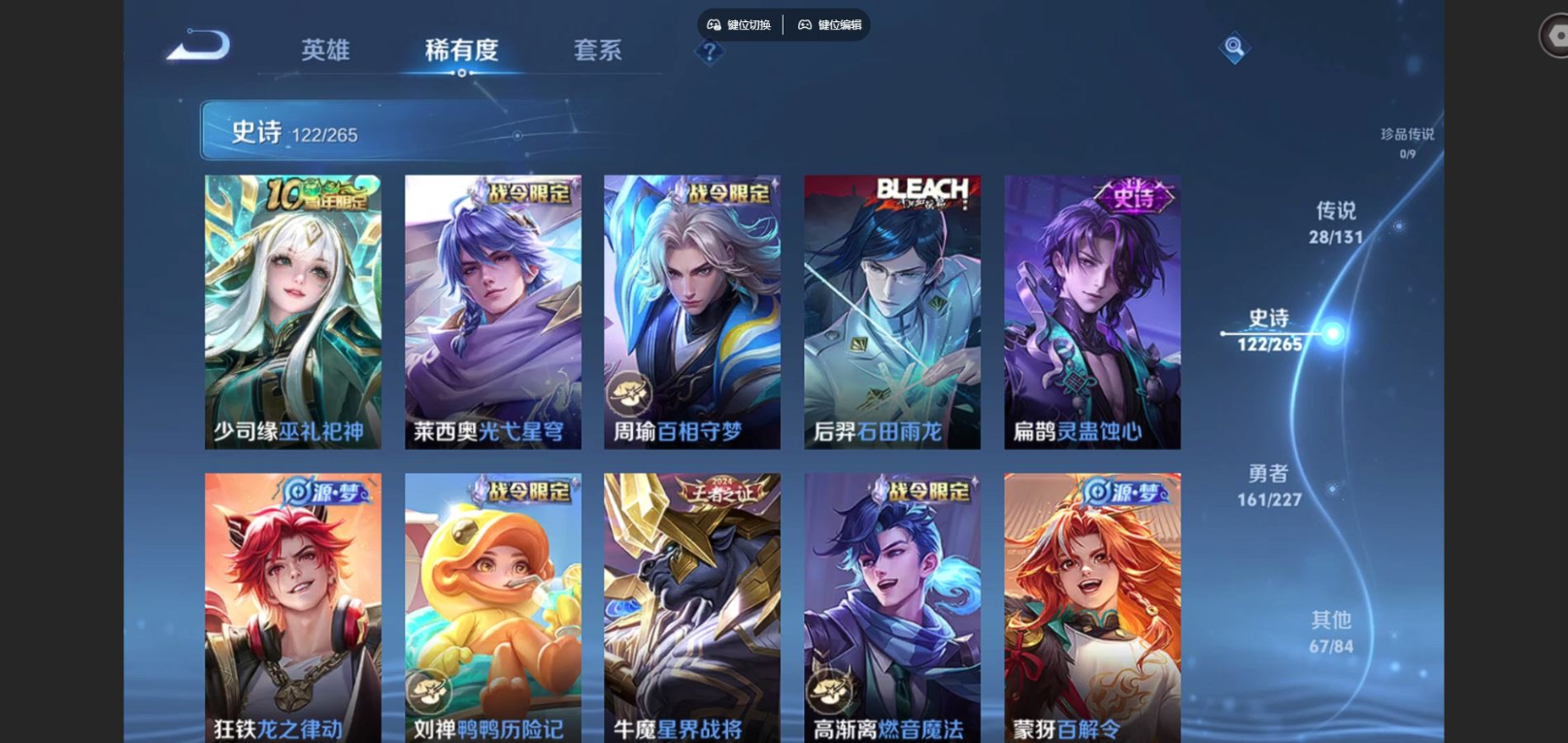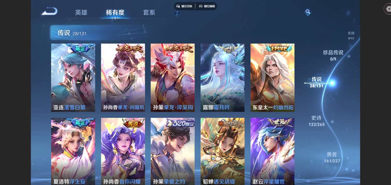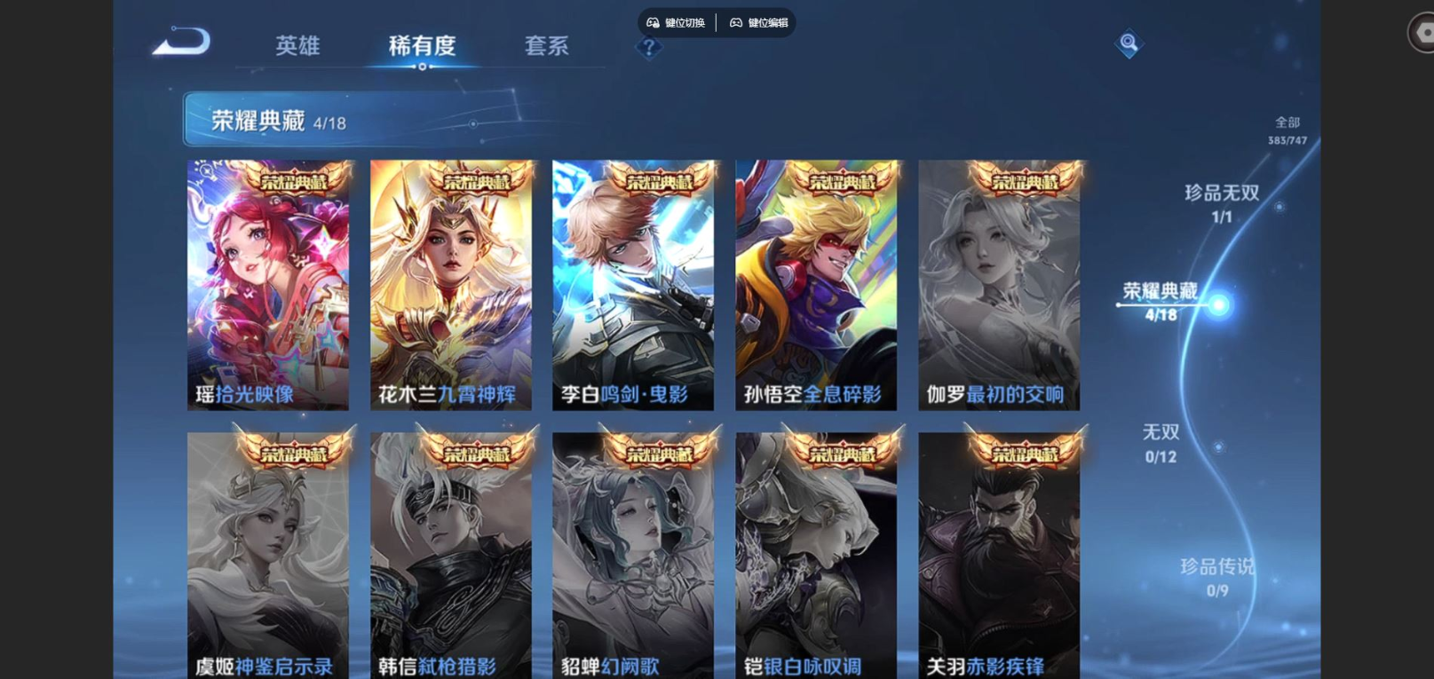 2300101-126英雄-383皮肤v9-5典藏1珍品无双28传说 2星传说 幻海之心 幽冥之眼 【典藏】 拾光映像 武则天 全息碎影 鸣剑曳影 九霄神辉 【珍品无双】 馥梦繁花 【传说】 落雪白狼 乘龙问璇玑 乘龙淬吴钩 白虎志 启明星使 时雨天司 零号赤焰 遇见胡旋 浮生妄 挚爱之约 霜月吟 灼幽烈阳 淬星耀世 音你闪耀 炽阳神光 云鹰飞将 猫影幻舞 久胜战神 冠军飞将 一念神魔
