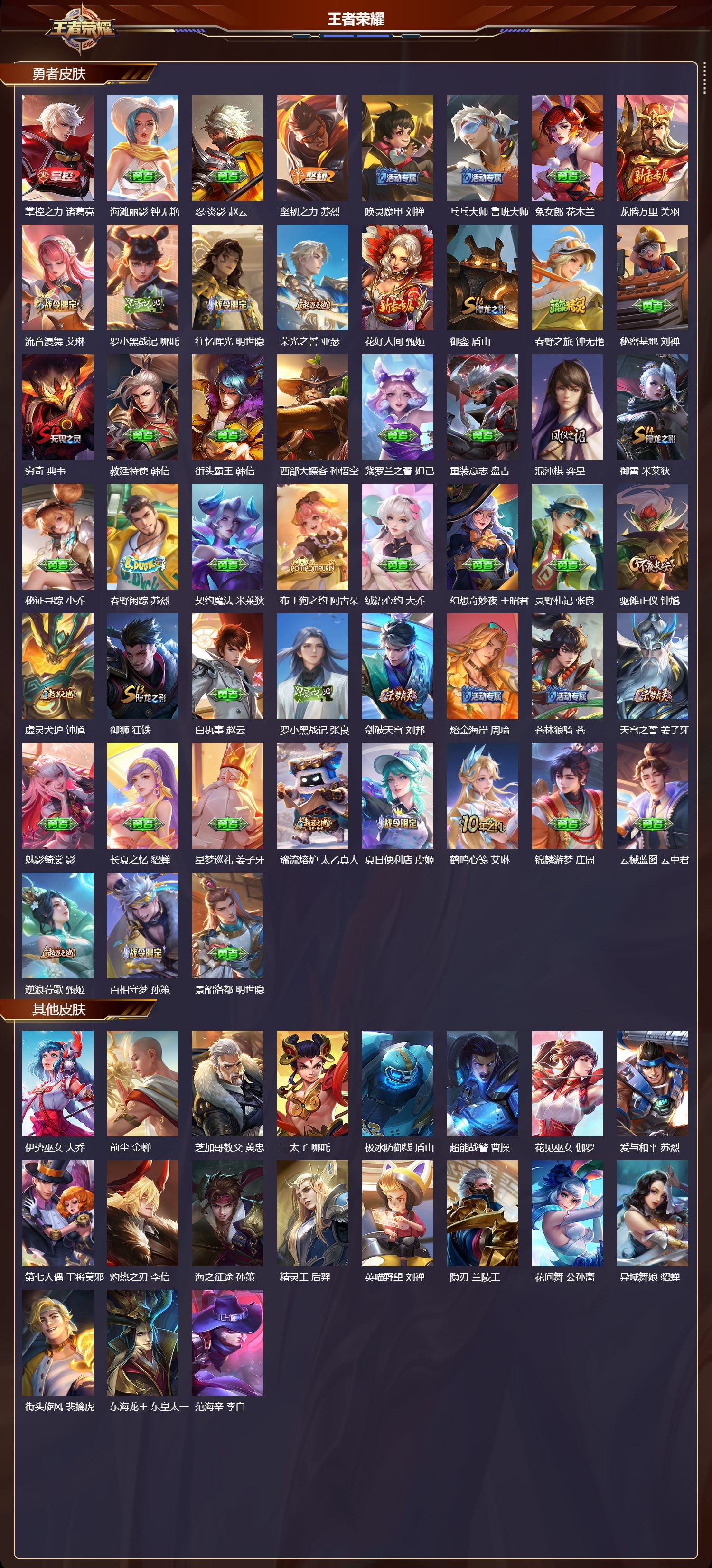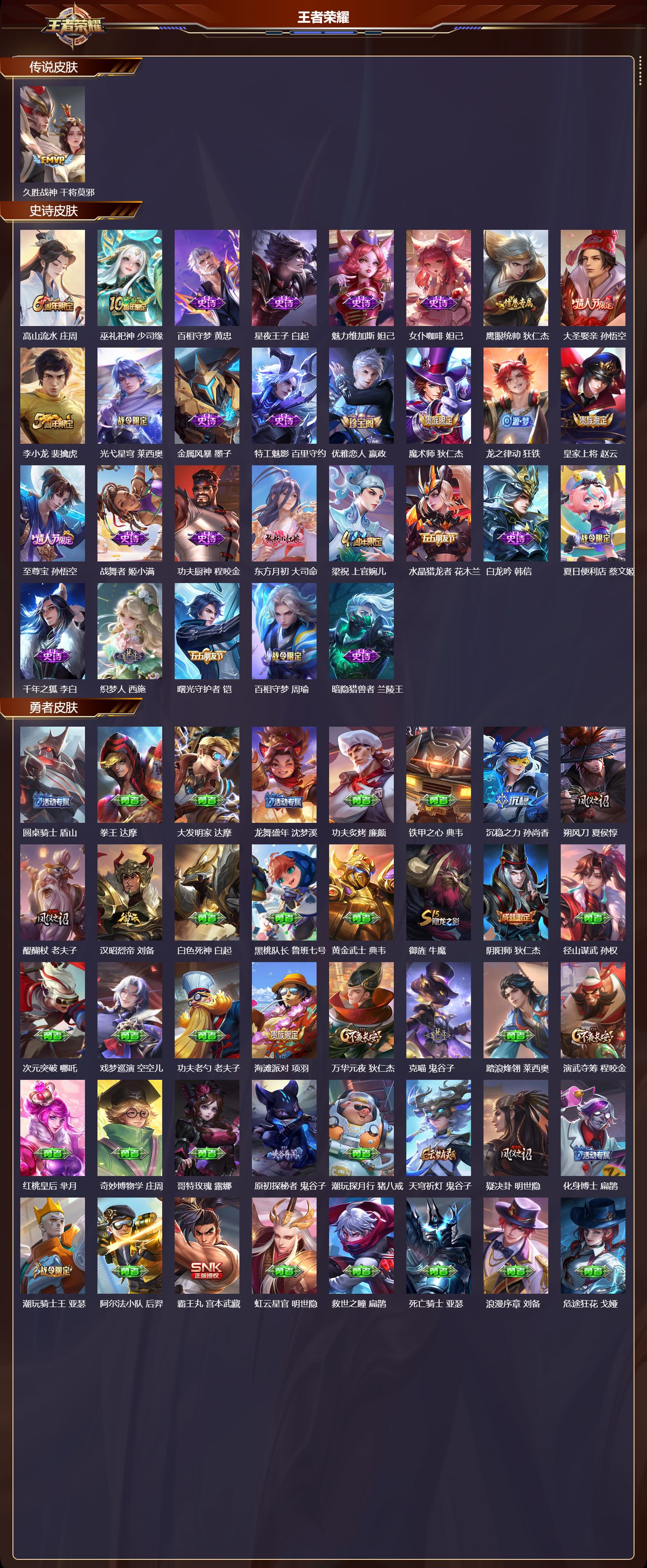 安卓qq/最强王者/160皮肤/125英雄/0典藏/0珍品无双/0无双/0珍品传说/1传说/29史诗/9稀有英雄【1 传说皮肤】久胜战神 干将莫邪【29 史诗皮肤】高山流水 庄周巫礼祀神 少司缘百相守梦 黄忠星夜王子 白起魅力维加斯 妲己女仆咖啡 妲己鹰眼统帅 狄仁杰大圣娶亲 孙悟空李小龙 裴擒虎光弋星穹 莱西奥金属风暴 墨子特工魅影 百里守约优雅恋人 嬴政魔术师 狄仁