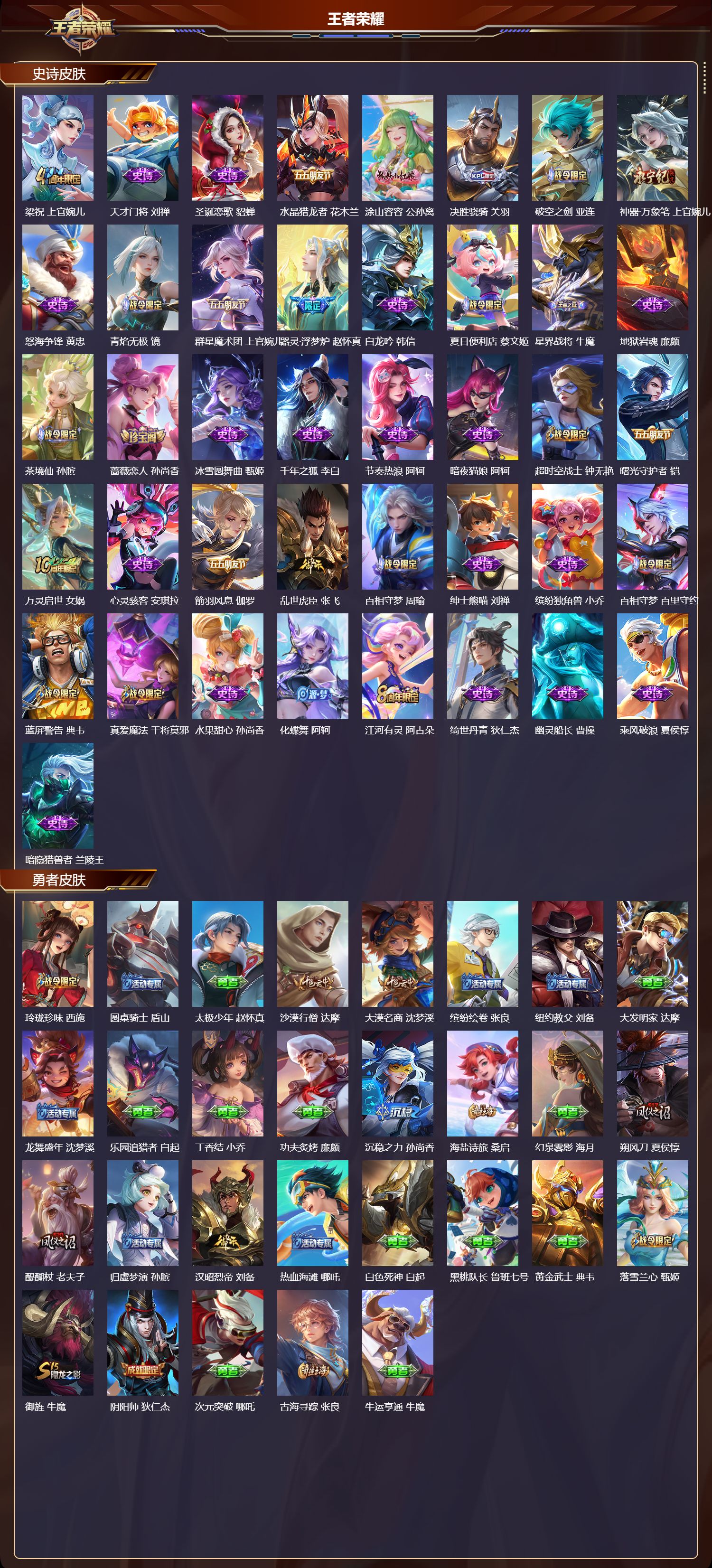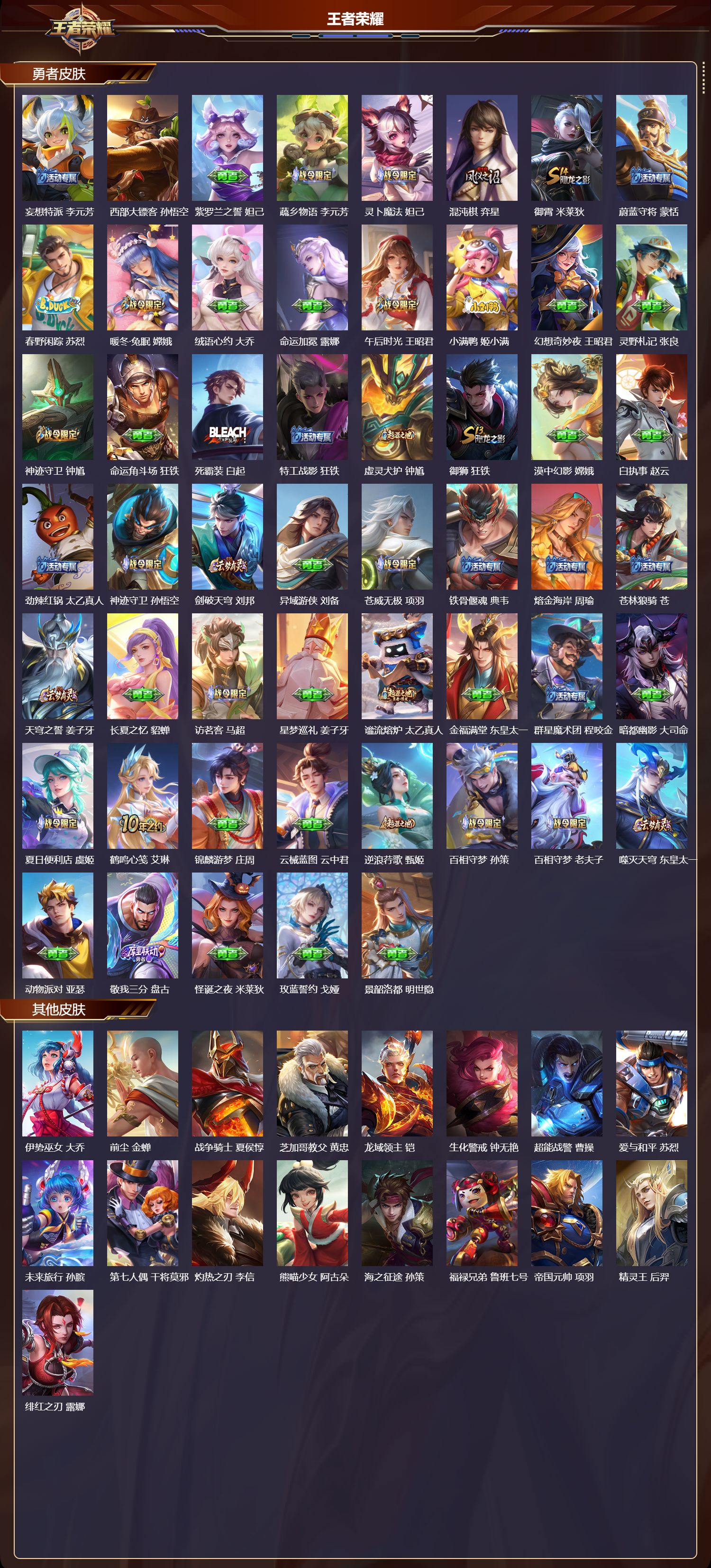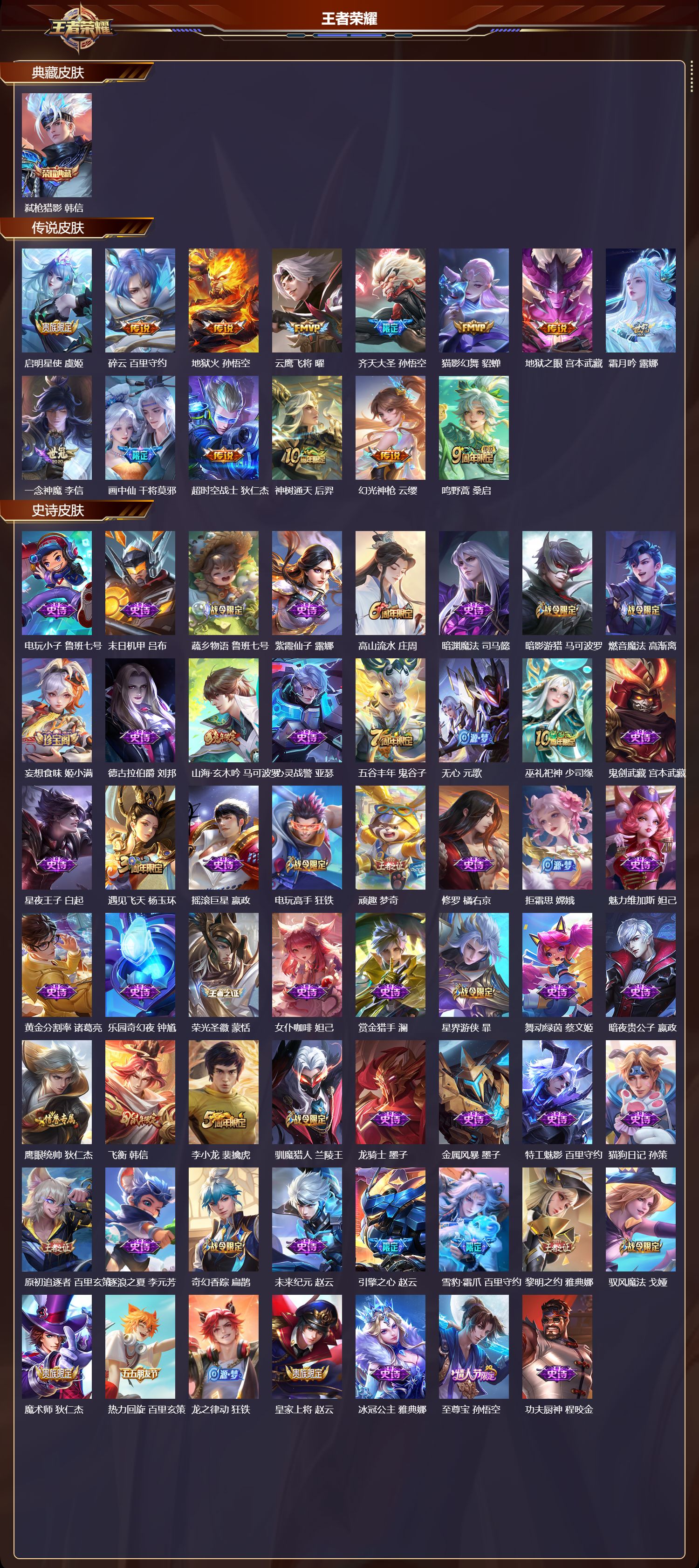 安卓微信/荣耀王者/318皮肤/125英雄/1典藏/0珍品无双/0无双/0珍品传说/14传说/96史诗/9稀有英雄【1 典藏皮肤】弑呛猎影 韩信【14 传说皮肤】启明星使 虞姬碎云 百里守约地狱火 孙悟空云鹰飞将 曜齐天大圣 孙悟空猫影幻舞 貂蝉地狱之眼 宫本武藏霜月吟 露娜一念神魔 李信画中仙 干将莫邪超时空战士 狄仁杰神树通天 后羿幻光神呛 云缨鸣野蒿 桑启【96