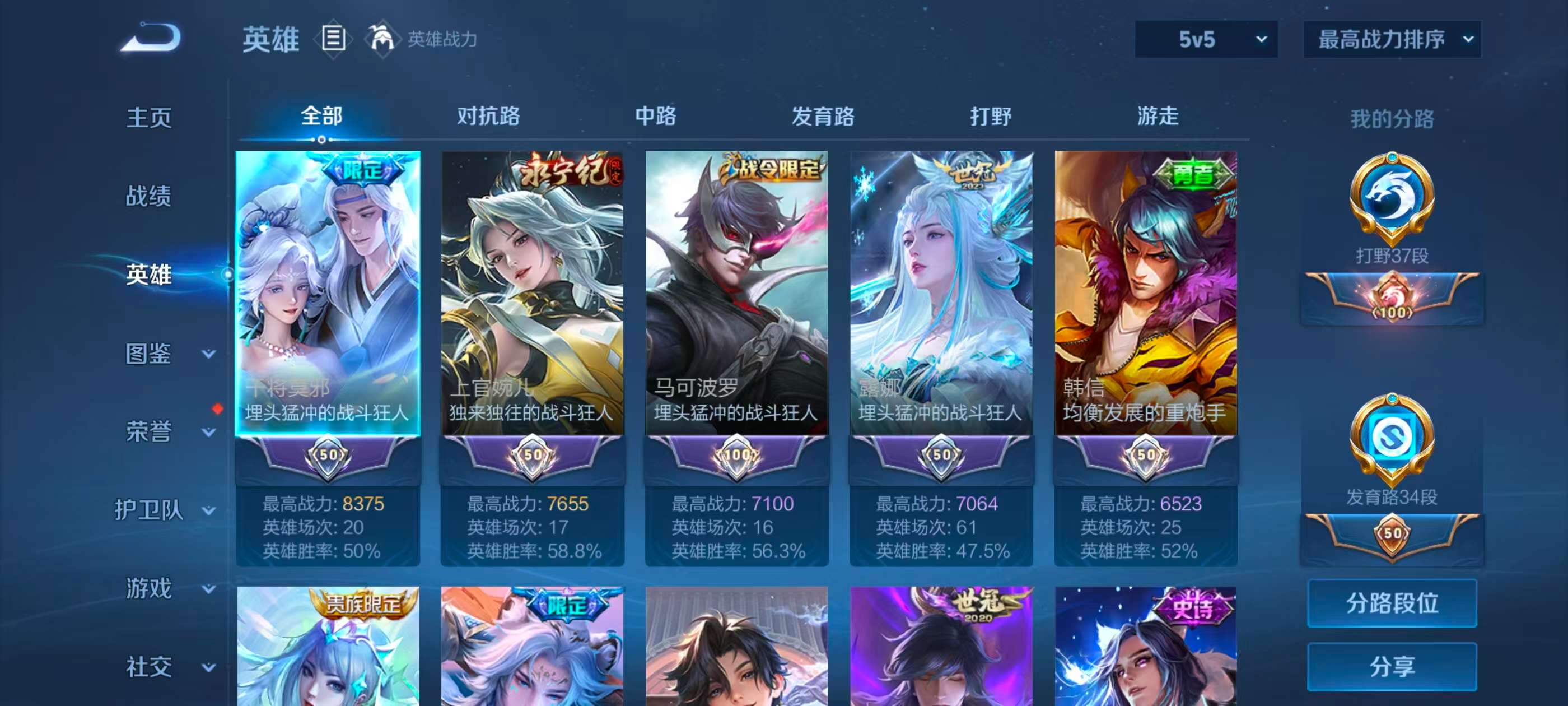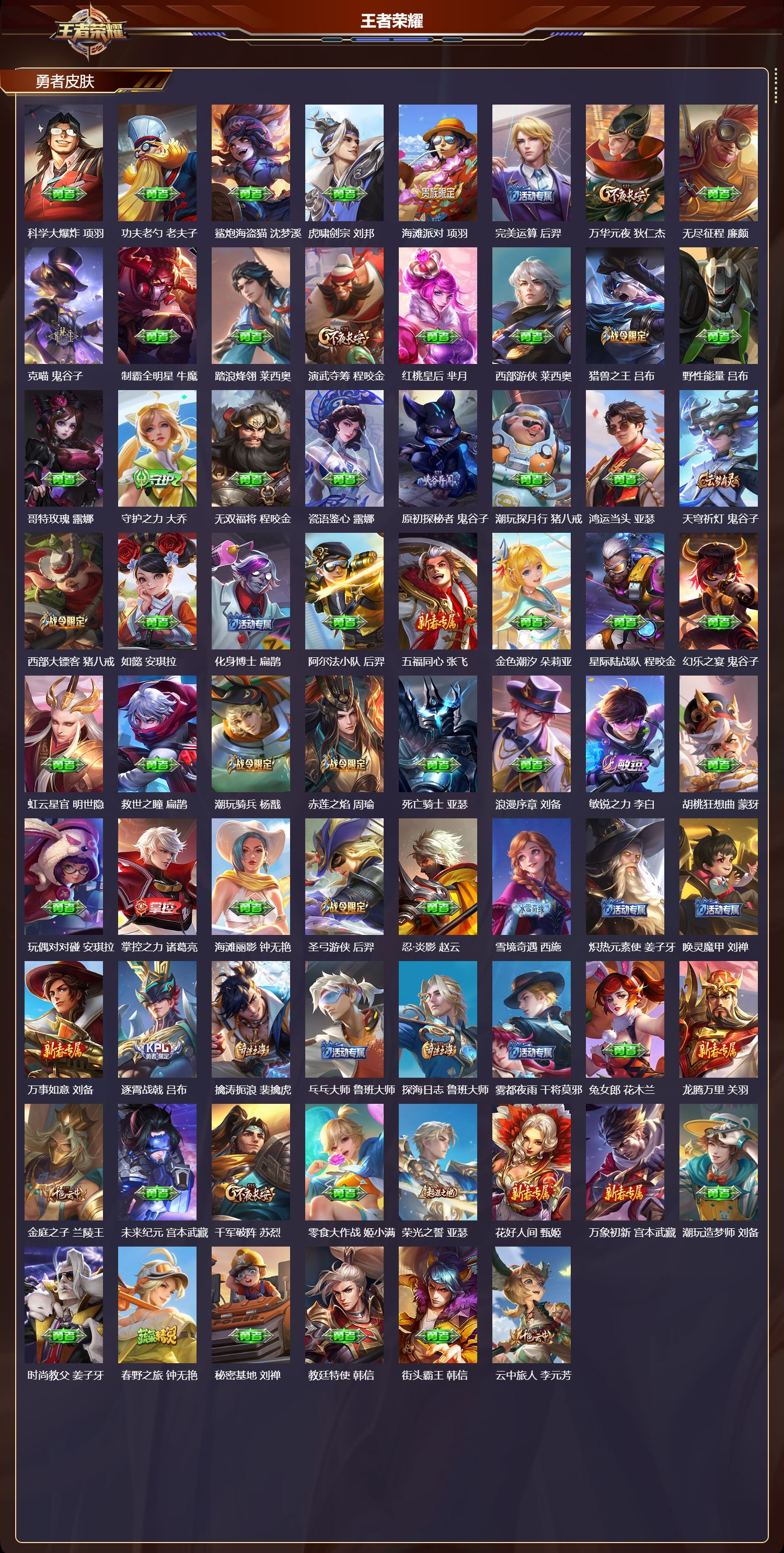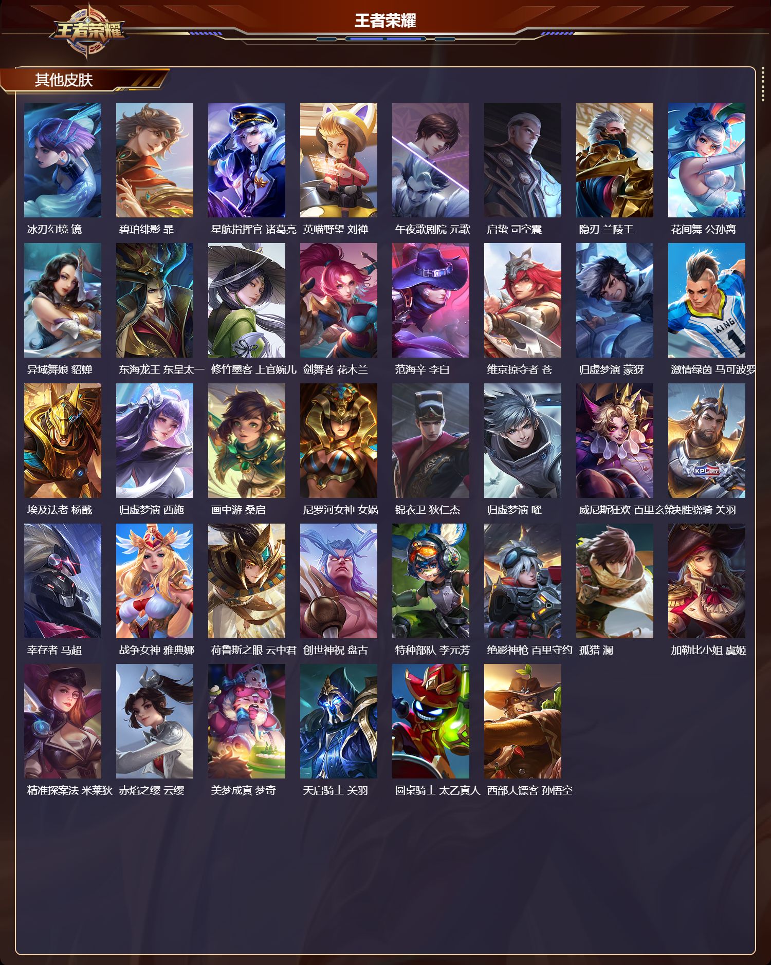 安卓微信/荣耀王者/318皮肤/125英雄/1典藏/0珍品无双/0无双/0珍品传说/14传说/96史诗/9稀有英雄【1 典藏皮肤】弑呛猎影 韩信【14 传说皮肤】启明星使 虞姬碎云 百里守约地狱火 孙悟空云鹰飞将 曜齐天大圣 孙悟空猫影幻舞 貂蝉地狱之眼 宫本武藏霜月吟 露娜一念神魔 李信画中仙 干将莫邪超时空战士 狄仁杰神树通天 后羿幻光神呛 云缨鸣野蒿 桑启【96