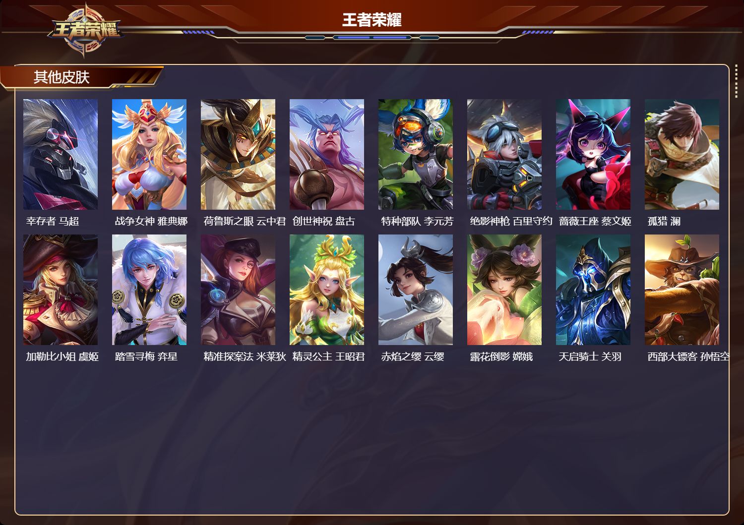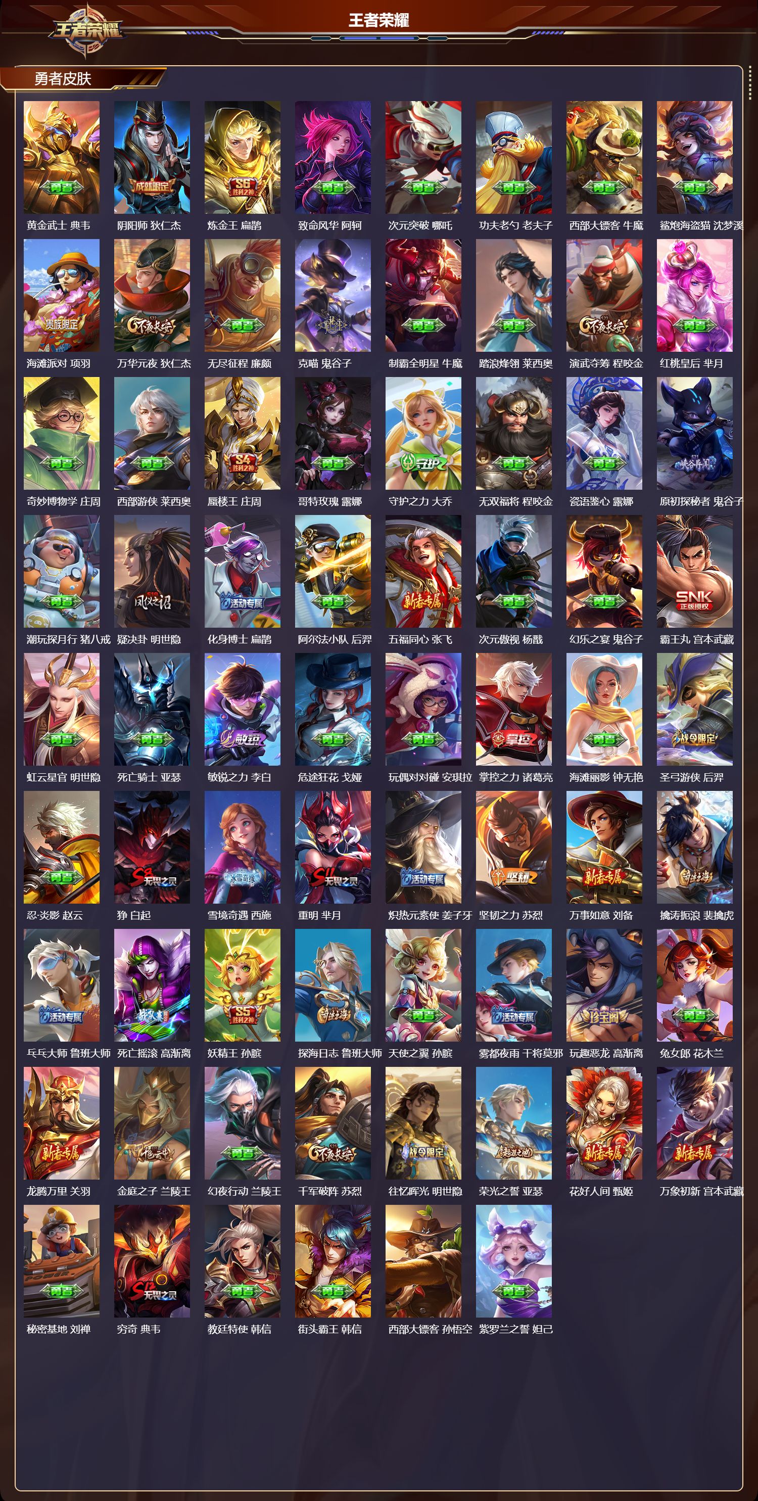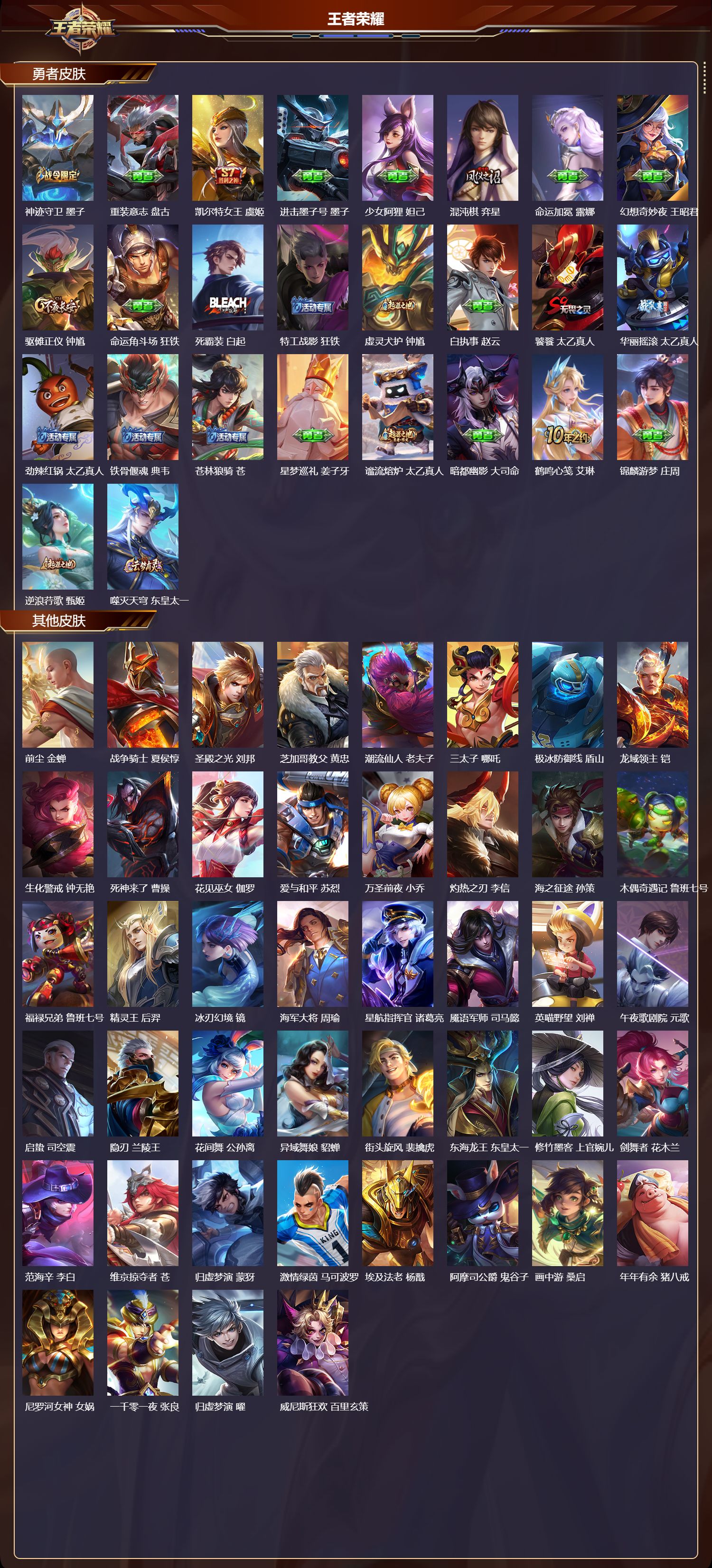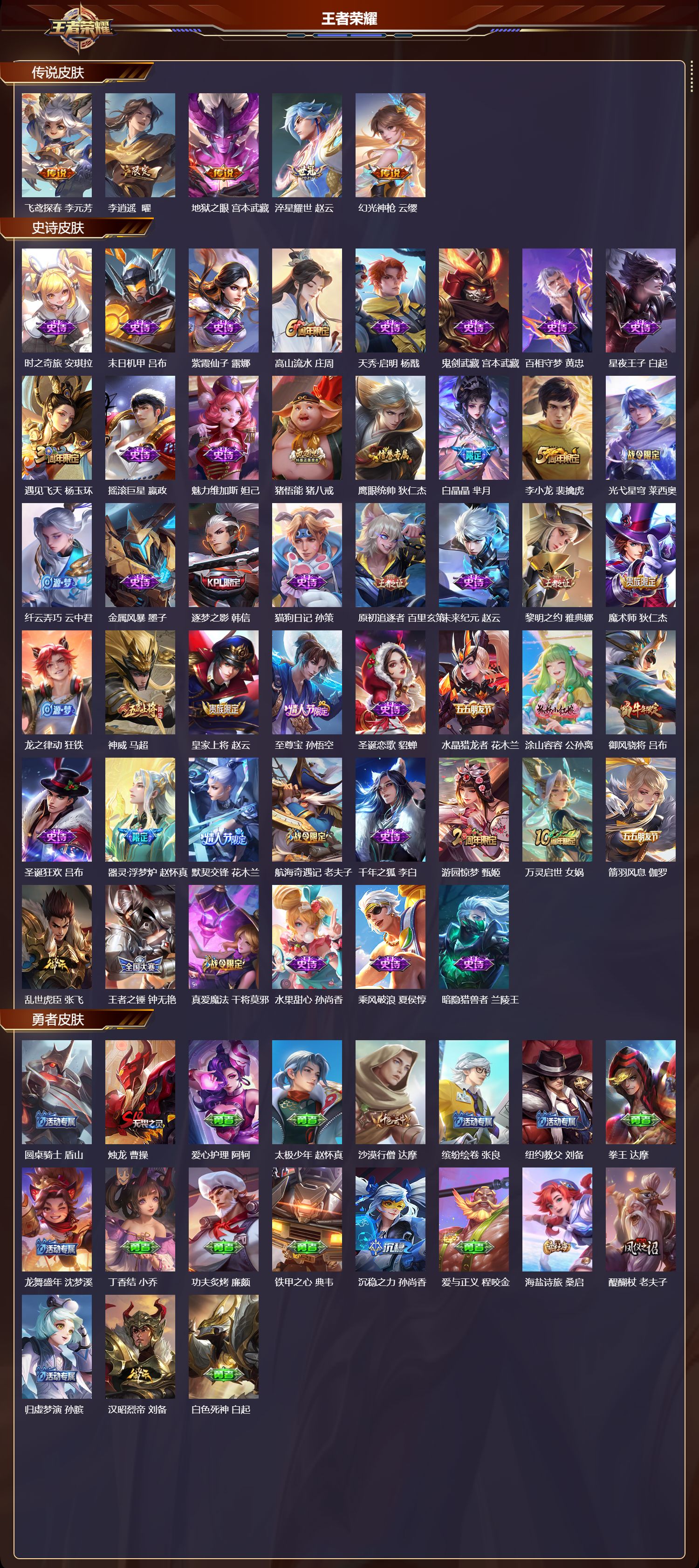 安卓qq/荣耀王者/226皮肤/123英雄/0典藏/0珍品无双/0无双/0珍品传说/5传说/46史诗/7稀有英雄【5 传说皮肤】飞鸢探春 李元芳李 曜地狱之眼 宫本武藏淬星耀世 赵云幻光神呛 云缨【46 史诗皮肤】时之奇旅 安琪拉末日机甲 吕布紫霞仙子 露娜高山流水 庄周天秀·启明 杨戬鬼剑武藏 宫本武藏百相守梦 黄忠星夜王子 白起遇见飞天 杨玉