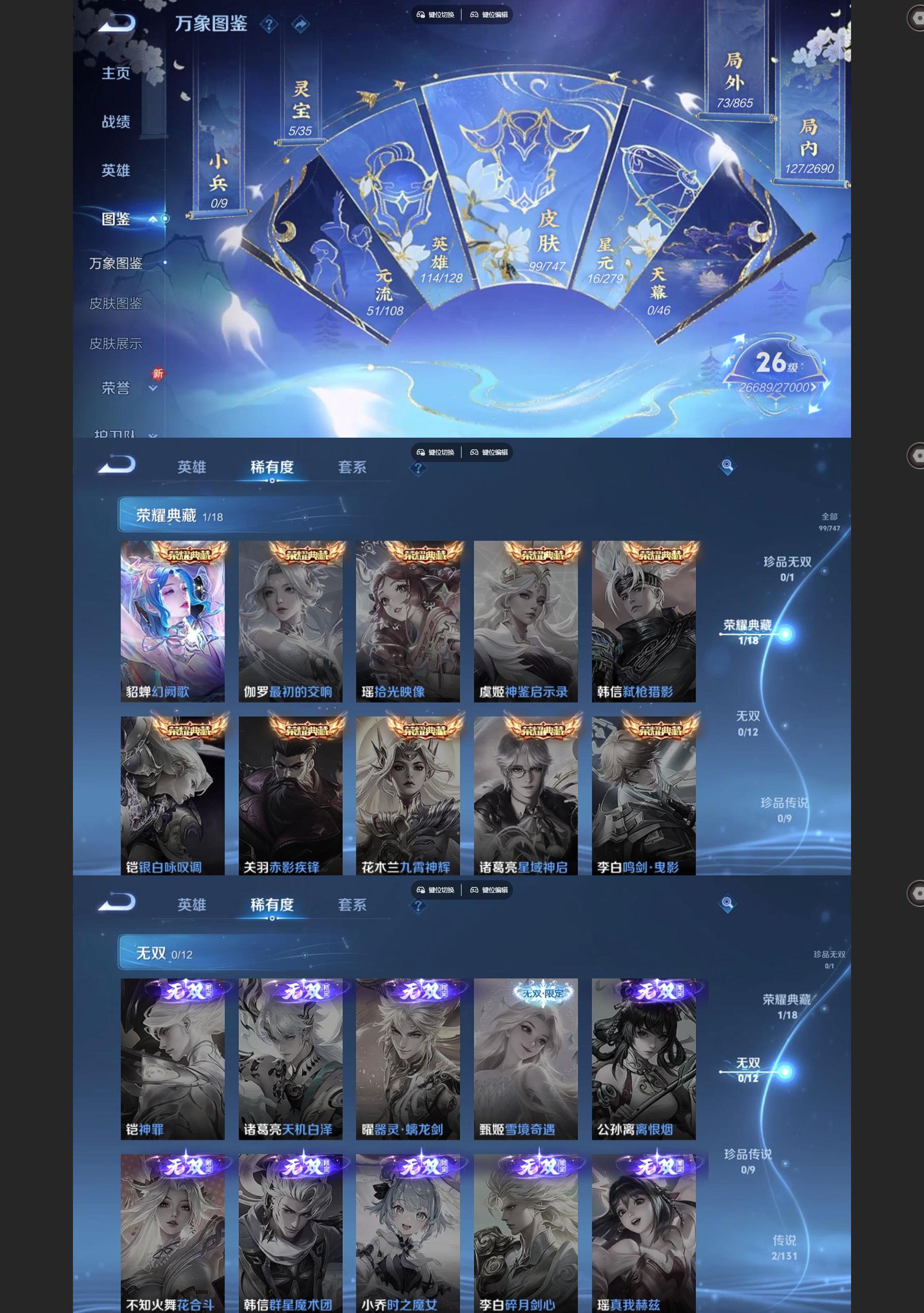 2289427-99皮肤1典藏2传说28史诗23限定- 【典藏】 幻阙歌 【传说】 神树通天 鸣野蒿 【热门】冰冠公主 梁祝 诗语江南 电玩爆裂旋风 暗隐猎兽者 猫狗日记男 猫狗日记女 金属风暴 特工战影 女武神 青蛇 蔷薇恋人 舞动绿茵 紫霞仙子 心灵骇客 圣诞恋歌 圣诞狂欢 天才门将 绅士熊喵 缤纷独角兽 鬼剑武藏 冰雪圆舞曲 群星魔术团程咬金 拳王 女仆咖啡 云中旅人 海盐诗旅 擒