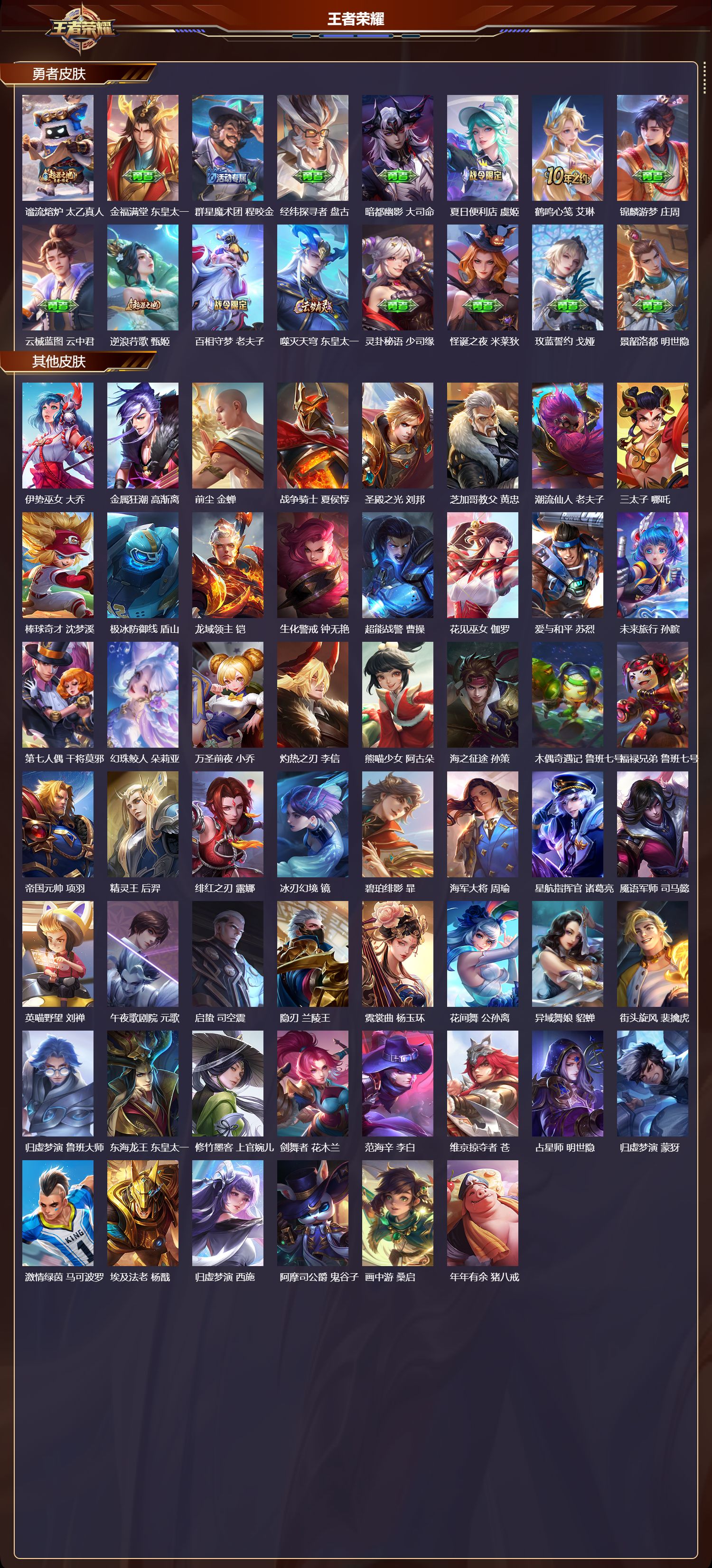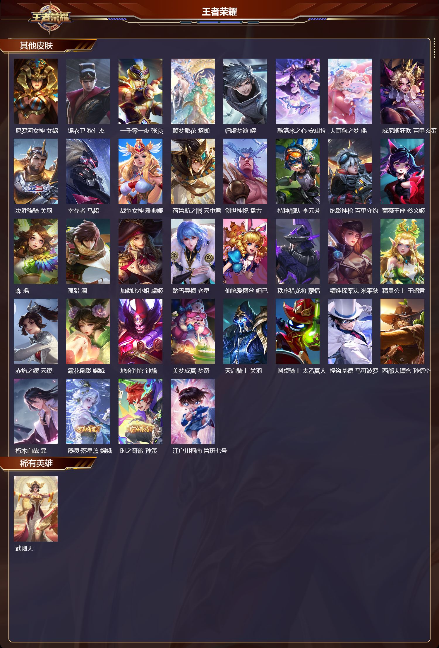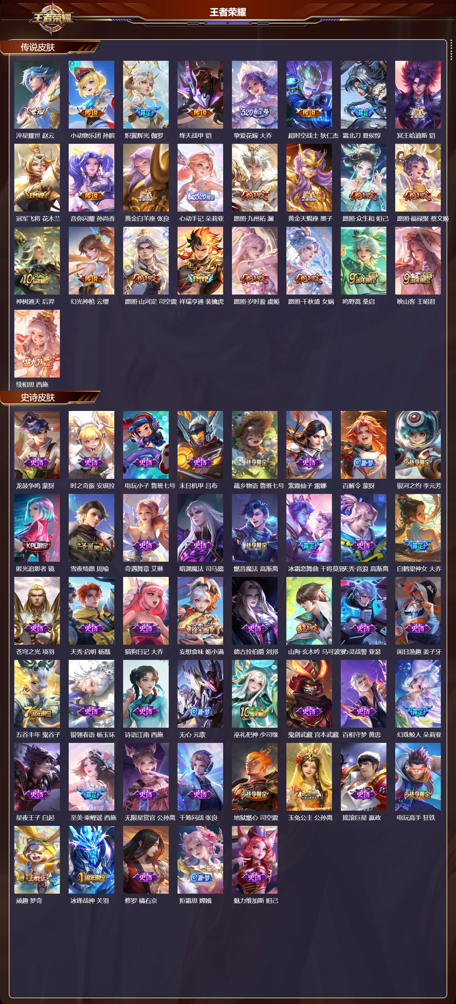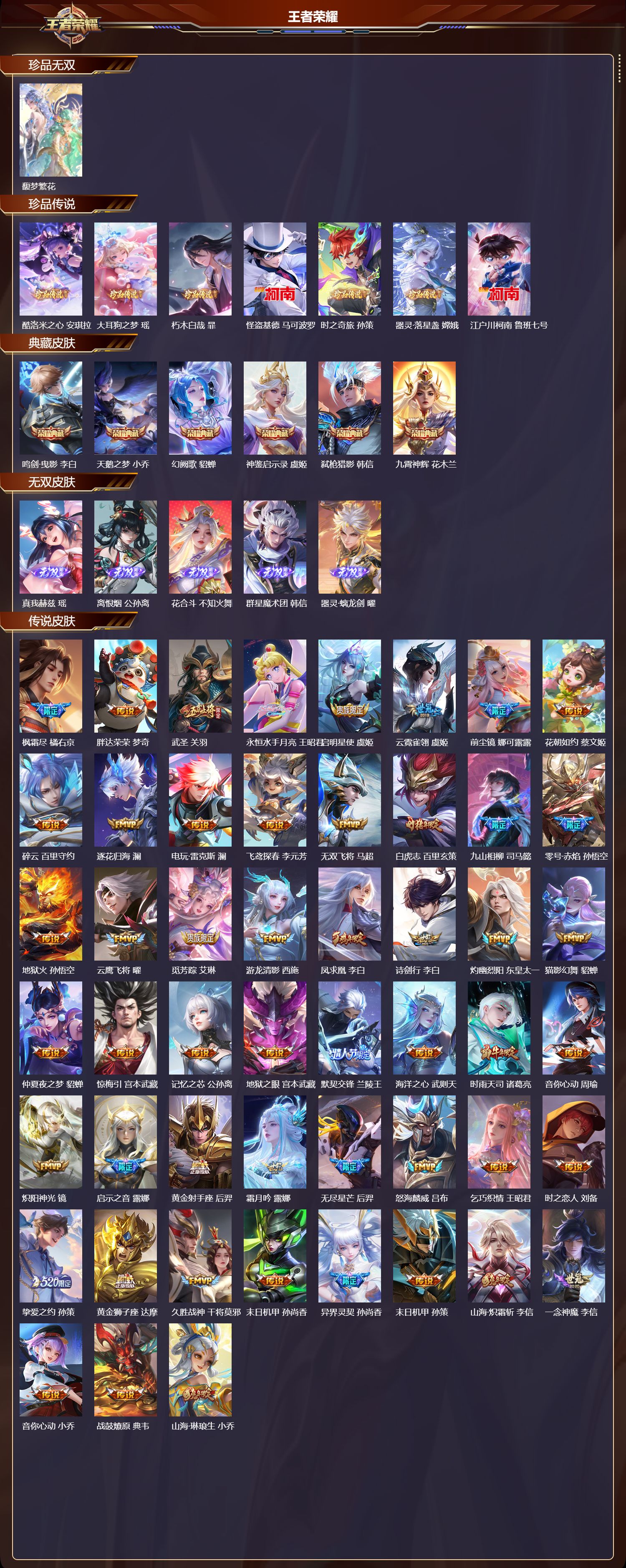 苹果qq/荣耀王者/518皮肤/126英雄/6典藏/1珍品无双/5无双/7珍品传说/76传说/169史诗/10稀有英雄【1 珍品无双】馥梦繁花【7 珍品传说】酷洛米之心 安琪拉大耳狗之梦 瑶朽木白哉 暃怪盗基德 马可波罗时之奇旅 孙策器灵·落星盏 嫦娥江户川柯南 鲁班七号【6 典藏皮肤】鸣剑·曳影 李白天鹅之梦 小乔幻阙歌 貂蝉神鉴启示录 虞姬弑呛猎影