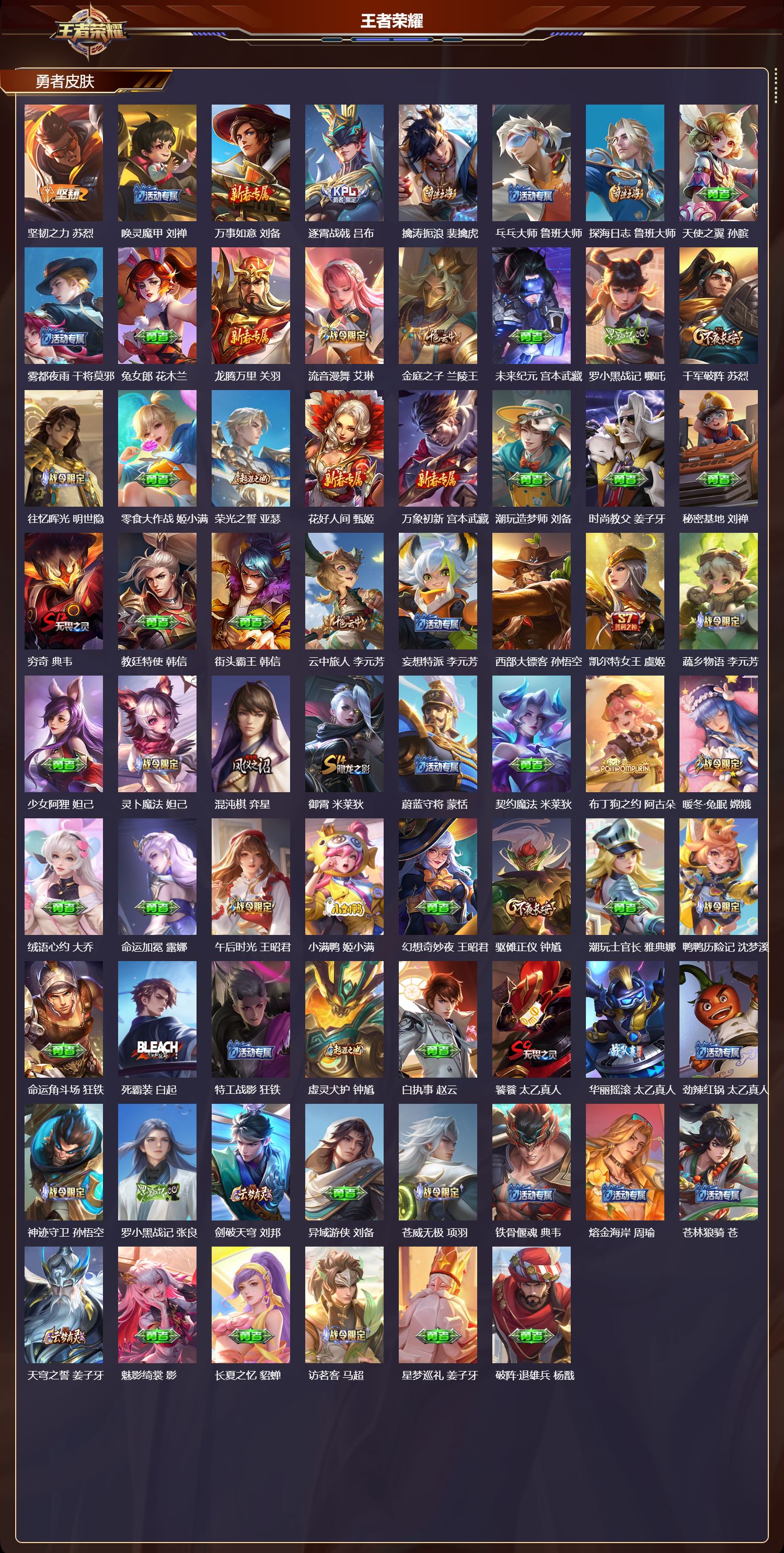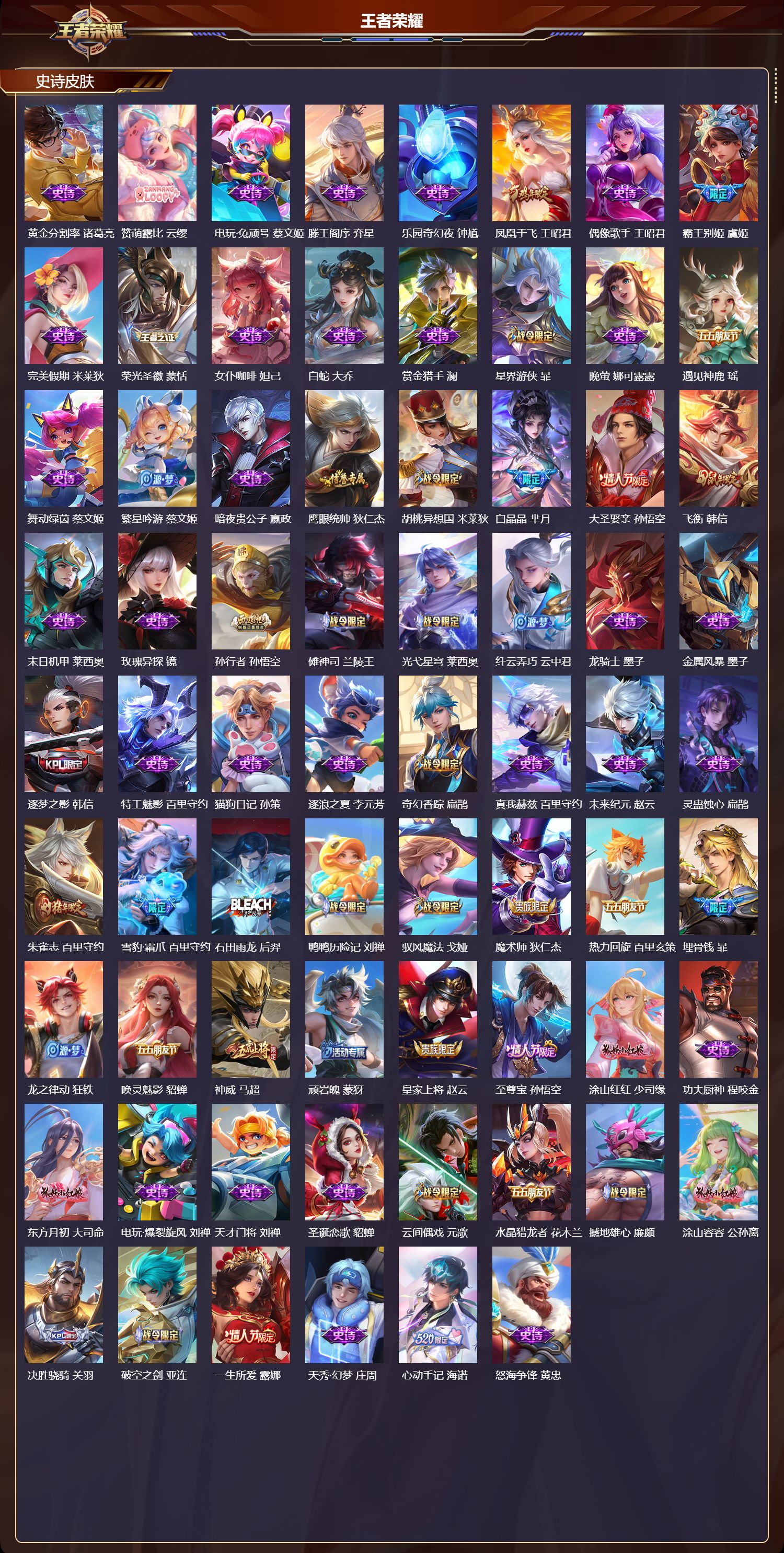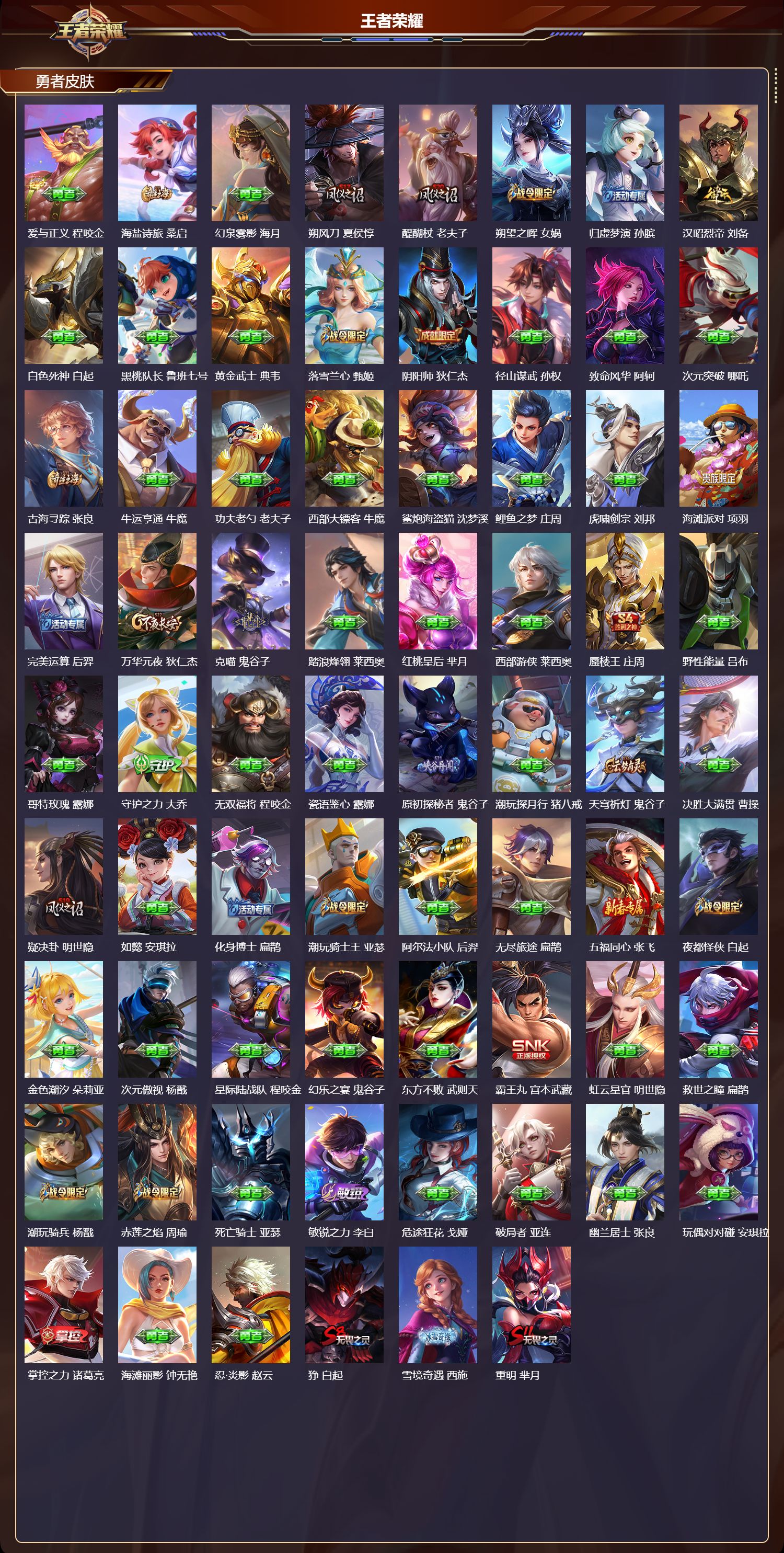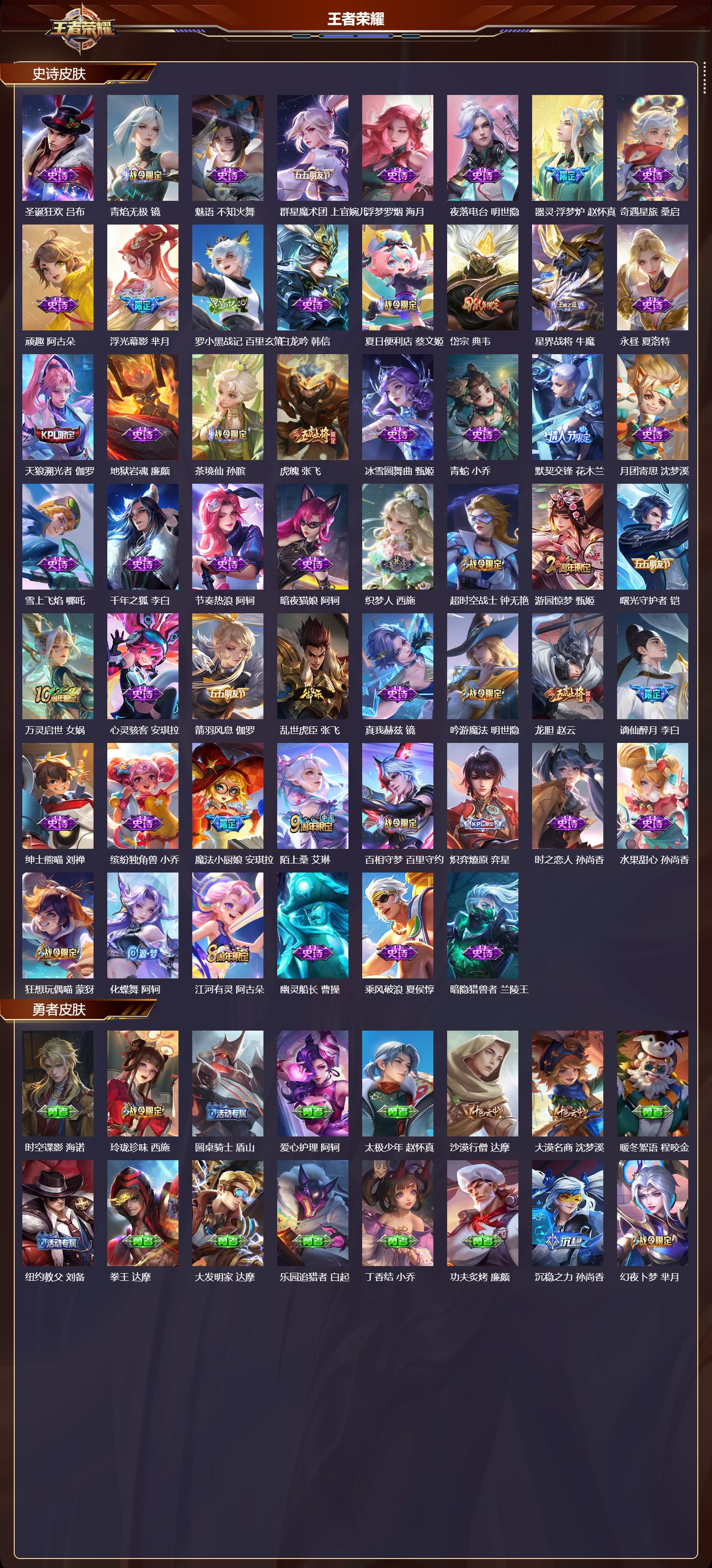 苹果qq/荣耀王者/518皮肤/126英雄/6典藏/1珍品无双/5无双/7珍品传说/76传说/169史诗/10稀有英雄【1 珍品无双】馥梦繁花【7 珍品传说】酷洛米之心 安琪拉大耳狗之梦 瑶朽木白哉 暃怪盗基德 马可波罗时之奇旅 孙策器灵·落星盏 嫦娥江户川柯南 鲁班七号【6 典藏皮肤】鸣剑·曳影 李白天鹅之梦 小乔幻阙歌 貂蝉神鉴启示录 虞姬弑呛猎影