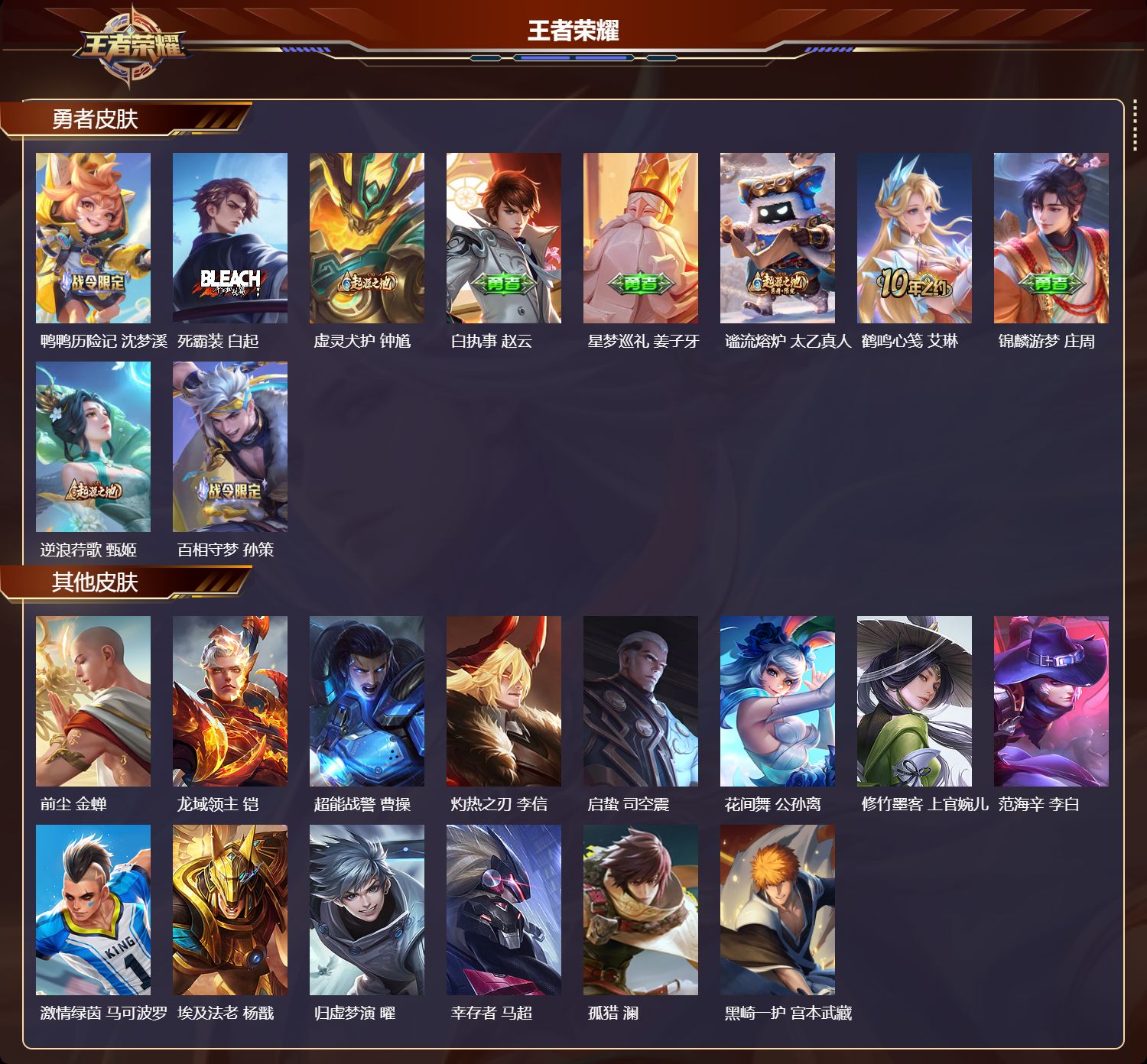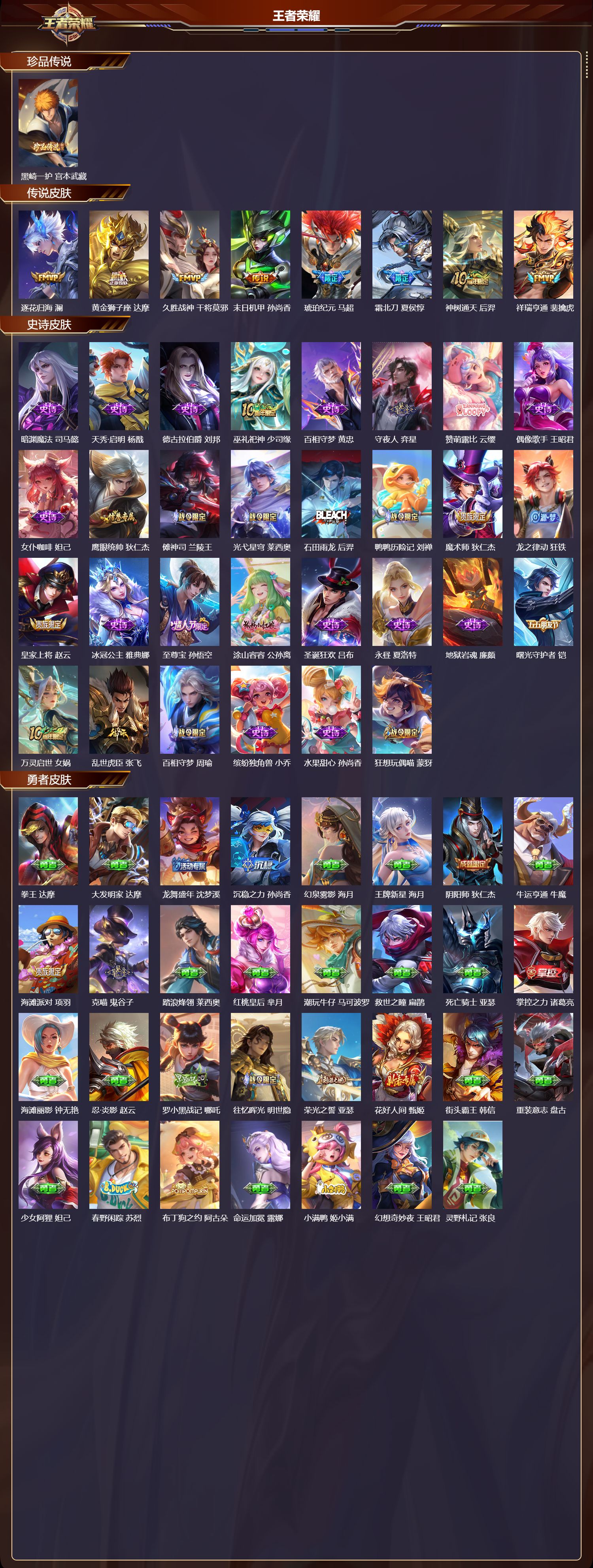 苹果qq/无双王者/94皮肤/109英雄/0典藏/0珍品无双/0无双/1珍品传说/8传说/30史诗/7稀有英雄【1 珍品传说】黑崎一护 宫本武藏【8 传说皮肤】逐花归海 澜黄金狮子座 达摩久胜战神 干将莫邪末日机甲 孙尚香琥珀纪元 马超霜北刀 夏侯惇神树通天 后羿祥瑞亨通 裴擒虎【30 史诗皮肤】暗渊魔法 司马懿天秀·启明 杨戬德古拉伯爵 刘邦巫礼祀神 少司缘百相守梦 黄