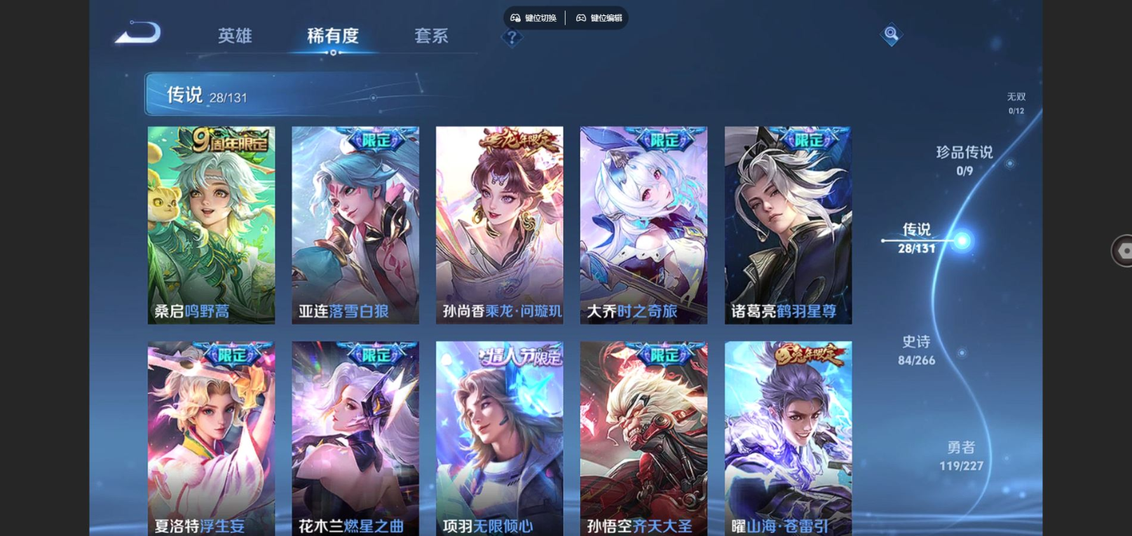 127英雄-312皮肤-125英雄-312皮肤v9-2典藏28传说 2星传说 星际治安官 金色仲夏夜 【全皮英雄】 李信全皮 影全皮 【典藏】 无限飓风号 鸣剑曳影 【传说】 落雪白狼 乘龙问璇玑 鸣野蒿 鹤羽星尊 启明星使 时雨天司 祈雪灵祝 山海苍雷引 山海炽霜斩 零号赤焰 齐天大圣 默契交锋男 燃星之曲 浮生妄 时之奇旅大乔 无限倾心男 乞巧织情 音你心动男 诗剑行 炽阳神光 云鹰飞将 冠军
