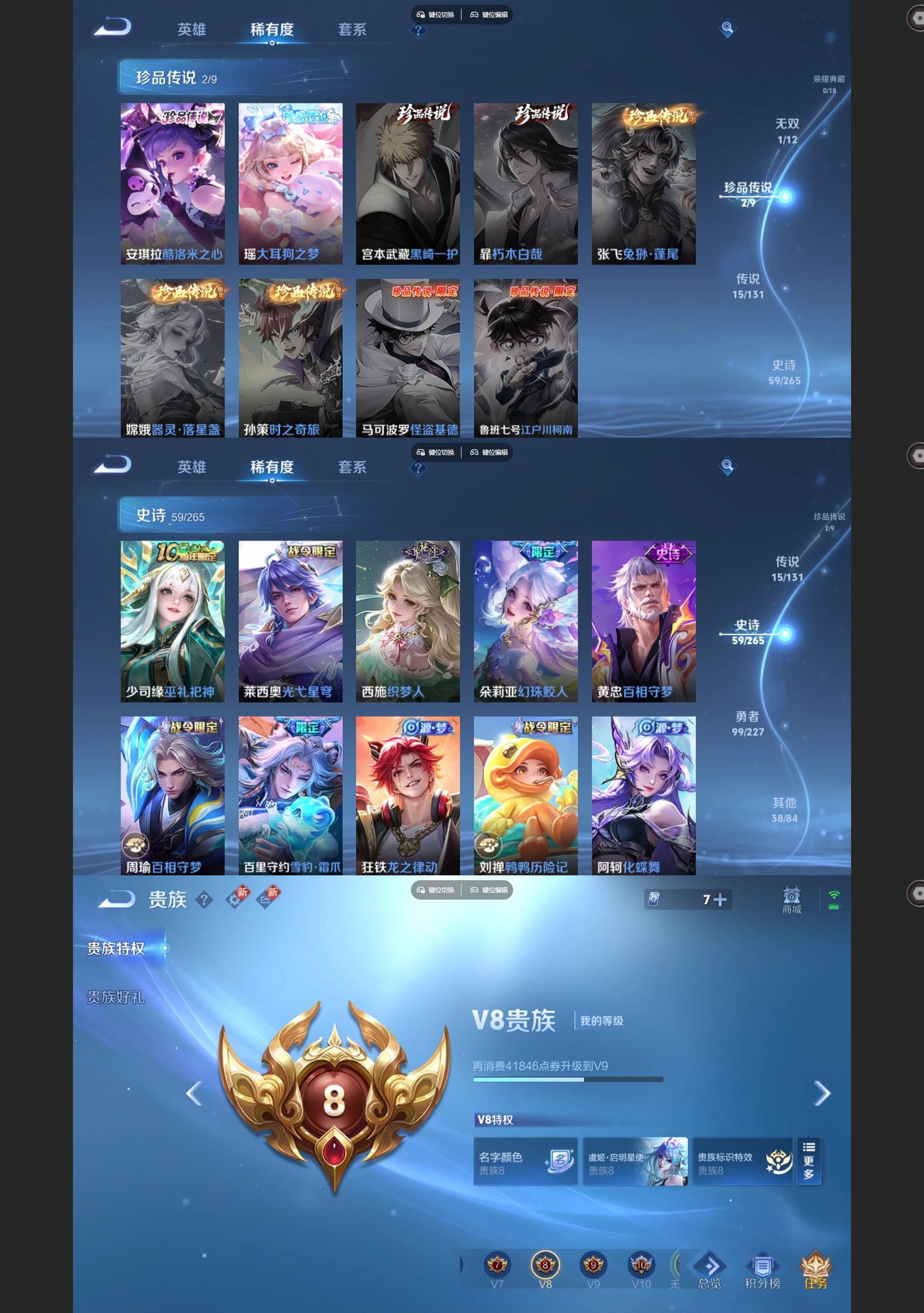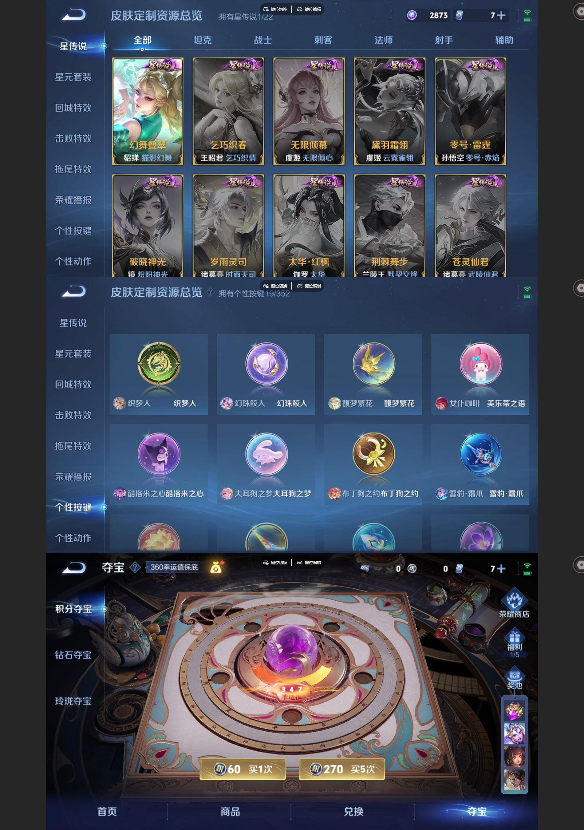 2289675-v8-215皮肤1珍品无双1无双2珍品传说15传说1星元59史诗81限定2873紫星币 347幸运值 【全皮英雄】 西施全皮 影全皮 【珍品无双】 馥梦繁花 【无双】 真我赫兹瑶 【珍品传说】 大耳狗之梦 酷洛米之心 【星元】 幻舞叠翠 【传说】 续相思 幻光神呛 愿照岁时盈 愿照众生和 愿照九州拓 愿照福禄聚 鸣野蒿 启明星使 山海琳琅生 时之奇旅大乔 游龙