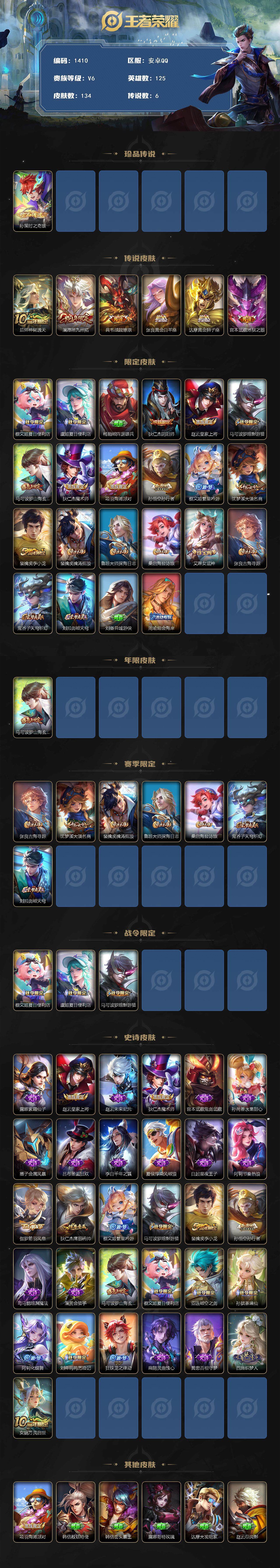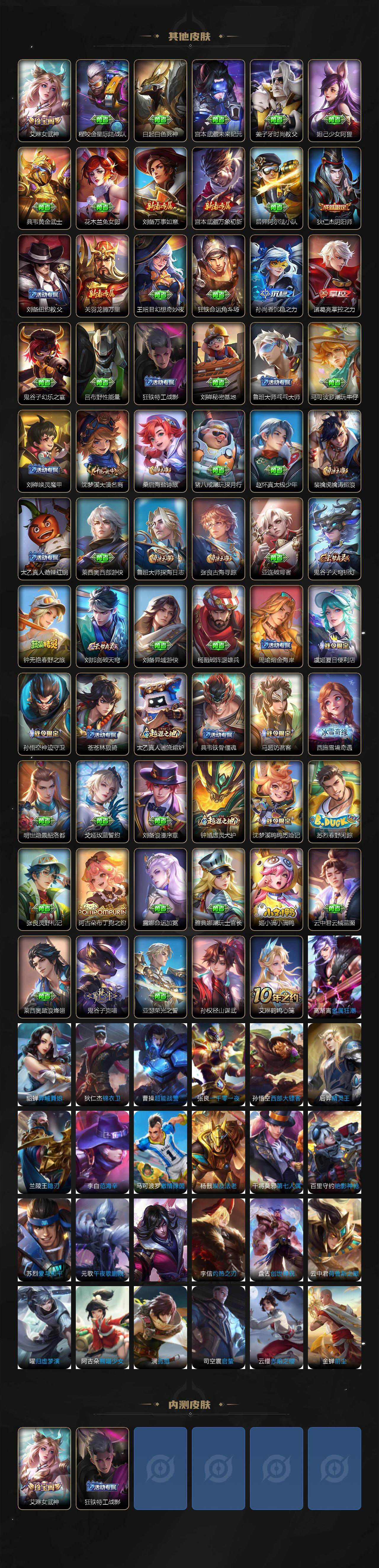 125英雄-134皮肤-贵族6/皮肤134/传说6/史诗31/英雄125/孙权全皮/时之奇旅 孙策/神树通天 后羿/愿照·九州拓 澜/战鼓燎原 典韦/黄金白羊座 张良/黄金狮子座 达摩/地狱之眼 宫本武藏/夏日便利店 蔡文姬/夏日便利店 虞姬/破阵·退雄兵 杨戬/阴阳师 狄仁杰/皇家上将 赵云/暗影游猎 马可波罗/山海·玄木吟 马可波罗/魔术师 狄仁杰/海滩派对 项羽/孙行者 孙悟空/繁星吟游 蔡文姬/大漠名商 沈梦