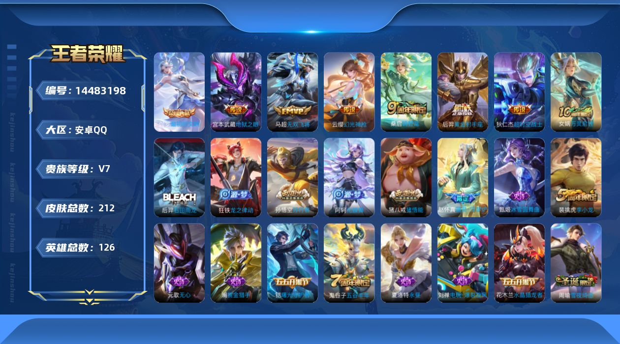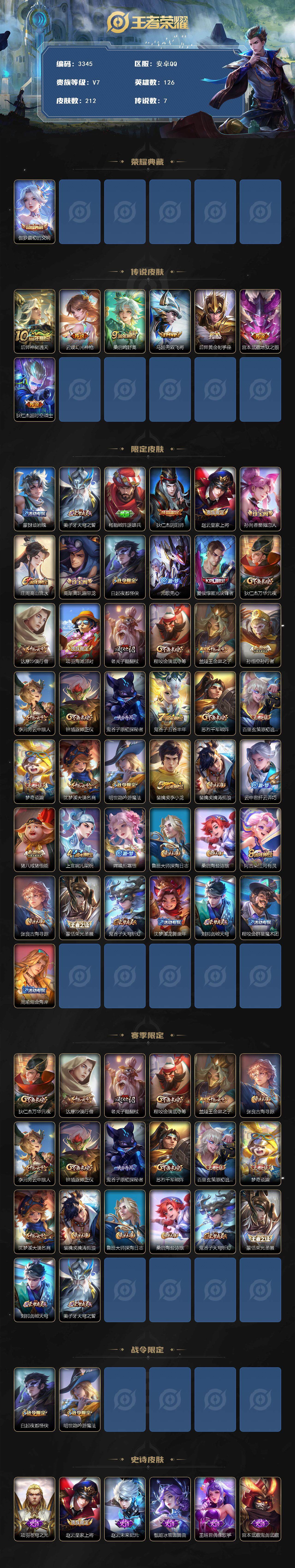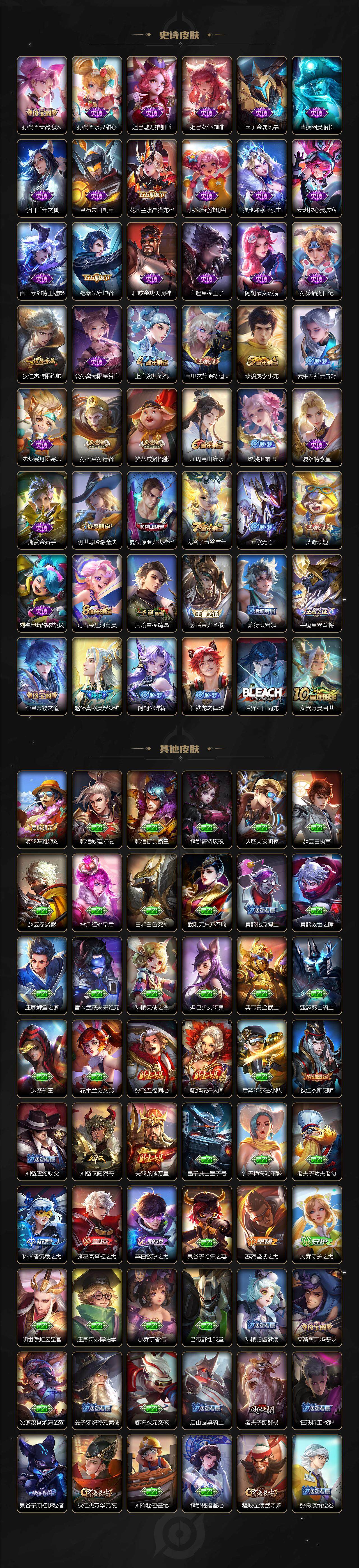 [14483198]安卓q-v0-荣耀黄金ii段位-126英雄-212皮肤-1典藏皮肤-7传说-54史诗 【英雄全皮】:影全皮 【荣耀典藏】:伽罗最初的交响 【传说皮肤】:后羿神树通天,云缨幻光神呛,桑启鸣野蒿,马超无双飞将,后羿黄金射手座,宫本武藏地狱之眼,狄仁杰超时空战士 【限定皮肤】:蒙犽顽岩魄,姜子牙天穹之誓,杨戬破阵退雄兵,狄仁杰阴阳师,赵云皇家上将,孙尚香蔷薇恋人,庄周高山流水,高渐离玩趣恶龙,白起夜都怪侠,元歌无心,夏侯惇匿光决锋者,狄仁杰万华元夜,达摩沙漠行僧,项羽海滩派对,老夫子醍醐杖,程咬金演武夺筹,兰陵王金庭之子,孙悟空孙行者,李元芳云中旅人,钟馗驱傩正仪,鬼谷子原初探秘者,鬼谷子五谷丰年,苏烈千军破阵,百里玄策原初追逐者,梦奇顽趣,沈梦溪大漠名商,明世隐吟游魔法,裴擒虎李小龙,裴擒虎擒涛扼浪,云中君纤云弄巧,猪八戒猪悟能,上官婉儿梁祝,嫦娥拒霜思,鲁班大师探海日志,桑启海盐诗旅,阿古朵江河有灵,张良古海寻踪,蒙恬荣光圣徽,鬼谷子天穹祈灯,沈梦溪龙舞盛年,刘邦剑破天穹,程咬金群星魔术团,周瑜熔金海岸 【赛季限定】:狄仁杰万华元夜,达摩沙漠行僧,老夫子醍醐杖,程咬金演武夺筹,兰陵王金庭之子,张良古海寻踪,李元芳云中旅人,钟馗驱傩正仪,鬼谷子原初探秘者,苏烈千军破阵,百里玄策原初追逐者,梦奇顽趣,沈梦溪大漠名商,裴擒虎擒涛扼浪,鲁班大师探海日志,桑启海盐诗旅,鬼谷子天穹祈灯,蒙恬荣光圣徽,刘邦剑破天穹,姜子牙天穹之誓 【战令限定】:白起夜都怪侠,明世隐吟游魔法 【史诗皮肤】:项羽苍穹之光,赵云皇家上将,赵云未来纪元,甄姬冰雪圆舞曲,王昭君偶像歌手,宫本武藏鬼剑武藏,孙尚香蔷薇恋人,孙尚香水果甜心,妲己魅力维加斯,妲己女仆咖啡,墨子金属风暴,曹操幽灵船长,李白千年之狐,吕布末日机甲,花木兰水晶猎龙者,小乔缤纷独角兽,雅典娜冰冠公主,安琪拉心灵骇客,百里守约特工魅影,铠曙光守护者,程咬金功夫厨神,白起星夜王子,阿轲节奏热浪,孙策猫狗日记,狄仁杰鹰眼统帅,公孙离无限星赏官,上官婉儿梁祝,百里玄策原初追逐者,裴擒虎李小龙,云中君纤云弄巧,沈梦溪月团寄思,孙悟空孙行者,猪八戒猪悟能,庄周高山流水,嫦娥拒霜思,夏洛特永昼,澜赏金猎手,明世隐吟游魔法,夏侯惇匿光决锋者,鬼谷子五谷丰年,元歌无心,梦奇顽趣,刘禅电玩爆裂旋风,阿古朵江河有灵,周瑜雪夜绮愿,蒙恬荣光圣徽,蒙犽顽岩魄,牛