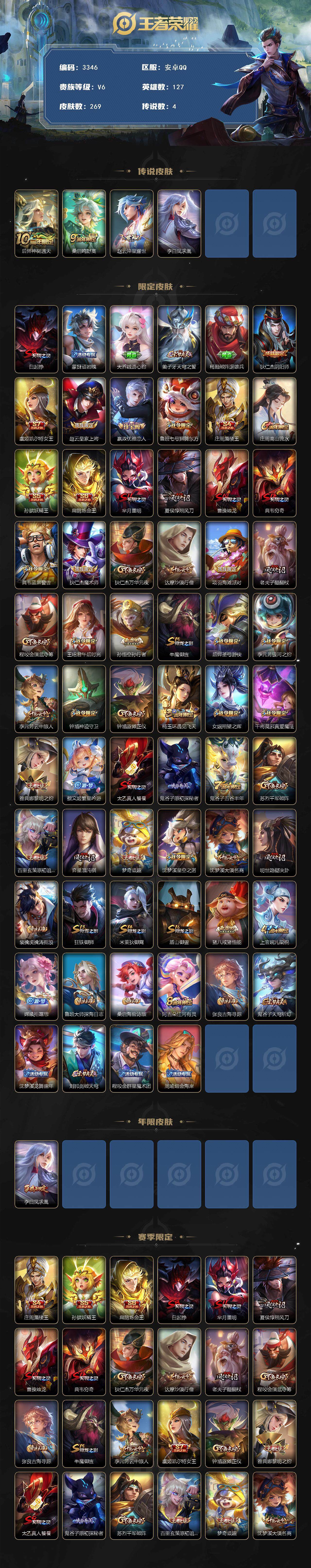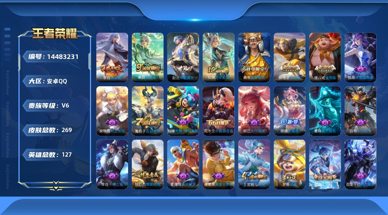 [14483231]安卓q-v6-至尊星耀i段位-127英雄-269皮肤-4传说-53史诗 【英雄全皮】:鬼谷子全皮 【传说皮肤】:后羿神树通天,桑启鸣野蒿,赵云淬星耀世,李白凤求凰 【限定皮肤】:白起狰,蒙犽顽岩魄,大乔绒语心约,姜子牙天穹之誓,杨戬破阵退雄兵,狄仁杰阴阳师,虞姬凯尔特女王,赵云皇家上将,嬴政优雅恋人,鲁班七号狮舞东方,庄周蜃楼王,庄周高山流水,孙膑妖精王,扁鹊炼金王,芈月重明,夏侯惇朔风刀,曹操烛龙,典韦穷奇,典韦蓝屏警告,狄仁杰魔术师,狄仁杰万华元夜,达摩沙漠行僧,项羽海滩派对,老夫子醍醐杖,程咬金演武夺筹,王昭君午后时光,孙悟空孙行者,牛魔御旌,后羿圣弓游侠,李元芳银河之约,李元芳云中旅人,钟馗神迹守卫,钟馗驱傩正仪,杨玉环遇见飞天,女娲朔望之晖,干将莫邪真爱魔法,雅典娜黎明之约,蔡文姬繁星吟游,太乙真人饕餮,鬼谷子原初探秘者,鬼谷子五谷丰年,苏烈千军破阵,百里玄策原初追逐者,弈星混沌棋,梦奇顽趣,沈梦溪星空之诺,沈梦溪大漠名商,明世隐疑决卦,裴擒虎擒涛扼浪,狂铁御狮,米莱狄御霄,盾山御銮,猪八戒猪悟能,上官婉儿梁祝,嫦娥拒霜思,鲁班大师探海日志,桑启海盐诗旅,阿古朵江河有灵,张良古海寻踪,鬼谷子天穹祈灯,沈梦溪龙舞盛年,刘邦剑破天穹,程咬金群星魔术团,周瑜熔金海岸 【年限皮肤】:李白凤求凰 【赛季限定】:庄周蜃楼王,孙膑妖精王,扁鹊炼金王,白起狰,芈月重明,夏侯惇朔风刀,曹操烛龙,典韦穷奇,狄仁杰万华元夜,达摩沙漠行僧,老夫子醍醐杖,程咬金演武夺筹,张良古海寻踪,牛魔御旌,李元芳云中旅人,虞姬凯尔特女王,钟馗驱傩正仪,雅典娜黎明之约,太乙真人饕餮,鬼谷子原初探秘者,苏烈千军破阵,百里玄策原初追逐者,弈星混沌棋,梦奇顽趣,沈梦溪大漠名商,明世隐疑决卦,裴擒虎擒涛扼浪,狂铁御狮,米莱狄御霄,盾山御銮,鲁班大师探海日志,桑启海盐诗旅,鬼谷子天穹祈灯,刘邦剑破天穹,姜子牙天穹之誓 【战令限定】:鲁班七号狮舞东方,典韦蓝屏警告,王昭君午后时光,后羿圣弓游侠,李元芳银河之约,钟馗神迹守卫,女娲朔望之晖,干将莫邪真爱魔法,沈梦溪星空之诺 【史诗皮肤】:项羽苍穹之光,赵云皇家上将,貂蝉圣诞恋歌,甄姬冰雪圆舞曲,王昭君偶像歌手,狄仁杰魔术师,廉颇地狱岩魂,宫本武藏鬼剑武藏,孙尚香水果甜心,嬴政优雅恋人,嬴政摇滚巨星,妲己女仆咖啡,墨子金属风暴,刘禅绅士熊喵,曹操幽灵船长,李白