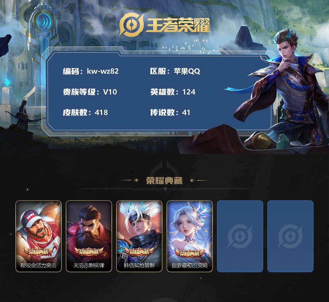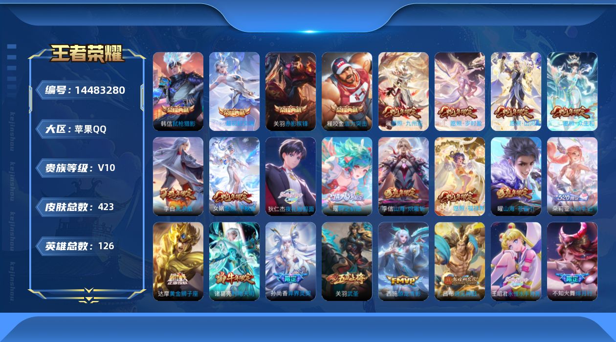[14483280]苹果q-v10-最强王者段位-124英雄-418皮肤-4典藏-0珍品无双-0无双-0珍品传说-41传说-127史诗 【荣耀典藏】:程咬金活力突击,关羽赤影疾锋,韩信弑呛猎影,伽罗最初的交响 【传说皮肤】:司空震愿照山河定,女娲愿照千秋盛,妲己愿照众生和,澜愿照九州拓,蔡文姬愿照福禄聚,虞姬愿照岁时盈,云缨幻光神呛,桑启鸣野蒿,朵莉亚心动手记,艾琳觅芳踪,狄仁杰夜礼服假面,王昭君永恒水手月亮,吕布遇见神鼓,宫本武藏惊梅引,马可波罗妄想实况,东皇太一灼幽烈阳,小乔山海琳琅生,曜山海苍雷引,李信山海炽霜斩,李白诗剑行,狄仁杰神器狴犴令,不知火舞绯月行,王昭君星穹之声,孙策挚爱之约,瑶时之祈愿,鲁班七号寅虎瑞焰,孙尚香异界灵契,西施游龙清影,周瑜音你心动,小乔音你心动,诸葛亮时雨天司,虞姬启明星使,孙悟空零号赤焰,关羽武圣,貂蝉猫影幻舞,干将莫邪久胜战神,虞姬云霓雀翎,达摩黄金狮子座,后羿黄金射手座,李白凤求凰,狄仁杰超时空战士 【限定皮肤】:蔡文姬夏日便利店,大乔绒语心约,虞姬夏日便利店,姜子牙天穹之誓,杨戬破阵退雄兵,狄仁杰阴阳师,廉颇寅虎御盾,小乔山海琳琅生,赵云皇家上将,赵云龙胆,墨子神迹守卫,墨子降魔,妲己时之彼端,妲己时之奇旅,孙尚香异界灵契,鲁班七号狮舞东方,鲁班七号寅虎瑞焰,庄周高山流水,高渐离玩趣恶龙,阿轲迷踪丽影,钟无艳超时空战士,扁鹊奇幻香踪,芈月重明,芈月幻夜卜梦,吕布猎兽之王,吕布遇见神鼓,周瑜赤莲之焰,元歌云间偶戏,元歌无心,夏侯惇朔风刀,甄姬游园惊梦,甄姬落雪兰心,曹操烛龙,典韦穷奇,马可波罗逐梦之星,马可波罗暗影游猎,马可波罗山海玄木吟,马可波罗妄想实况,狄仁杰魔术师,狄仁杰万华元夜,狄仁杰神器狴犴令,达摩星际陆战队,达摩沙漠行僧,项羽海滩派对,老夫子醍醐杖,关羽冰锋战神,关羽武圣,貂蝉逐梦之音,安琪拉魔法小厨娘,程咬金演武夺筹,刘邦夺宝奇兵,王昭君午后时光,王昭君星穹之声,兰陵王驯魔猎人,兰陵王金庭之子,花木兰默契交锋,不知火舞绯月行,亚瑟潮玩骑士王,孙悟空至尊宝,孙悟空零号赤焰,孙悟空孙行者,牛魔御旌,李元芳银河之约,李元芳云中旅人,虞姬启明星使,钟馗驱傩正仪,杨玉环遇见飞天,杨戬潮玩骑兵,干将莫邪胡桃夹子,雅典娜单词大作战,蔡文姬繁星吟游,太乙真人饕餮,鬼谷子原初探秘者,鬼谷子五谷丰年,诸葛亮时雨天司,黄忠火炮绅士,铠青龙志,百里守约