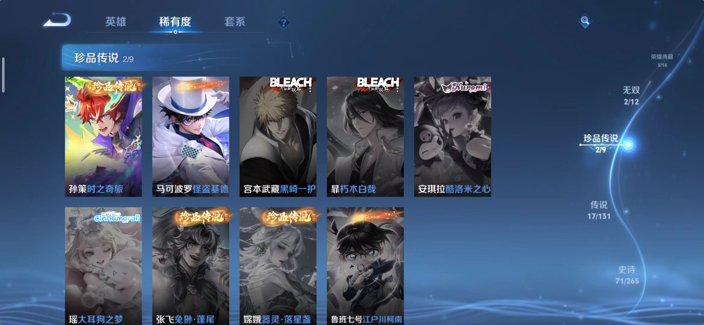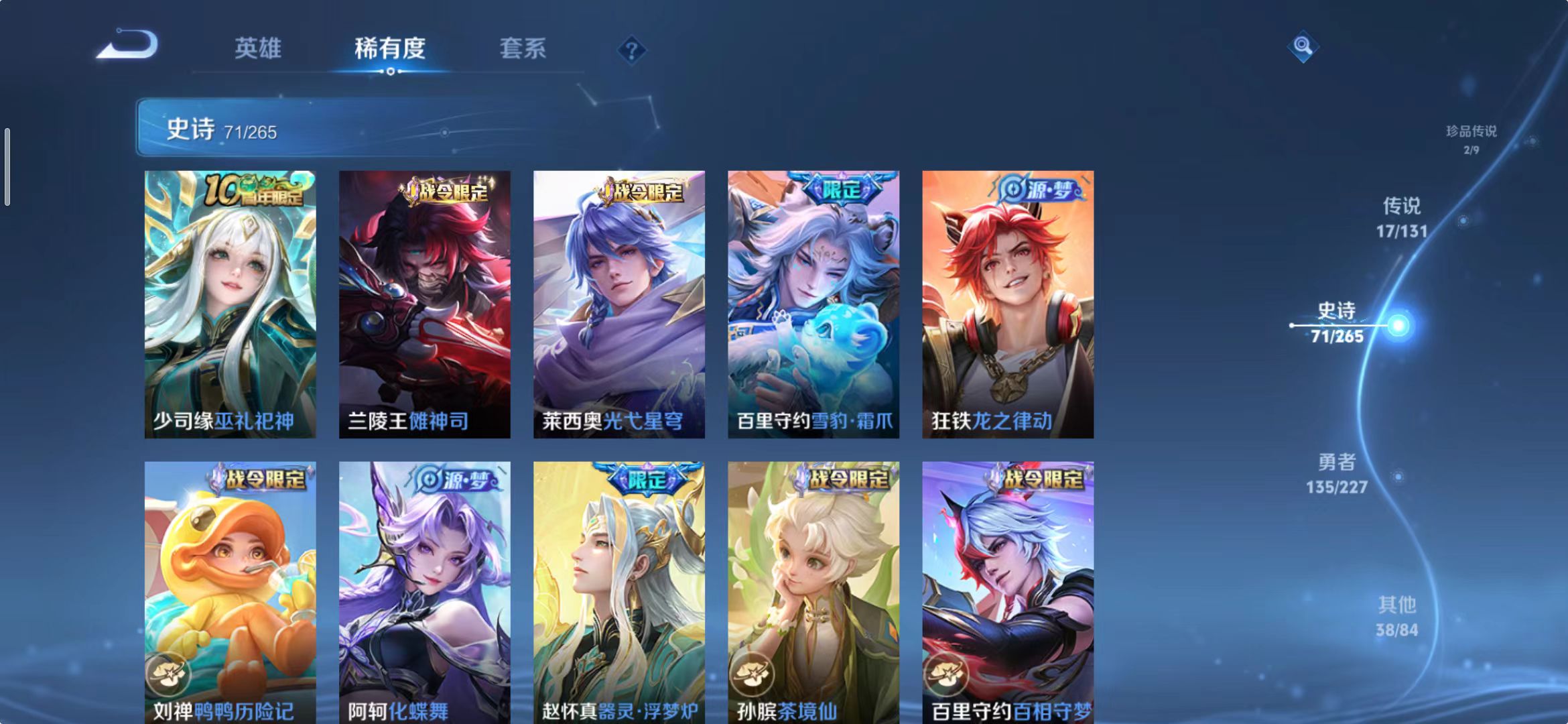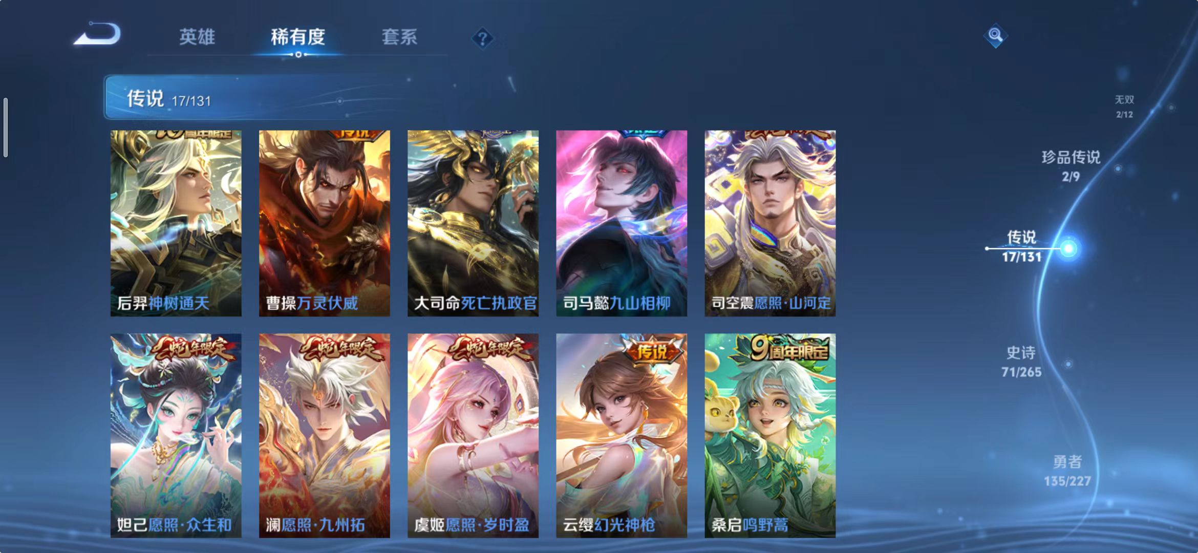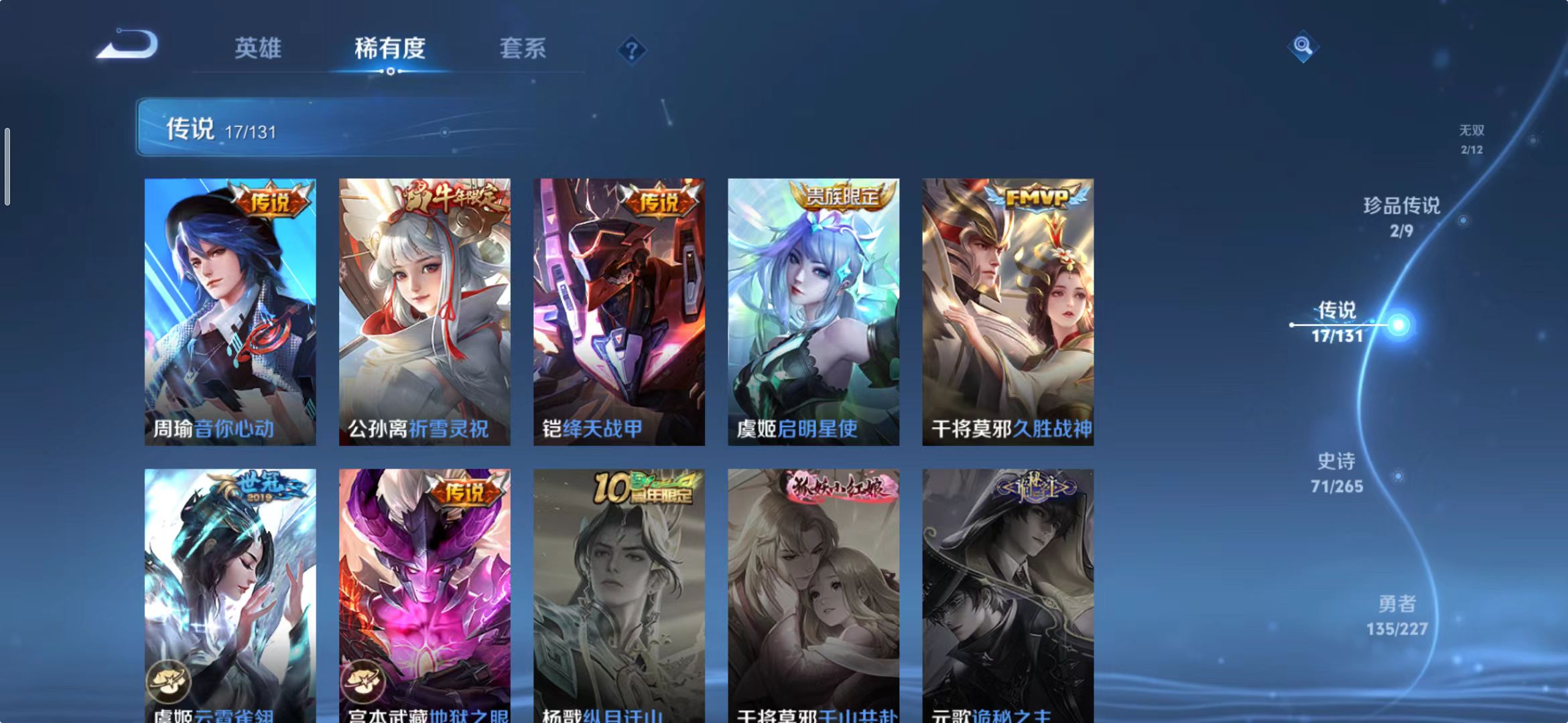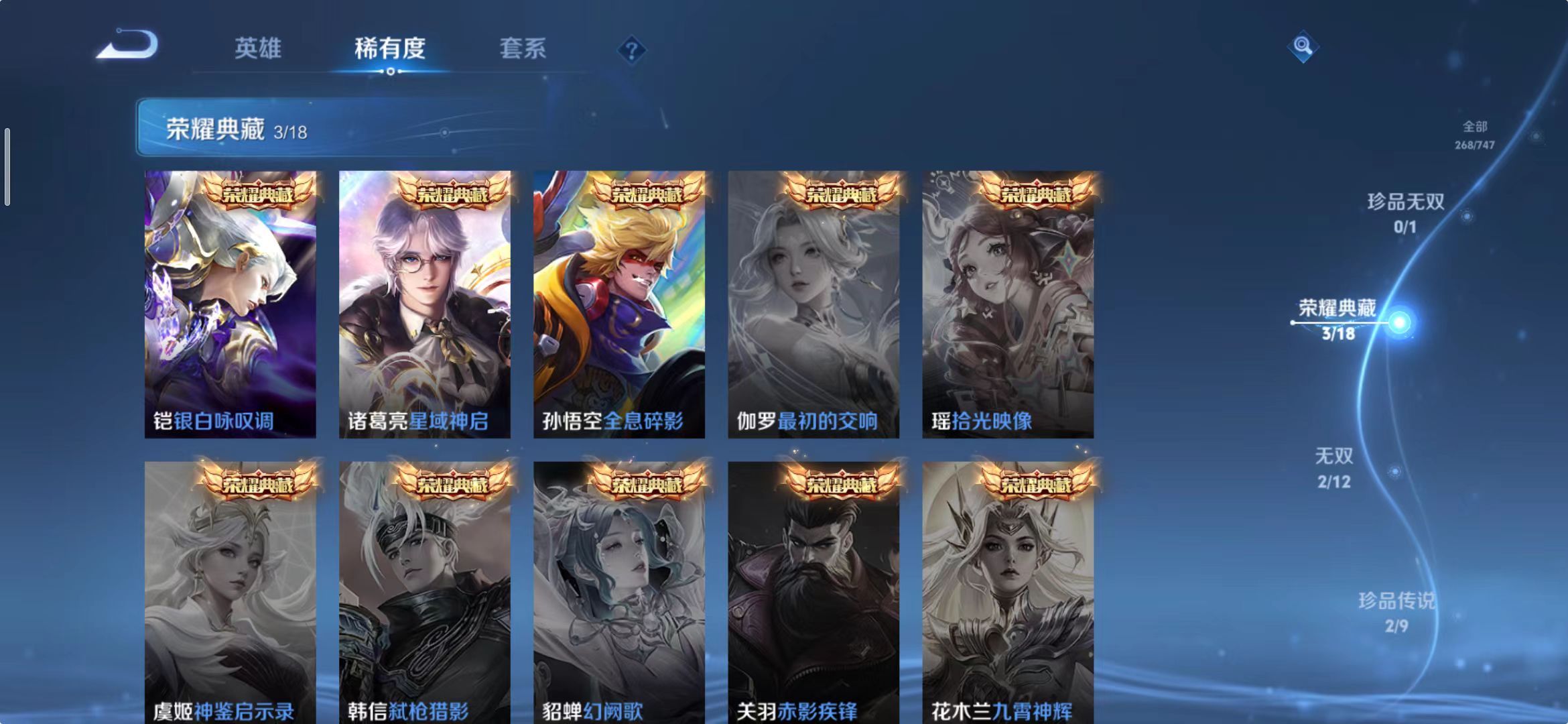 [14483860]wz2050,安卓q,总皮268,典藏3,无双2,珍品传说2,传说17。铠银白咏叹调,铠神罪。公孙离祈雪灵祝。