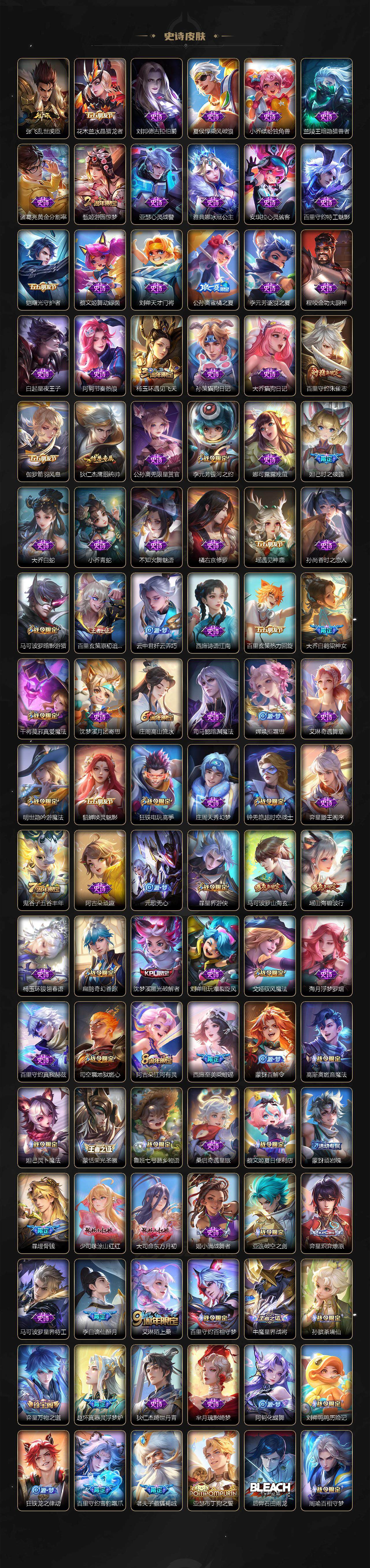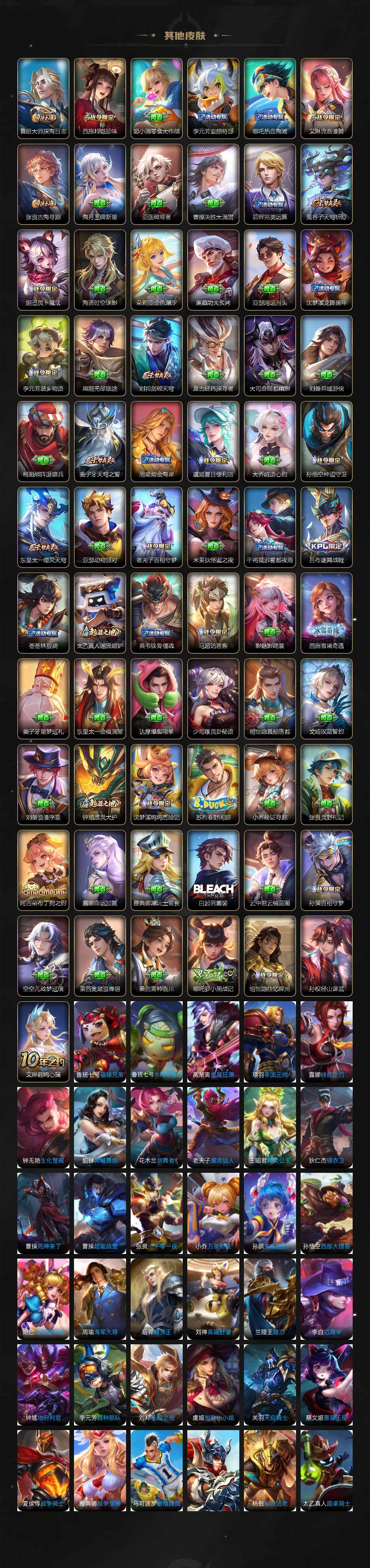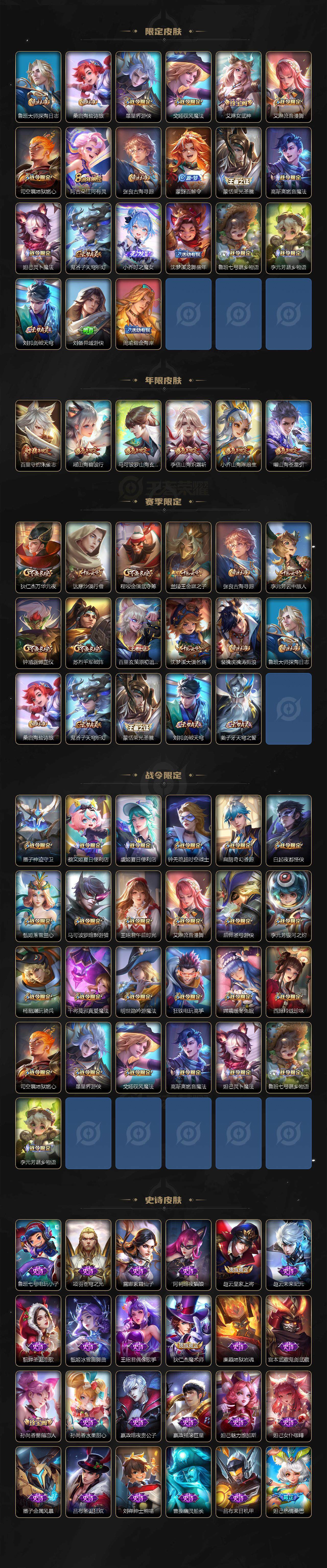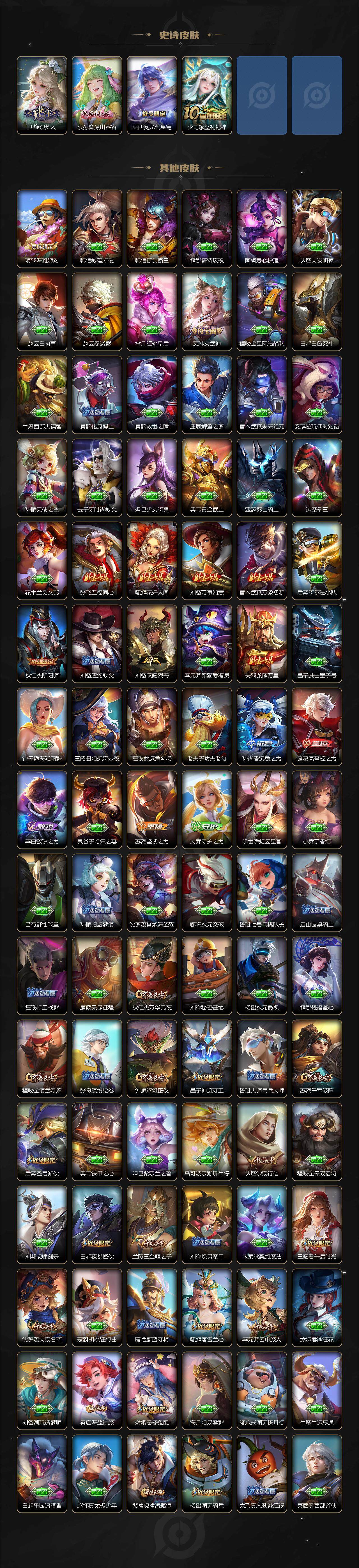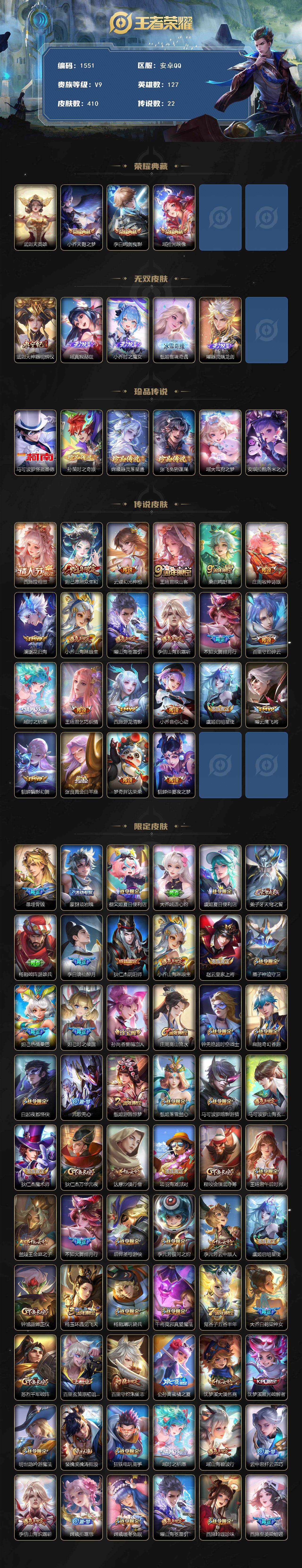 127英雄-410皮肤-贵族9/皮肤410/典藏3/传说22/史诗129/英雄127/刘禅全皮/孙权全皮/百里守约全皮/瑶全皮/西施全皮/蒙恬全皮/阿古朵全皮/桑启全皮/戈娅全皮/空空儿全皮/影全皮/少司缘全皮/武则天/天鹅之梦 小乔/鸣剑·曳影 李白/拾光映像 瑶/神器·明辉仪 武则天/真我赫兹 瑶/时之魔女 小乔/雪境奇遇 甄姬/器灵·螭龙剑 曜/怪盗基德 马可波罗/时之奇旅 孙策/器灵·落星盏 嫦娥/兔狲·蓬尾