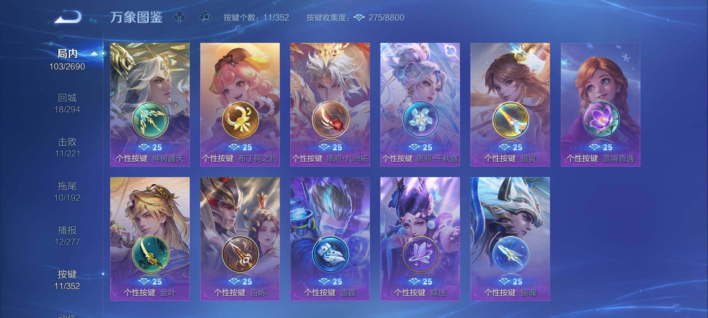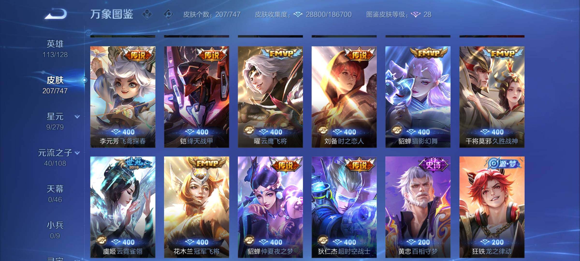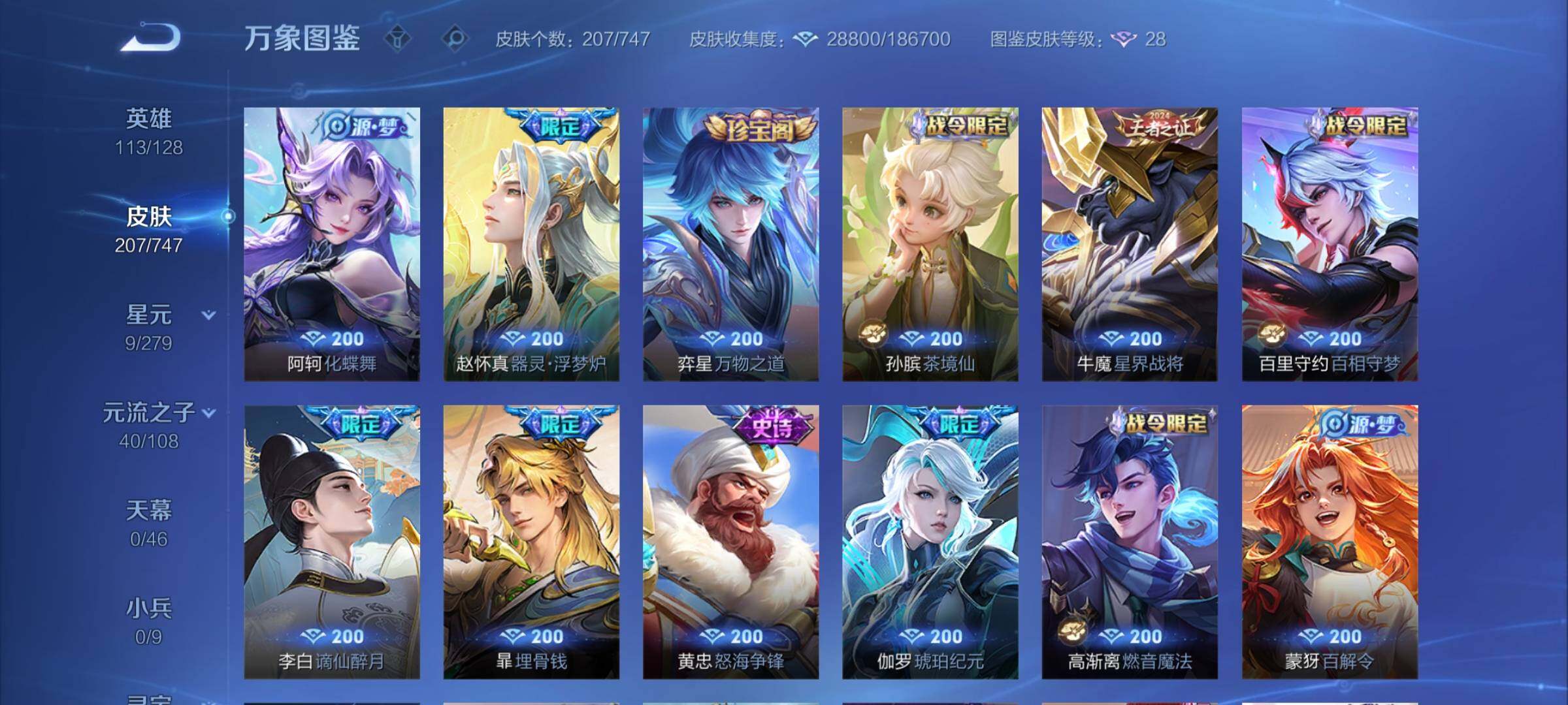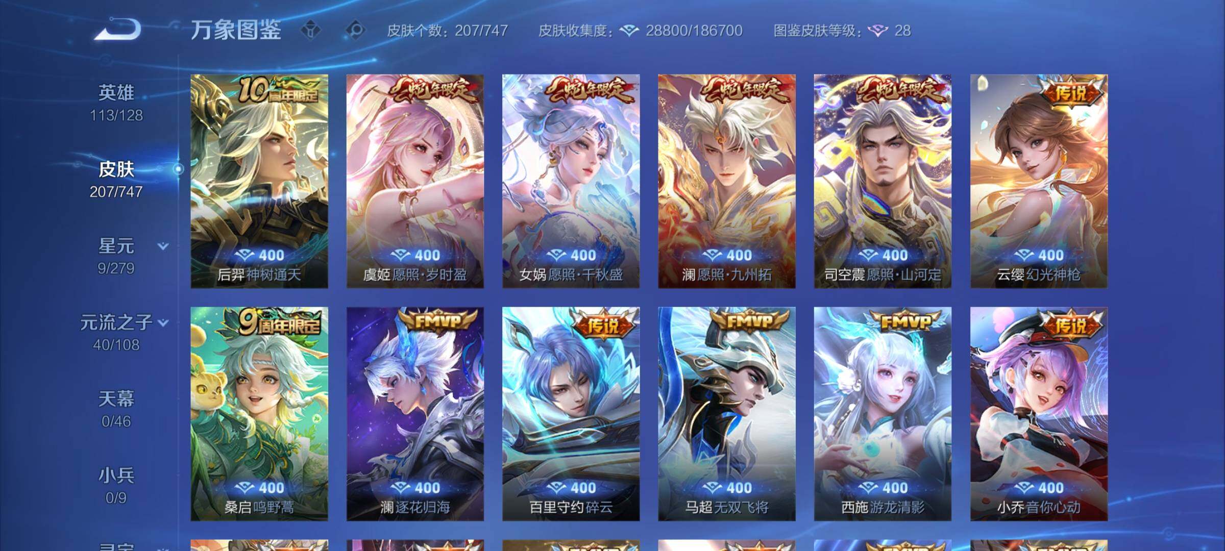 2293660-【店长推荐精品号,蛇年限定4款,多热门限定皮肤】 1星传说 11按键 5王者印记 五级铭文70 可二次cd14975 安卓wx-v7-207皮肤-22传说-43史诗【英雄全皮】:影全皮【星元皮肤】:貂蝉金色仲夏夜【传说皮肤】:后羿神树通天,司空震愿照山河定,女娲愿照千秋盛,澜愿照九州拓,虞姬愿照岁时盈,云缨幻光神呛,桑启鸣野蒿,澜逐花归海,百里守约碎云,马超无双飞将,西施游龙