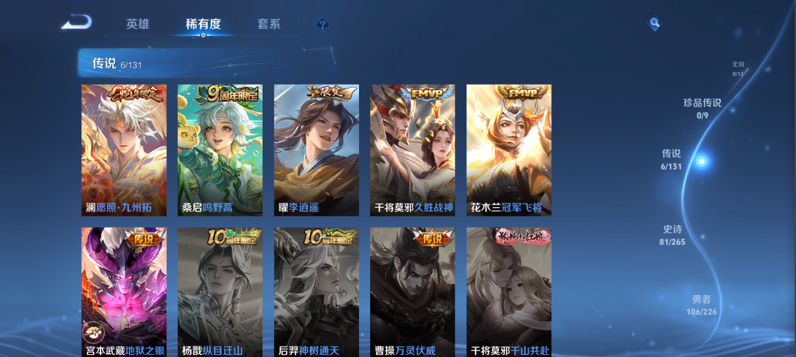 _2300615-实名:不可修改性别:男号贵族等级:v6英雄数:125皮肤数:226荣耀水晶:银白咏叹调星传说:未来机甲幽冥之眼传说皮:冠军飞将久胜战神地狱之眼李限定皮:梁祝至尊宝高山流水五谷丰年至美·乘鲤谣鸣野蒿愿照·九州拓亮点:【精品号手慢无】背包一颗水晶未使用,贵族v6,夺宝178,打野47段,宫本孙尚香星传说,银白咏叹调,冠军飞将久胜战神地狱之眼李,梁祝至尊宝高山流水五谷丰年至美·乘鲤谣鸣野蒿愿照·九州拓.....