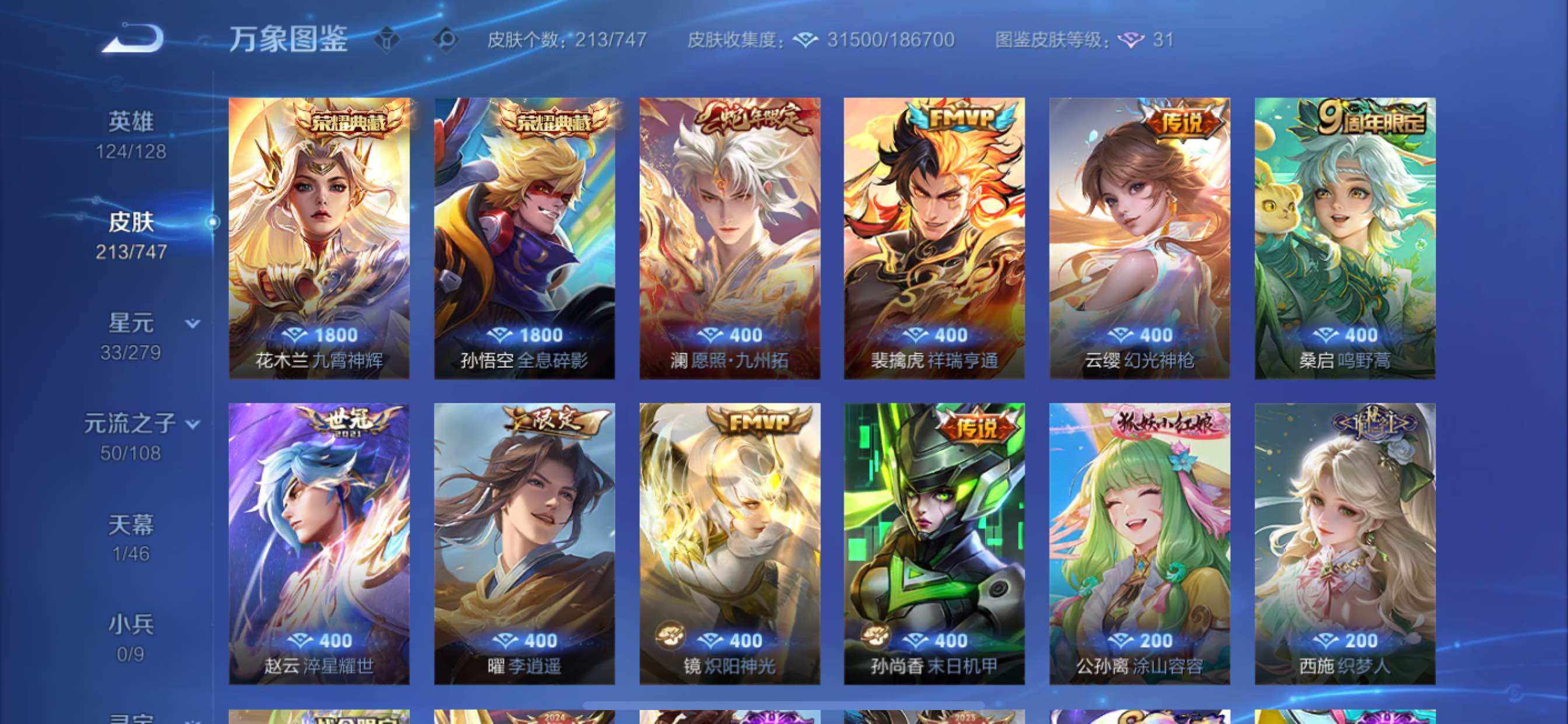 2300627-【战士刺客号,9金标,万战韩信 万战花木兰 打野45段,对抗43段】 1星传说 4按键 19王者印记 五级铭文200 可二次 苹果wx-v7-213皮肤-2典藏皮肤-8传说-66史诗【英雄全皮】:鬼谷子全皮,蒙恬全皮【荣耀典藏】:孙悟空全息碎影,花木兰九霄神辉【星元皮肤】:孙尚香未来机甲【传说皮肤】:澜愿照九州拓,云缨幻光神呛,裴擒虎祥瑞亨通,桑启鸣野蒿,赵云淬星耀世,曜李