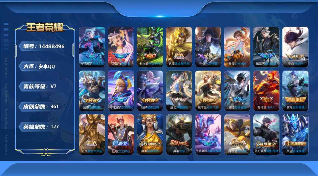 [14488496]安卓q-v7-至尊星耀v段位-127英雄-361皮肤-1典藏英雄-18传说-116史诗 【英雄全皮】:阿轲全皮,达摩全皮,狂铁全皮,猪八戒全皮,蒙恬全皮,夏洛特全皮,戈娅全皮 【荣耀典藏】:武则天英雄 【传说皮肤】:后羿神树通天,云缨幻光神呛,马可波罗妄想实况,诸葛亮鹤羽星尊,夏洛特浮生妄,吕布怒海麟威,李白诗剑行,马可波罗深海之息,赵云淬星耀世,虞姬启明星使,李信一念神魔,貂蝉猫影幻舞,张良黄金白羊座,虞姬云霓雀翎,达摩黄金狮子座,花木兰冠军飞将,孙尚香末日机甲,孙悟空地狱火 【限定皮肤】:白起狰,狄仁杰阴阳师,虞姬凯尔特女王,廉颇寅虎御盾,赵云皇家上将,赵云引擎之心,赵云百木心呛,墨子神迹守卫,墨子降魔,妲己时之彼端,嬴政优雅恋人,嬴政白昼王子,孙尚香蔷薇恋人,鲁班七号狮舞东方,庄周蜃楼王,庄周高山流水,高渐离玩趣恶龙,阿轲迷踪丽影,钟无艳超时空战士,孙膑妖精王,扁鹊炼金王,扁鹊奇幻香踪,白起夜都怪侠,芈月重明,芈月幻夜卜梦,吕布猎兽之王,吕布御风骁将,周瑜赤莲之焰,元歌云间偶戏,元歌无心,夏侯惇朔风刀,夏侯惇匿光决锋者,甄姬游园惊梦,甄姬落雪兰心,曹操烛龙,曹操天狼征服者,典韦穷奇,典韦蓝屏警告,典韦岱宗,马可波罗暗影游猎,马可波罗深海之息,马可波罗妄想实况,狄仁杰魔术师,狄仁杰万华元夜,达摩星际陆战队,达摩沙漠行僧,项羽海滩派对,老夫子醍醐杖,老夫子航海奇遇记,关羽冰锋战神,程咬金演武夺筹,刘邦夺宝奇兵,王昭君午后时光,兰陵王驯魔猎人,兰陵王金庭之子,亚瑟狮心王,亚瑟潮玩骑士王,孙悟空美猴王,孙悟空孙行者,牛魔御旌,后羿辉光之辰,后羿如梦令,后羿圣弓游侠,李元芳银河之约,李元芳云中旅人,虞姬霸王别姬,虞姬启明星使,钟馗神迹守卫,钟馗驱傩正仪,杨玉环遇见飞天,杨戬潮玩骑兵,女娲朔望之晖,干将莫邪冰霜恋舞曲,干将莫邪真爱魔法,雅典娜单词大作战,蔡文姬繁星吟游,太乙真人饕餮,鬼谷子原初探秘者,鬼谷子五谷丰年,诸葛亮鹤羽星尊,黄忠火炮绅士,苏烈千军破阵,百里守约朱雀志,弈星混沌棋,沈梦溪星空之诺,沈梦溪大漠名商,明世隐疑决卦,明世隐吟游魔法,裴擒虎天狼狩猎者,裴擒虎李小龙,裴擒虎擒涛扼浪,狂铁御狮,狂铁电玩高手,米莱狄御霄,米莱狄胡桃异想国,云中君纤云弄巧,伽罗天狼溯光者,盾山御銮,猪八戒西部大镖客,猪八戒猪悟能,上官婉儿梁祝,嫦娥拒霜思,嫦娥暖冬兔眠,西施玲珑珍