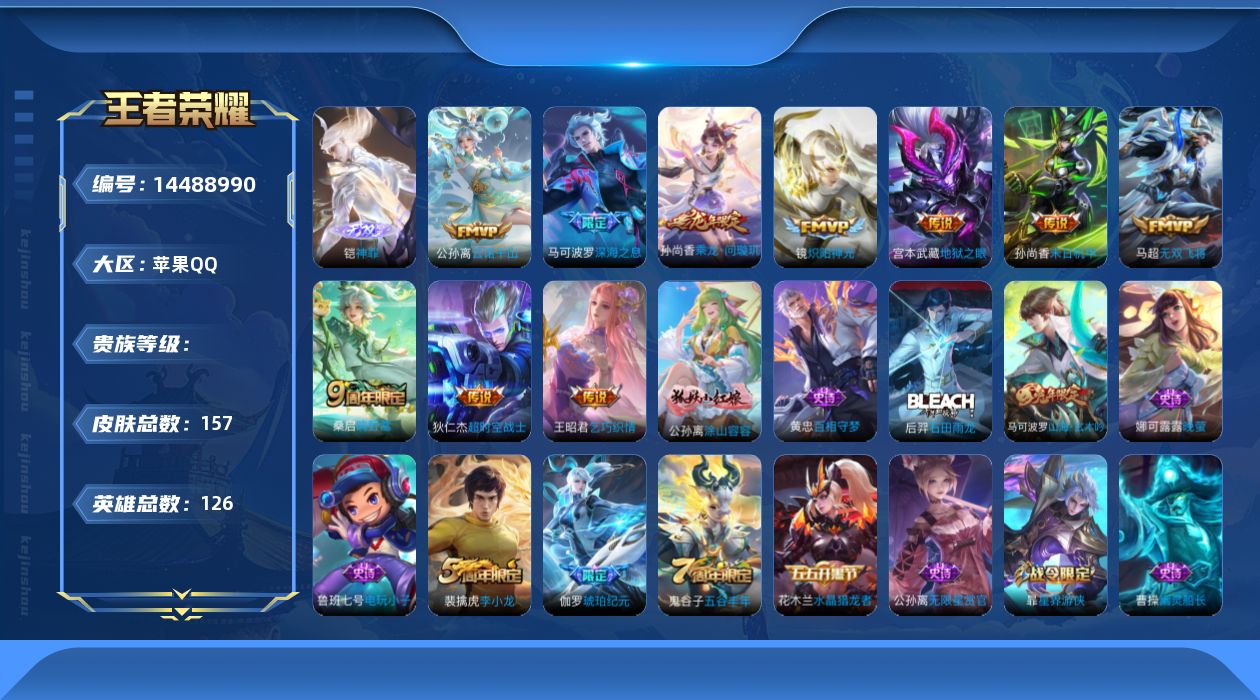 [14488990]王者 可二次 射手带妹号 47段发育路 金标狄仁杰 金标伽罗 金标孙尚香 金标敖隐 金标鲁班大师 历史百星传奇王者 1无双 11传11按键 神罪 神树通天 云诺千山 鸣野蒿 乘龙问璇玑 深海之息 无双飞将 乞巧织情 炽阳神光 末日机甲 地狱之眼 超时空战士 星际治安官 未来机甲 百相守梦 石田雨龙 星界特工