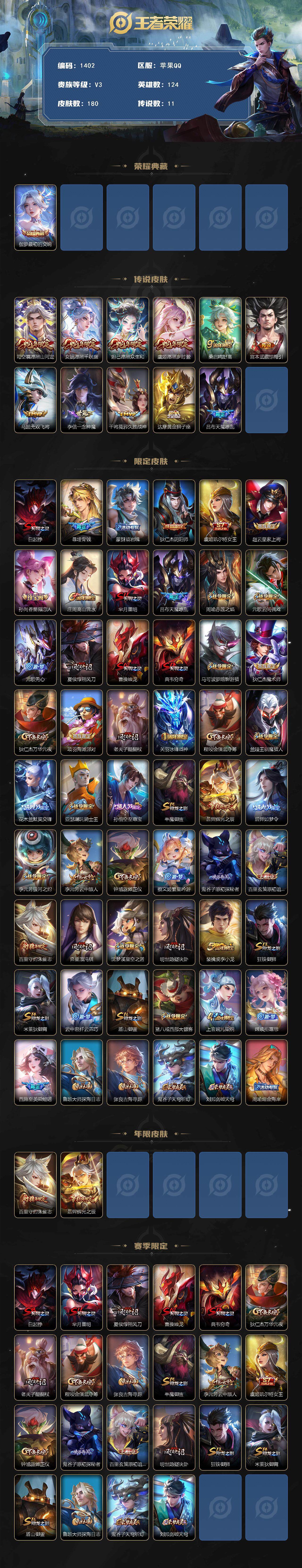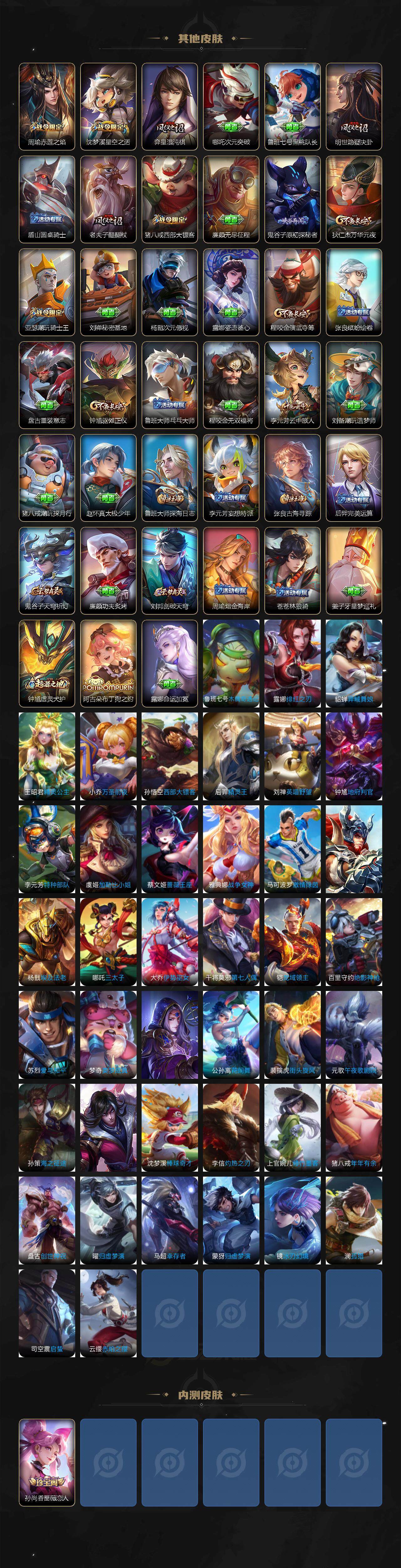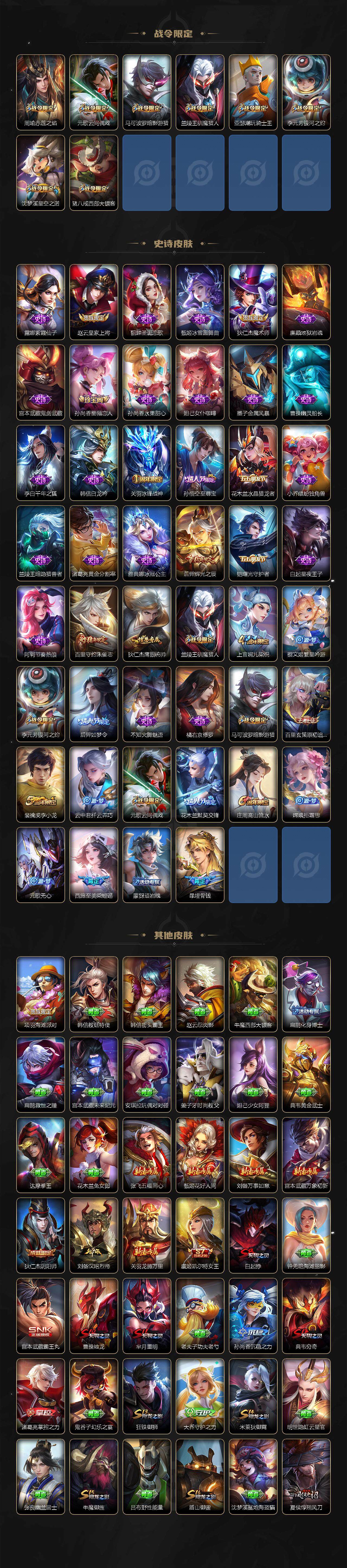 124英雄-180皮肤-贵族3/皮肤180/典藏1/传说11/史诗46/英雄124/最初的交响 伽罗/愿照·山河定 司空震/愿照·千秋盛 女娲/愿照·众生和 妲己/愿照·岁时盈 虞姬/鸣野蒿 桑启/惊梅引 宫本武藏/无双飞将 马超/一念神魔 李信/久胜战神 干将莫邪/黄金狮子座 达摩/天魔缭乱 吕布/狰 白起/埋骨钱 暃/顽岩魄 蒙犽/阴阳师 狄仁杰/凯尔特女王 虞姬/皇家上将 赵云/蔷薇恋人 孙尚香/高山流水 庄周