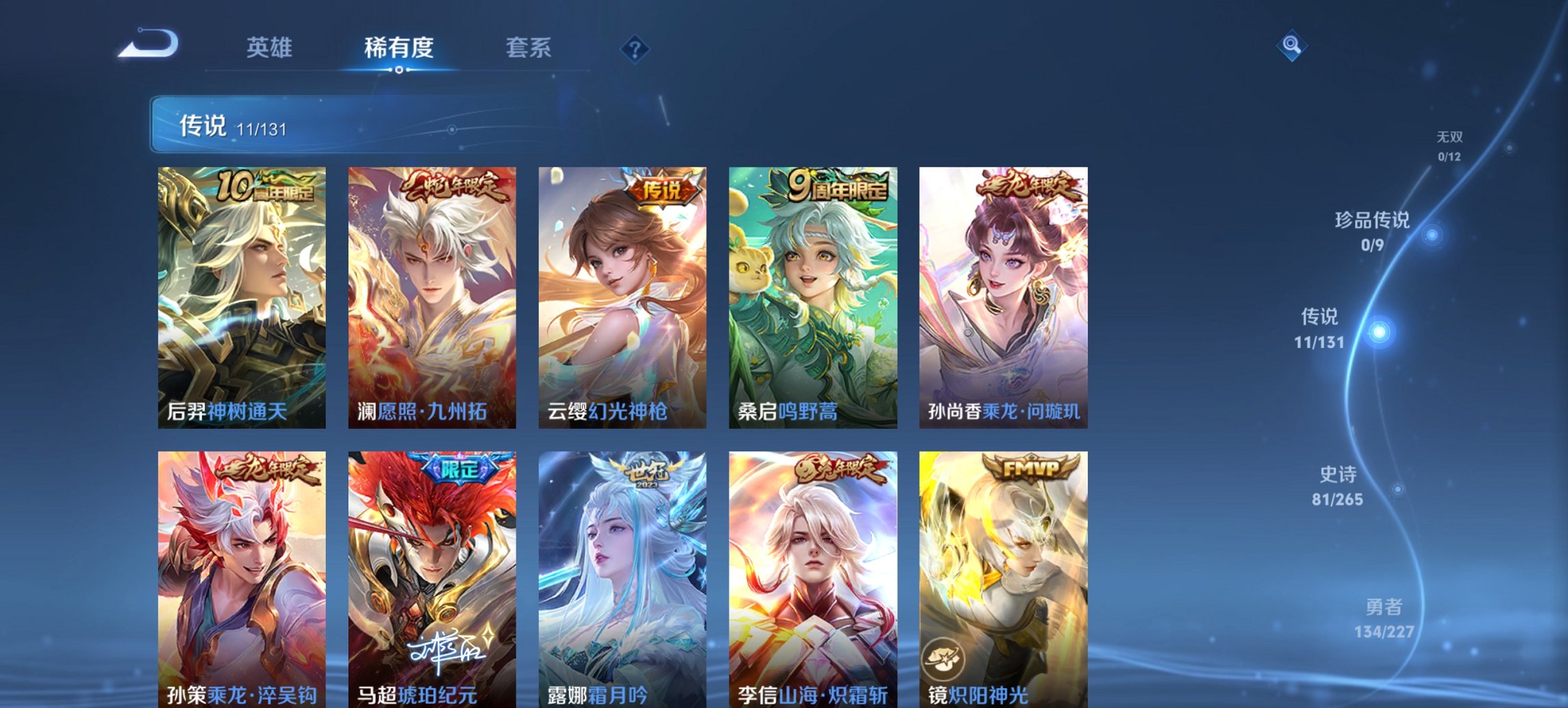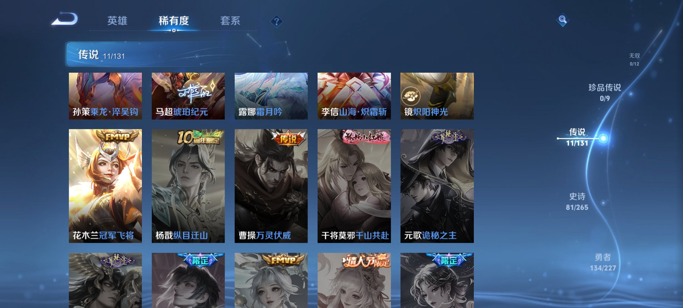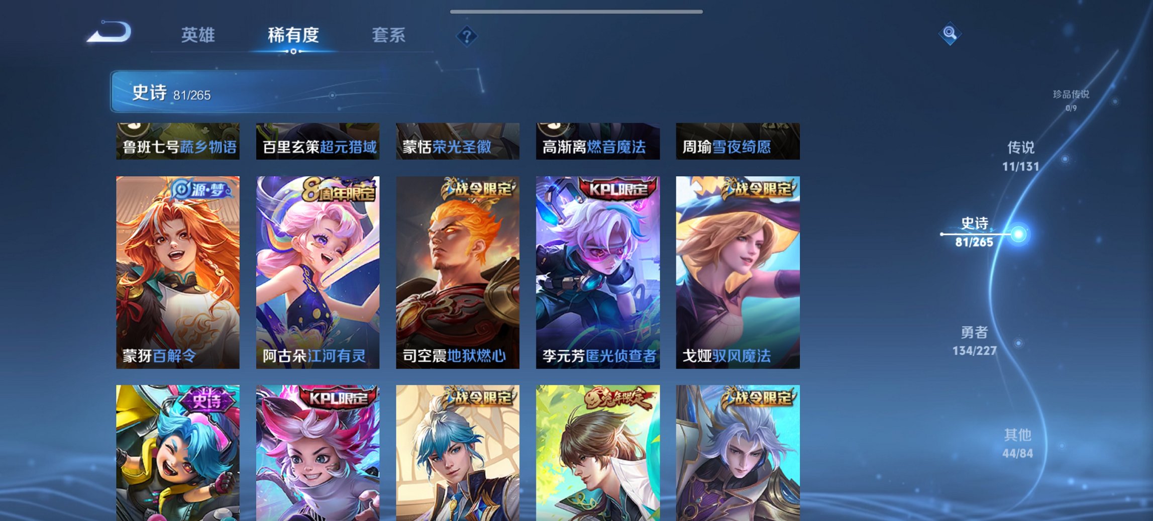 125英雄-271皮肤-可二次【271皮肤1水晶11传说九州拓琥珀纪元 秒换绑不用等】安卓qq-125英雄-271皮肤【1水晶】 鸣剑·曳影【传说皮肤】神树通天 愿照·九州拓 霜月吟 琥珀纪元 鸣野蒿 山海·炽霜斩 冠军飞将 炽阳神光 乘龙·问璇玑 乘龙·淬吴钩 幻光神呛【史诗皮肤】夏日便利店 至尊宝 龙之律动 星界战将 怒海争锋 顽岩魄 雪夜绮愿 燃音魔法 匿光侦查者 江河有灵 地狱燃心 天穹祈灯