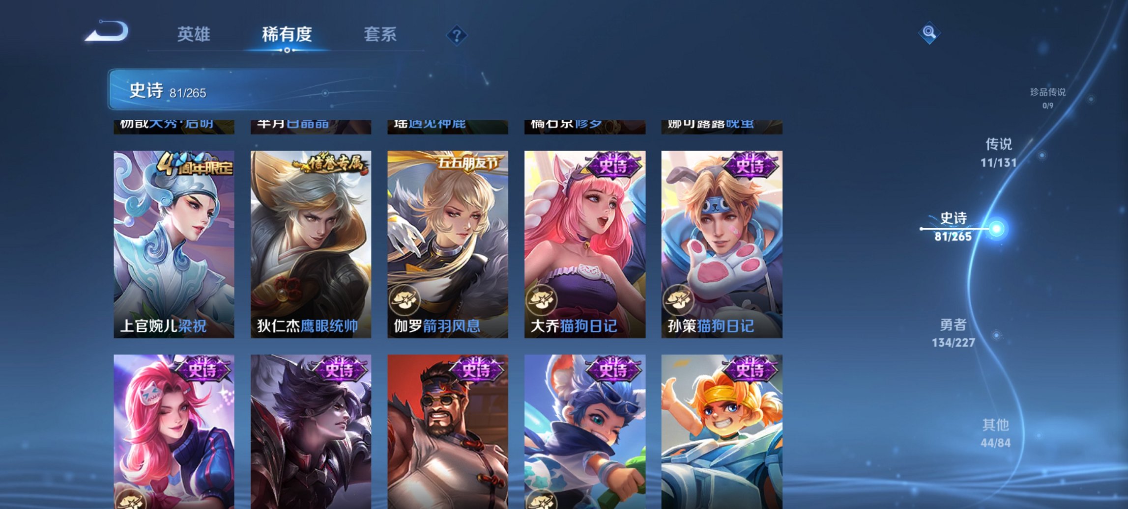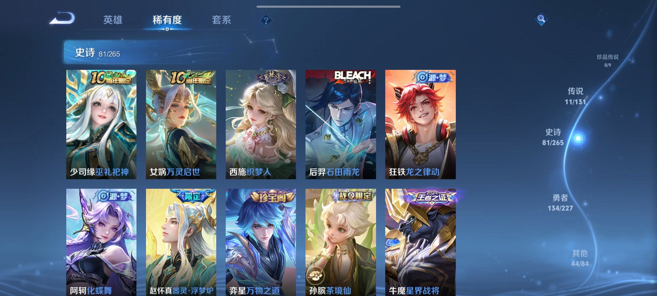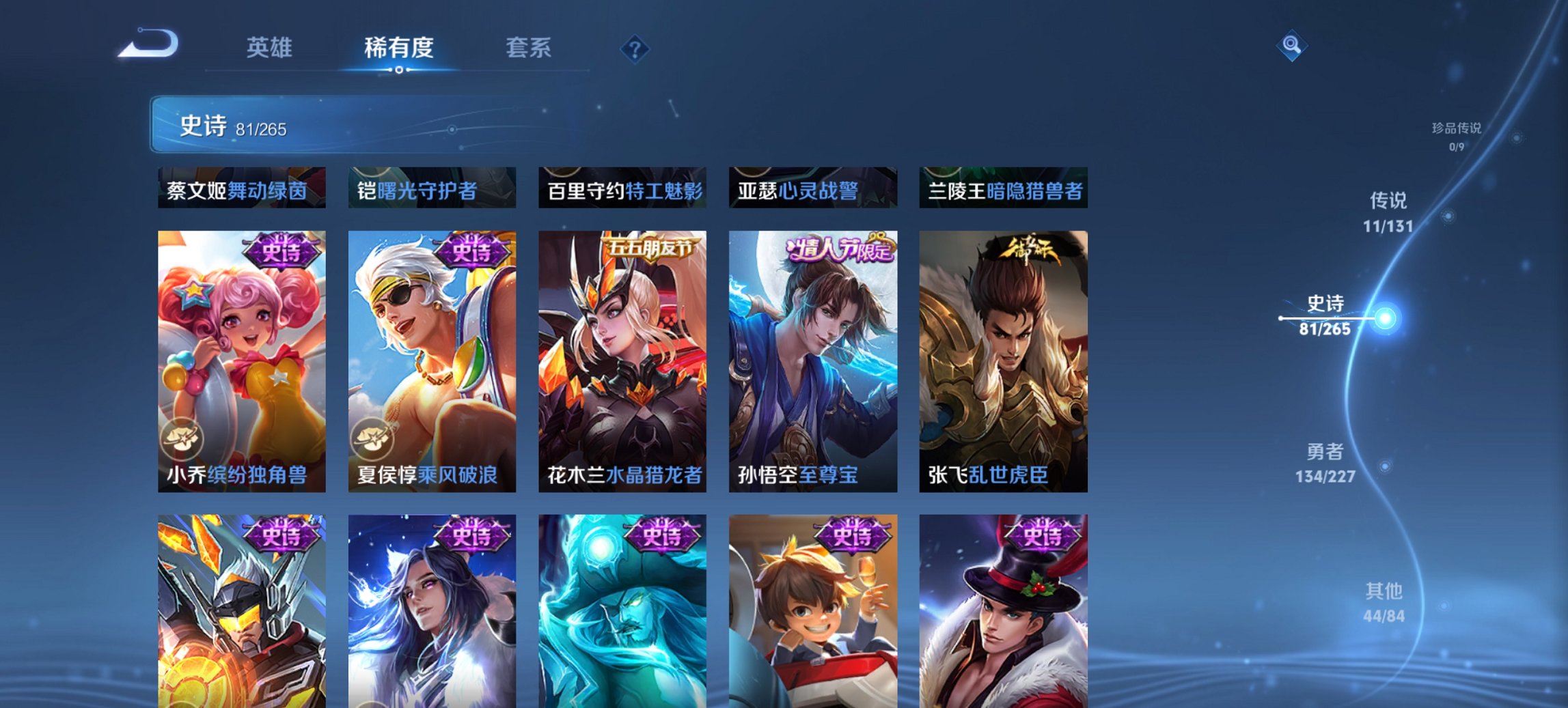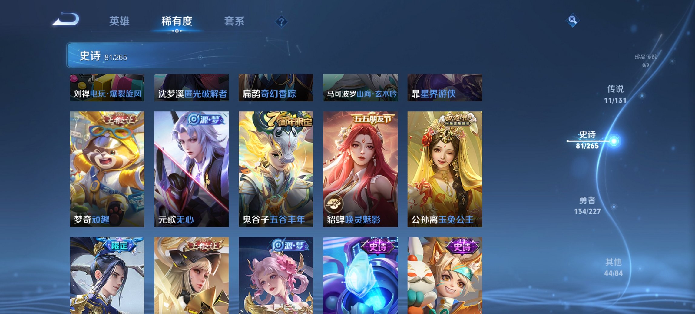 125英雄-271皮肤-可二次【271皮肤1水晶11传说九州拓琥珀纪元 秒换绑不用等】安卓qq-125英雄-271皮肤【1水晶】 鸣剑·曳影【传说皮肤】神树通天 愿照·九州拓 霜月吟 琥珀纪元 鸣野蒿 山海·炽霜斩 冠军飞将 炽阳神光 乘龙·问璇玑 乘龙·淬吴钩 幻光神呛【史诗皮肤】夏日便利店 至尊宝 龙之律动 星界战将 怒海争锋 顽岩魄 雪夜绮愿 燃音魔法 匿光侦查者 江河有灵 地狱燃心 天穹祈灯