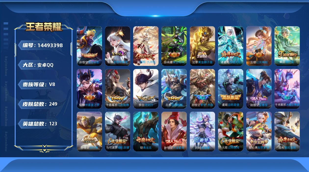 [14493398]v8-永恒钻石iii段位-123英雄-249皮肤-1典藏-12传说-77史诗,ss3105 【荣耀典藏】:孙悟空全息碎影 【内测皮肤】:嬴政优雅恋人 【传说皮肤】:孙尚香末日机甲,貂蝉仲夏夜之梦,达摩黄金狮子座,干将莫邪久胜战神,孙悟空零号赤焰,虞姬启明星使,诸葛亮时雨天司,李白诗剑行,吕布怒海麟威,桑启鸣野蒿,云缨幻光神呛,澜愿照九州拓 【限定皮肤】:白起狰,姜子牙天穹之誓,狄仁杰阴阳师,虞姬凯尔特女王,赵云皇家上将,墨子神迹守卫,嬴政优雅恋人,嬴政白昼王子,庄周高山流水,高渐离死亡摇滚,钟无艳王者之锤,扁鹊炼金王,芈月重明,吕布猎兽之王,吕布御风骁将,元歌云间偶戏,夏侯惇朔风刀,曹操烛龙,典韦穷奇,马可波罗暗影游猎,狄仁杰魔术师,狄仁杰万华元夜,达摩星际陆战队,达摩沙漠行僧,项羽海滩派对,老夫子醍醐杖,老夫子航海奇遇记,程咬金演武夺筹,韩信飞衡,亚瑟潮玩骑士王,孙悟空至尊宝,孙悟空大圣娶亲,孙悟空零号赤焰,孙悟空孙行者,牛魔御旌,后羿圣弓游侠,李元芳云中旅人,虞姬启明星使,钟馗驱傩正仪,干将莫邪冰霜恋舞曲,干将莫邪真爱魔法,雅典娜单词大作战,蔡文姬繁星吟游,太乙真人饕餮,鬼谷子原初探秘者,鬼谷子五谷丰年,诸葛亮时雨天司,铠青龙志,苏烈千军破阵,弈星混沌棋,明世隐疑决卦,裴擒虎李小龙,狂铁御狮,米莱狄御霄,米莱狄胡桃异想国,云中君纤云弄巧,伽罗天狼溯光者,猪八戒西部大镖客,上官婉儿梁祝,蒙犽狂想玩偶喵,阿古朵江河有灵,张良古海寻踪,鬼谷子天穹祈灯,姬小满妄想食味,程咬金群星魔术团 【年限皮肤】:铠青龙志,吕布御风骁将,诸葛亮时雨天司,韩信飞衡 【赛季限定】:扁鹊炼金王,白起狰,芈月重明,夏侯惇朔风刀,曹操烛龙,典韦穷奇,狄仁杰万华元夜,达摩沙漠行僧,老夫子醍醐杖,程咬金演武夺筹,张良古海寻踪,牛魔御旌,李元芳云中旅人,虞姬凯尔特女王,钟馗驱傩正仪,太乙真人饕餮,鬼谷子原初探秘者,苏烈千军破阵,弈星混沌棋,明世隐疑决卦,狂铁御狮,米莱狄御霄,鬼谷子天穹祈灯,姜子牙天穹之誓 【战令限定】:墨子神迹守卫,嬴政白昼王子,吕布猎兽之王,元歌云间偶戏,马可波罗暗影游猎,达摩星际陆战队,老夫子航海奇遇记,亚瑟潮玩骑士王,后羿圣弓游侠,干将莫邪真爱魔法,雅典娜单词大作战,米莱狄胡桃异想国,猪八戒西部大镖客,蒙犽狂想玩偶喵 【史诗皮肤】:鲁班七号电玩小子,项羽苍穹之光,露娜紫霞仙