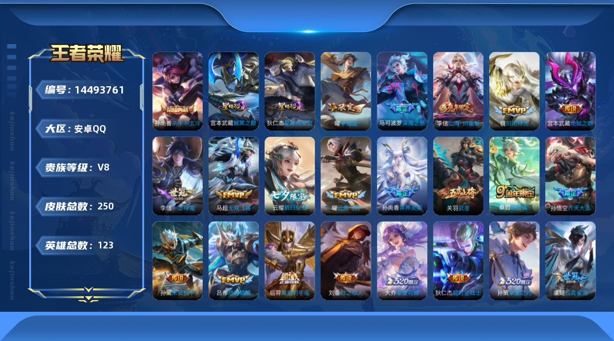 [14493761],v8-250皮肤-1典藏-23传说-77史诗连体火影,me1351 【荣耀典藏】:孙尚香杀手不太冷 【内测皮肤】:高渐离玩趣恶龙,狂铁特工战影 【传说皮肤】:狄仁杰超时空战士,宫本武藏地狱之眼,后羿黄金射手座,虞姬云霓雀翎,张良黄金白羊座,刘备时之恋人,李信一念神魔,曜云鹰飞将,关羽武圣,虞姬启明星使,镜炽阳神光,曜李 ,孙尚香异界灵契,孙策末日机甲,孙策挚爱之约,大乔挚爱花嫁,马超无双飞将,马可波罗深海之息,吕布怒海麟威,李信山海炽霜斩,孙悟空齐天大圣,云缨鹤归松栖,桑启鸣野蒿 【限定皮肤】:姜子牙天穹之誓,狄仁杰阴阳师,虞姬凯尔特女王,赵云皇家上将,赵云百木心呛,孙尚香异界灵契,鲁班七号狮舞东方,庄周高山流水,高渐离玩趣恶龙,钟无艳超时空战士,扁鹊奇幻香踪,白起夜都怪侠,芈月幻夜卜梦,周瑜赤莲之焰,元歌无心,夏侯惇朔风刀,甄姬游园惊梦,甄姬落雪兰心,曹操天狼征服者,典韦穷奇,典韦蓝屏警告,典韦岱宗,马可波罗深海之息,马可波罗山海玄木吟,狄仁杰魔术师,狄仁杰万华元夜,达摩沙漠行僧,项羽海滩派对,老夫子醍醐杖,关羽武圣,兰陵王驯魔猎人,兰陵王金庭之子,孙悟空孙行者,孙悟空齐天大圣,牛魔御旌,李元芳云中旅人,虞姬霸王别姬,虞姬启明星使,钟馗神迹守卫,钟馗驱傩正仪,杨戬潮玩骑兵,女娲朔望之晖,雅典娜单词大作战,雅典娜黎明之约,蔡文姬繁星吟游,太乙真人华丽摇滚,鬼谷子原初探秘者,鬼谷子五谷丰年,大乔挚爱花嫁,黄忠火炮绅士,苏烈千军破阵,百里玄策原初追逐者,百里守约朱雀志,梦奇顽趣,沈梦溪大漠名商,明世隐疑决卦,明世隐吟游魔法,裴擒虎天狼狩猎者,裴擒虎李小龙,裴擒虎擒涛扼浪,狂铁御狮,米莱狄御霄,李信山海炽霜斩,盾山御銮,孙策挚爱之约,猪八戒猪悟能,上官婉儿梁祝,嫦娥拒霜思,嫦娥暖冬兔眠,曜李 ,西施玲珑珍味,蒙犽狂想玩偶喵,鲁班大师探海日志,桑启海盐诗旅,暃星界游侠,戈娅驭风魔法,艾琳流音漫舞,赵怀真鹤归松栖,云缨鹤归松栖,司空震地狱燃心,阿古朵江河有灵,张良古海寻踪,蒙犽百解令,蒙恬荣光圣徽,鬼谷子天穹祈灯,姬小满妄想食味,刘邦剑破天穹,周瑜熔金海岸 【年限皮肤】:百里守约朱雀志,典韦岱宗,关羽武圣,马可波罗山海玄木吟,李信山海炽霜斩 【赛季限定】:夏侯惇朔风刀,典韦穷奇,狄仁杰万华元夜,达摩沙漠行僧,老夫子醍醐杖,兰陵王金庭之子,张良古海寻踪,牛魔御旌,