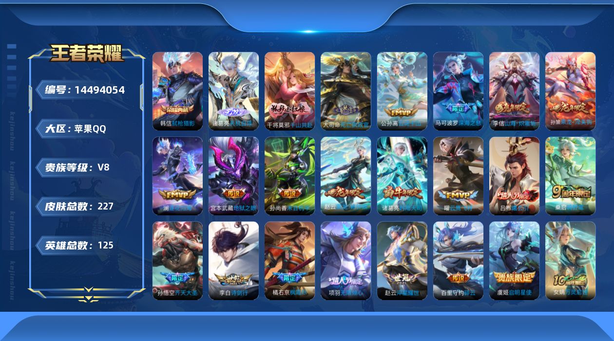 [14494054]v8 1典藏 1无双 22传说 125英雄 227皮肤 可修改实名 【稀有英雄】:大司命韩信韩跳跳夏洛特夏师傅艾琳橘右京橘子娜可露露鸟人不知火舞赵云金蝉唐僧戈娅 【荣耀水晶】:弑呛猎影韩信典藏 【无双皮】:天机白泽 【传说皮】:乘龙·铭钟鼎赵云年限乘龙·淬吴钩孙策年限吕布曦玄引云诺千山神树通天千山共赴死亡执政官山海·炽霜斩李信年限地狱之眼末日机甲-孙尚香绿蚂蚱淬星耀世云鹰飞将小将军碎云澜逐花归海 【珍宝阁皮】:妄想食味蔷薇恋人 【赛季/战令皮】:噬灭天穹s37古海寻踪s33星界游侠海盐诗旅s30擒涛扼浪s31探海日志s32流音漫舞顽趣-梦奇地狱燃心剑破天穹s35天穹祈灯s34天穹之誓s36暖冬·兔眠万华元夜s22演武夺筹s23驱傩正仪s24千军破阵s25潮玩骑士王云间偶戏航海奇遇记沙漠行僧s26金庭之子s27电玩高手电玩铁子午后时光大漠名商s28云中旅人s29 【史诗皮】:赞萌露比龙之律动乘龙·聚宝船安琪拉年限苍鳞隐世百相守梦-周瑜百相守梦-黄忠星界战将蔬乡物语鲁班七号光弋星穹万灵启世电玩小子小书包黄金分割率江河有灵高渐离燃音魔法蒙恬荣光圣徽冰冠公主偶像歌手魅语浮梦罗烟电玩·爆裂旋风末日机甲-吕布猫狗日记-孙策猫狗日记-大乔节奏热浪女仆咖啡水果甜心天才门将星夜王子心灵骇客功夫厨神暗隐猎兽者幽灵船长鬼剑武藏暗渊魔法心灵战警纤云弄巧缤纷独角兽乘风破浪水晶猎龙者金属风暴原初追逐者圣诞狂欢鹰眼统帅暗夜贵公子魅力维加斯赏金猎手无心未来纪元-赵云 【限定皮】:鸣野蒿至尊宝时雨天司水龙头无限倾心-项羽诗剑行齐天大圣五谷丰年青龙志铠年限李小龙深海之息深海大菠萝枫霜尽 【普通皮】:熔金海岸谧流熔炉劲辣红锅程咬金群星魔术团经纬探寻者蔬乡物语李元芳龙舞盛年功夫炙烤街头霸王雪境奇遇-西施星梦巡礼逆浪荇歌鹤鸣心笺径山谋武往忆晖光荣光之誓青衿临川克喵落日弦歌锦麟游梦百相守梦-孙策踏浪烽翎罗小黑战记-哪吒