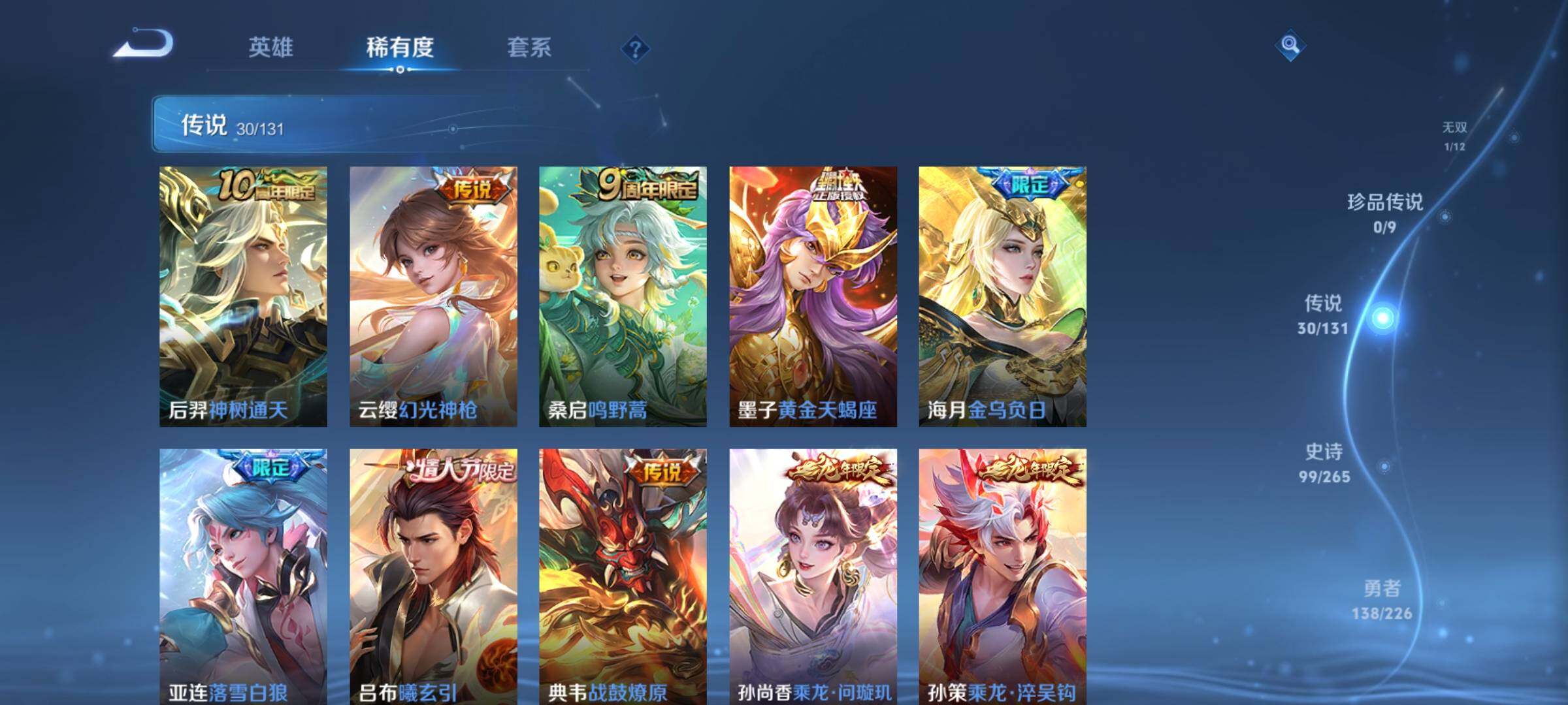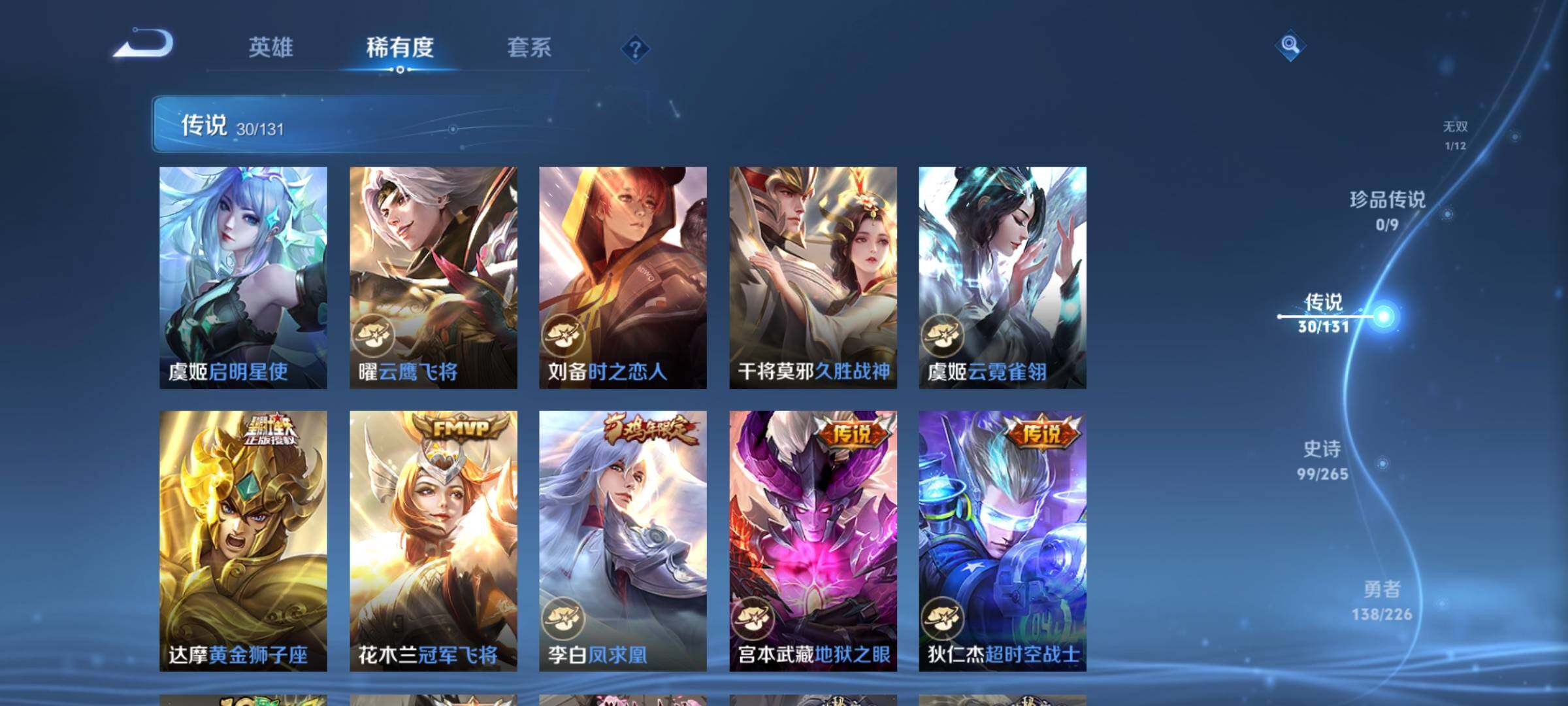 _2298164-安卓wx-v8-最强王者段位-127英雄-314皮肤-1典藏-0珍品无双-1无双-0珍品传说-30传说-99史诗-对抗路26段,打野25, 【英雄全皮】:李白全皮,姜子牙全皮,孙权全皮,鬼谷子全皮,猪八戒全皮,蒙恬全皮,空空儿全皮,海诺全皮 【荣耀典藏】:李白鸣剑曳影 【无双皮肤】:李白碎月剑心 【传说皮肤】:后羿神树通天,云缨幻光神呛,桑启鸣野蒿,墨子黄金天蝎座,海月金乌负日,亚连落雪白狼,吕布曦玄引,典韦战鼓燎原,孙尚香乘龙问璇玑,孙策乘龙淬吴钩,赵云乘龙铭钟鼎,铠琥珀纪元,马可波罗妄想实况,诸葛亮鹤羽星尊,李白诗剑行,百里守约碎云,马可波罗深海之息,赵云淬星耀世,周瑜音你心动,铠绛天战甲,虞姬启明星使,曜云鹰飞将,刘备时之恋人,干将莫邪久胜战神,虞姬云霓雀翎,达摩黄金狮子座,花木兰冠军飞将,李白凤求凰,宫本武藏地狱之眼,狄仁杰超时空战士 【限定皮肤】:大乔绒语心约,姜子牙天穹之誓,杨戬破阵退雄兵,李白谪仙醉月,狄仁杰阴阳师,赵云皇家上将,墨子神迹守卫,墨子降魔,孙尚香蔷薇恋人,鲁班七号乒乒小将,庄周高山流水,钟无艳王者之锤,钟无艳超时空战士,扁鹊奇幻香踪,芈月白晶晶,吕布猎兽之王,元歌无心,夏侯惇匿光决锋者,甄姬幽恒,甄姬游园惊梦,甄姬落雪兰心,典韦蓝屏警告,马可波罗深海之息,马可波罗妄想实况,狄仁杰魔术师,达摩沙漠行僧,项羽海滩派对,老夫子航海奇遇记,程咬金演武夺筹,兰陵王金庭之子,后羿辉光之辰,后羿圣弓游侠,李元芳云中旅人,虞姬启明星使,钟馗驱傩正仪,杨玉环遇见飞天,杨玉环寅虎心曲,杨戬潮玩骑兵,干将莫邪真爱魔法,雅典娜黎明之约,鬼谷子原初探秘者,鬼谷子五谷丰年,诸葛亮鹤羽星尊,苏烈千军破阵,百里玄策原初追逐者,弈星混沌棋,梦奇顽趣,沈梦溪大漠名商,明世隐疑决卦,裴擒虎李小龙,裴擒虎擒涛扼浪,猪八戒西部大镖客,猪八戒猪悟能,嫦娥拒霜思,鲁班大师探海日志,桑启海盐诗旅,艾琳流音漫舞,司空震地狱燃心,阿古朵江河有灵,张良古海寻踪,蒙犽百解令,蒙恬荣光圣徽,高渐离燃音魔法,妲己灵卜魔法,鬼谷子天穹祈灯,李白碎月剑心,伽罗琥珀纪元,铠琥珀纪元,姬小满妄想食味,大乔乘龙忆丹青,安琪拉乘龙聚宝船,孙尚香乘龙问璇玑,孙策乘龙淬吴钩,赵云乘龙铭钟鼎,吕布曦玄引,百里玄策超元猎域,亚连落雪白狼,沈梦溪龙舞盛年,曹操夜都魔契,鲁班七号蔬乡物语,李元芳蔬乡物语,海