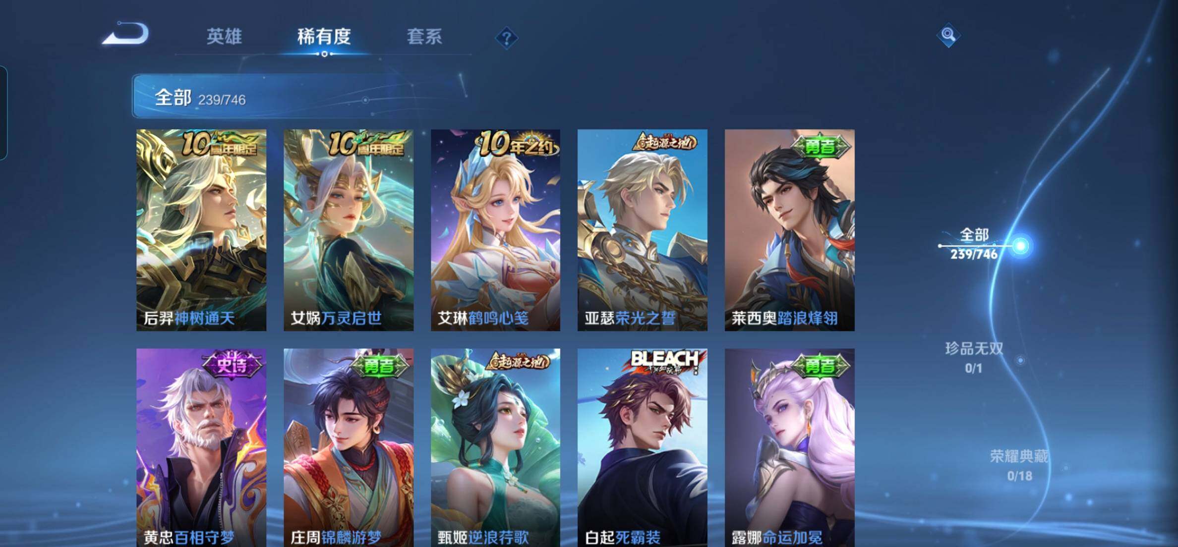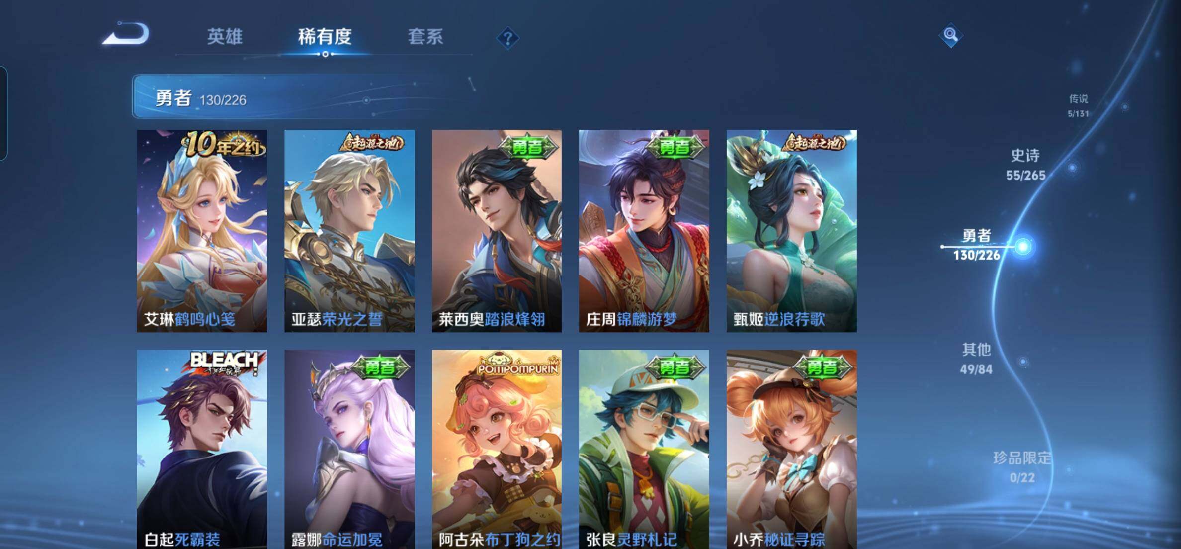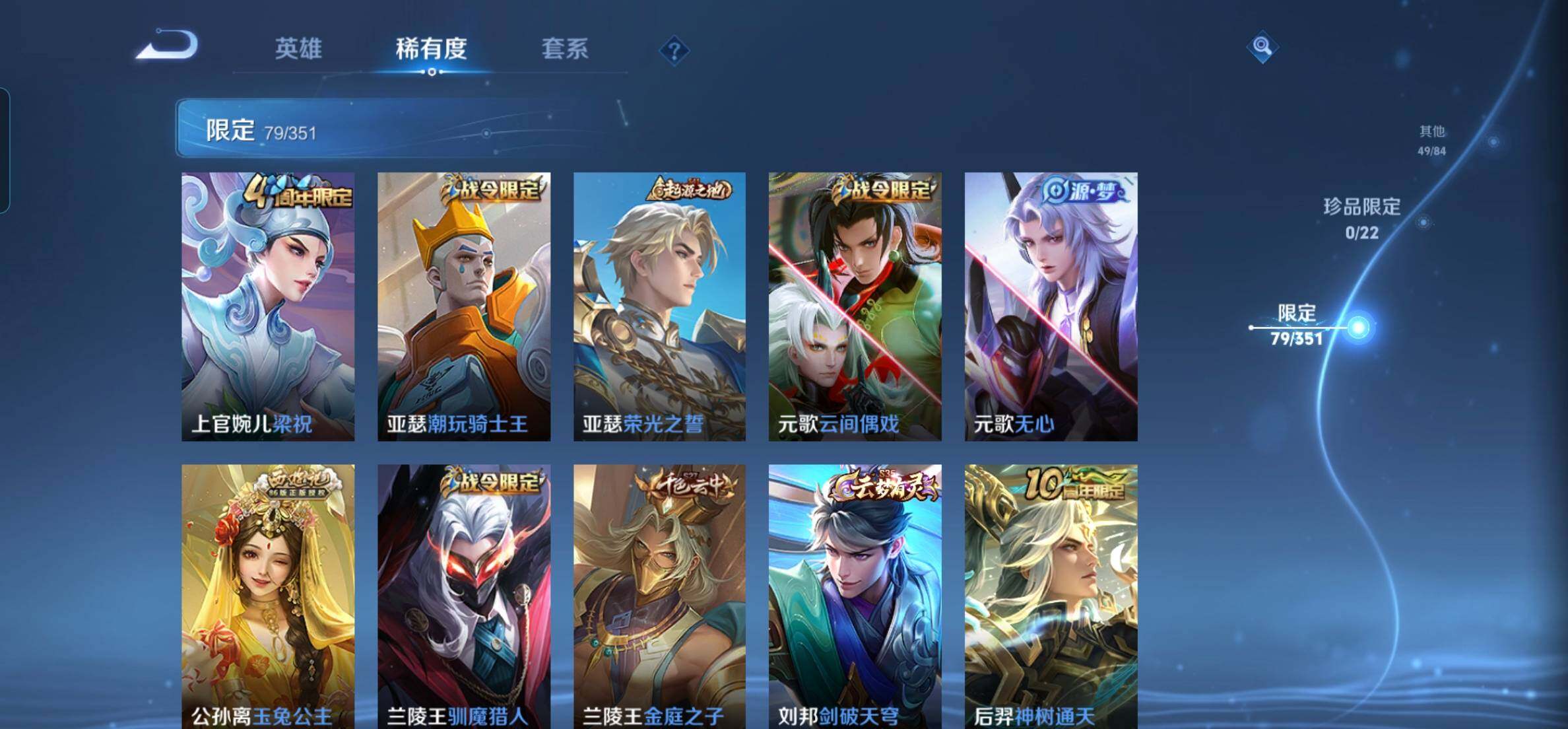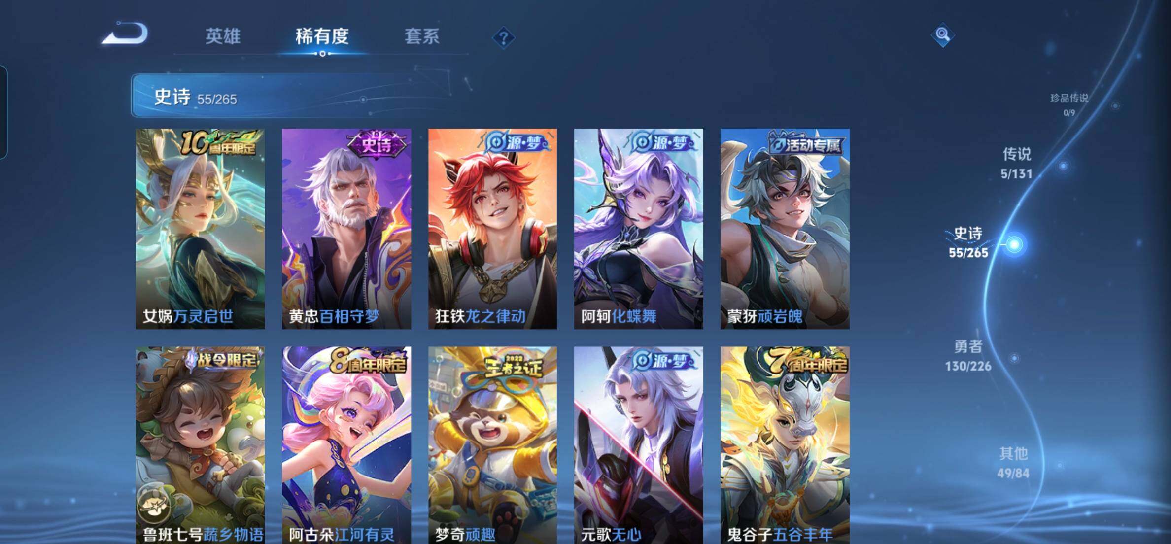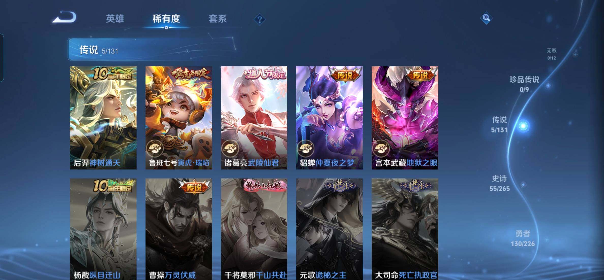 _2298086-卓q-v6-最强王者段位-125英雄-239皮肤-5传说-55史诗 【传说皮肤】:后羿神树通天,鲁班七号寅虎瑞焰,诸葛亮武陵仙君,貂蝉仲夏夜之梦,宫本武藏地狱之眼 【限定皮肤】:白起狰,蒙犽顽岩魄,大乔绒语心约,姜子牙天穹之誓,狄仁杰阴阳师,虞姬凯尔特女王,赵云皇家上将,孙尚香蔷薇恋人,鲁班七号寅虎瑞焰,庄周蜃楼王,庄周高山流水,孙膑妖精王,扁鹊炼金王,白起夜都怪侠,芈月幻夜卜梦,周瑜赤莲之焰,元歌云间偶戏,元歌无心,夏侯惇朔风刀,甄姬游园惊梦,曹操烛龙,狄仁杰魔术师,狄仁杰万华元夜,达摩沙漠行僧,项羽海滩派对,老夫子醍醐杖,程咬金演武夺筹,王昭君午后时光,兰陵王驯魔猎人,兰陵王金庭之子,亚瑟潮玩骑士王,牛魔御旌,后羿圣弓游侠,李元芳云中旅人,钟馗驱傩正仪,干将莫邪胡桃夹子,干将莫邪真爱魔法,雅典娜黎明之约,太乙真人饕餮,鬼谷子原初探秘者,鬼谷子五谷丰年,诸葛亮武陵仙君,黄忠火炮绅士,苏烈千军破阵,弈星混沌棋,梦奇顽趣,公孙离玉兔公主,沈梦溪大漠名商,明世隐疑决卦,明世隐吟游魔法,裴擒虎李小龙,裴擒虎擒涛扼浪,狂铁电玩高手,盾山御銮,上官婉儿梁祝,嫦娥拒霜思,鲁班大师探海日志,桑启海盐诗旅,艾琳女武神,阿古朵江河有灵,张良古海寻踪,鬼谷子天穹祈灯,沈梦溪龙舞盛年,鲁班七号蔬乡物语,李元芳蔬乡物语,刘邦剑破天穹,周瑜熔金海岸 【年限皮肤】:鲁班七号寅虎瑞焰,马超神威 【赛季限定】:庄周蜃楼王,孙膑妖精王,扁鹊炼金王,白起狰,夏侯惇朔风刀,曹操烛龙,狄仁杰万华元夜,达摩沙漠行僧,老夫子醍醐杖,程咬金演武夺筹,兰陵王金庭之子,张良古海寻踪,牛魔御旌,李元芳云中旅人,虞姬凯尔特女王,钟馗驱傩正仪,雅典娜黎明之约,太乙真人饕餮,鬼谷子原初探秘者,苏烈千军破阵,弈星混沌棋,梦奇顽趣,沈梦溪大漠名商,明世隐疑决卦,裴擒虎擒涛扼浪,盾山御銮,鲁班大师探海日志,桑启海盐诗旅,鬼谷子天穹祈灯,刘邦剑破天穹,姜子牙天穹之誓 【战令限定】:白起夜都怪侠,芈月幻夜卜梦,周瑜赤莲之焰,元歌云间偶戏,王昭君午后时光,兰陵王驯魔猎人,亚瑟潮玩骑士王,后羿圣弓游侠,干将莫邪真爱魔法,黄忠火炮绅士,明世隐吟游魔法,狂铁电玩高手,鲁班七号蔬乡物语,李元芳蔬乡物语 【史诗皮肤】:鲁班七号电玩小子,赵云皇家上将,甄姬冰雪圆舞曲,狄仁杰魔术师,宫本武藏鬼剑武藏,孙尚香蔷薇恋人,孙尚香水果甜心,嬴