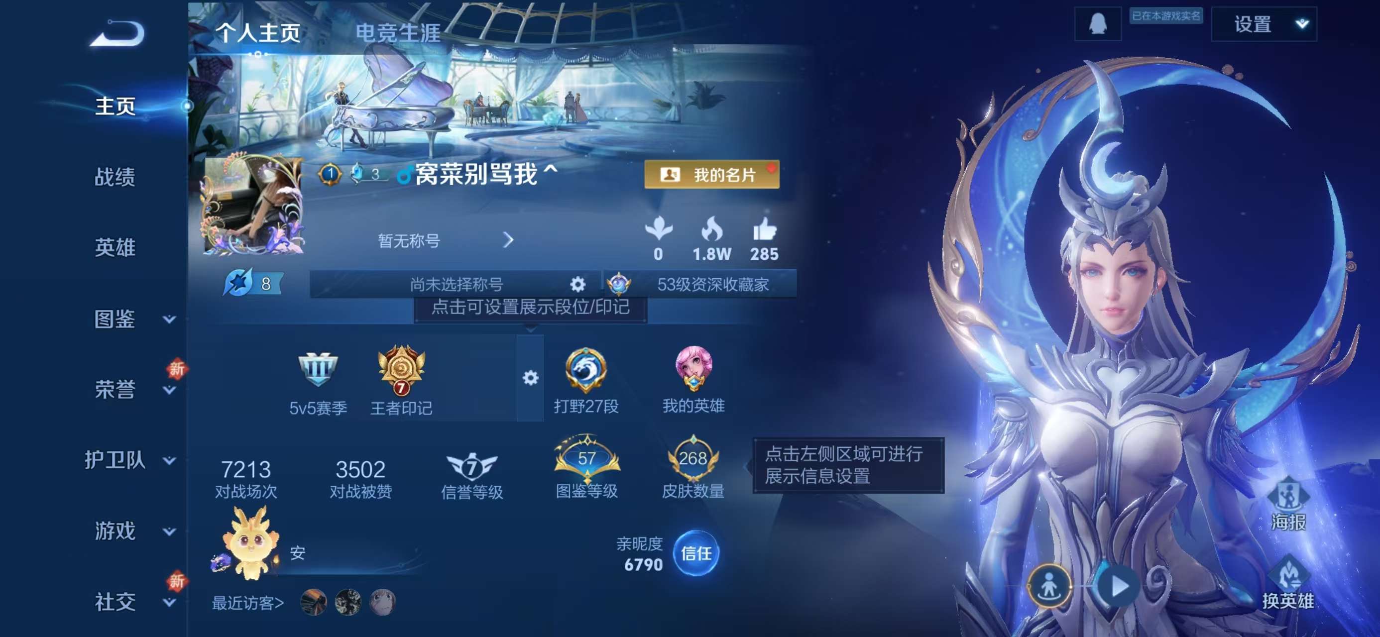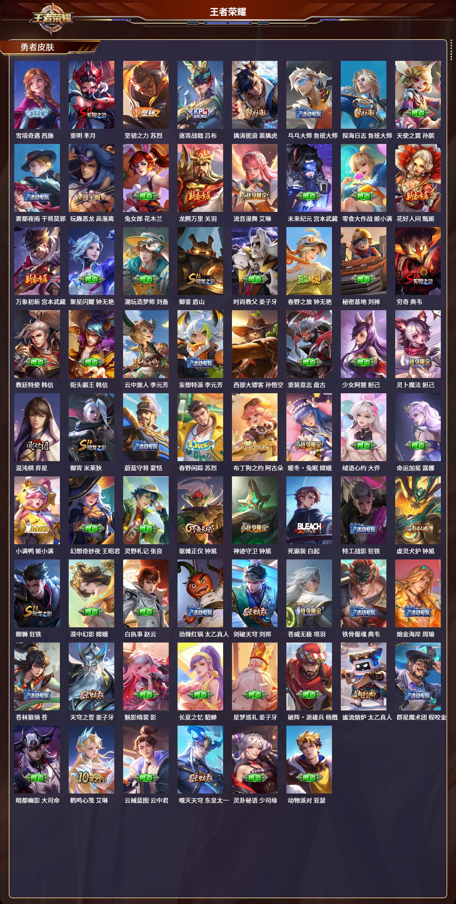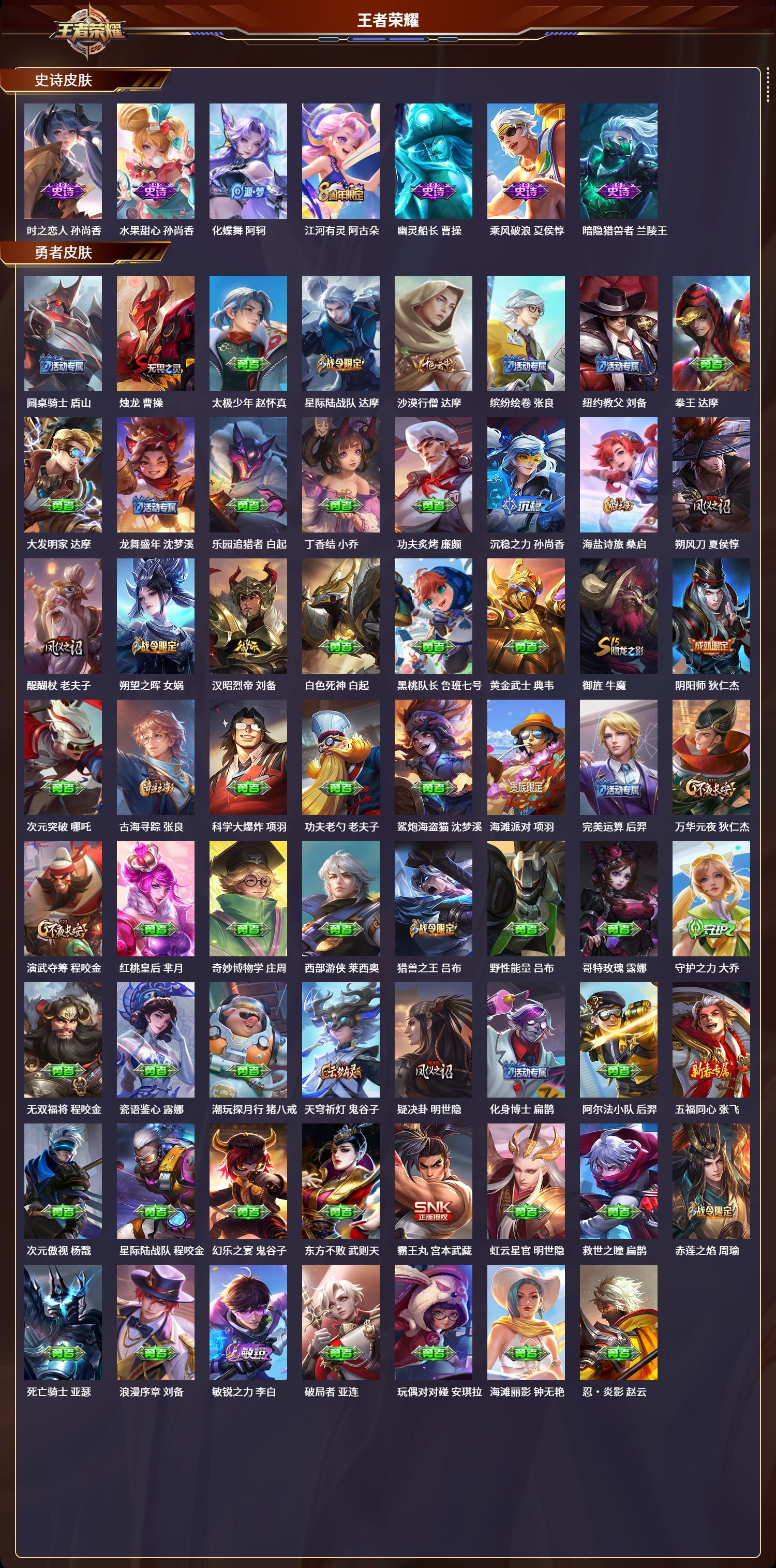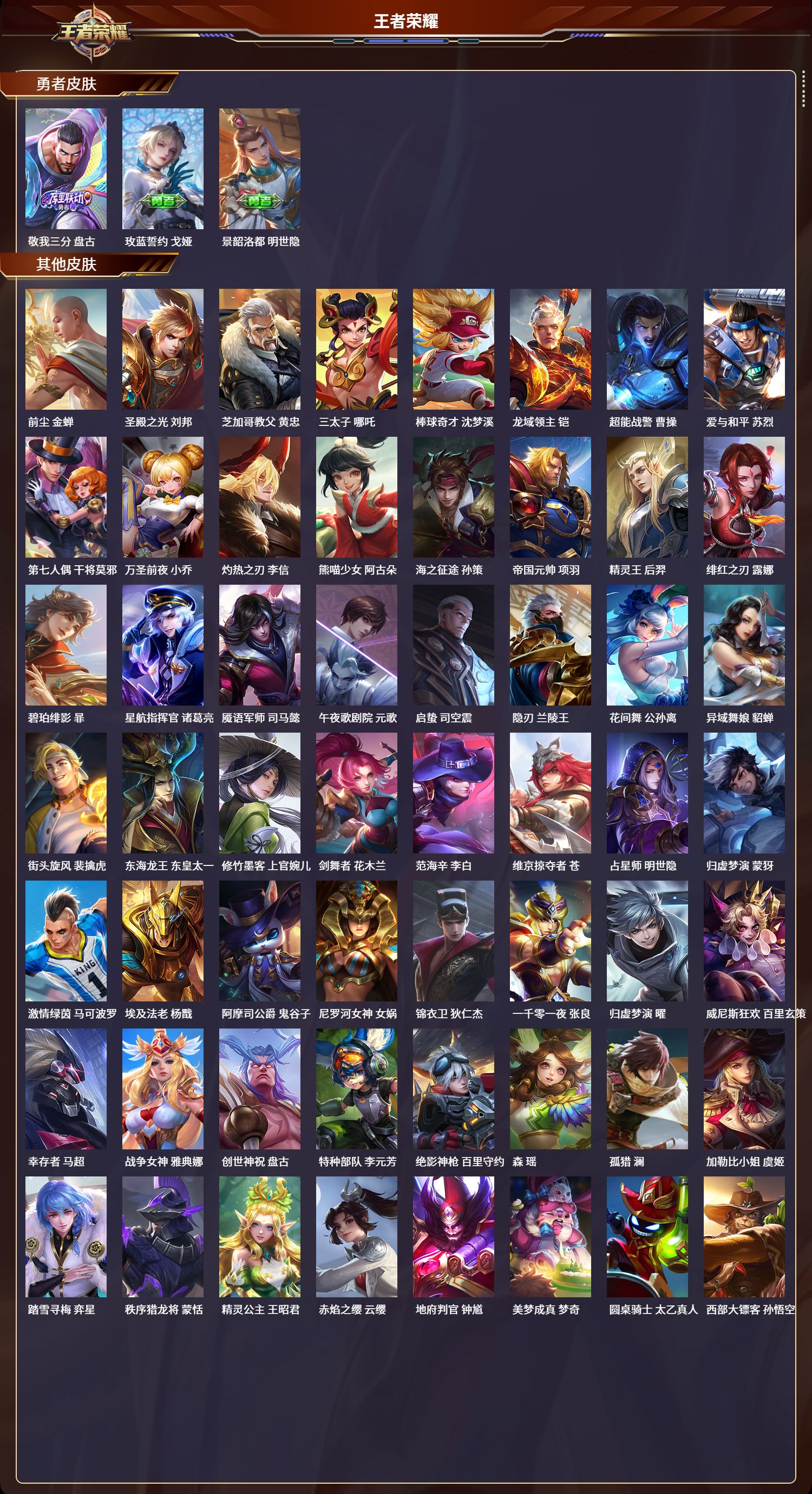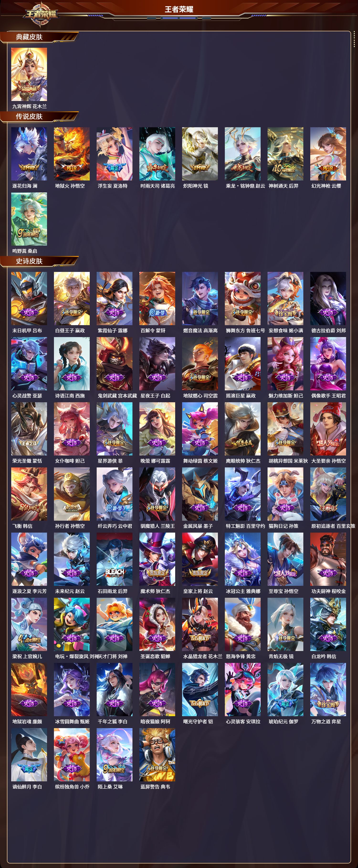 安卓qq/尊贵铂金/268皮肤/124英雄/1典藏/0珍品无双/0无双/0珍品传说/9传说/67史诗/8稀有英雄【1 典藏皮肤】九霄神辉 花木兰【9 传说皮肤】逐花归海 澜地狱火 孙悟空浮生妄 夏洛特时雨天司 诸葛亮炽阳神光 镜乘龙·铭钟鼎 赵云神树通天 后羿幻光神呛 云缨鸣野蒿 桑启【67 史诗皮肤】末日机甲 吕布白昼王子 嬴政紫霞仙子 露娜百解令 蒙犽燃音魔法 高渐