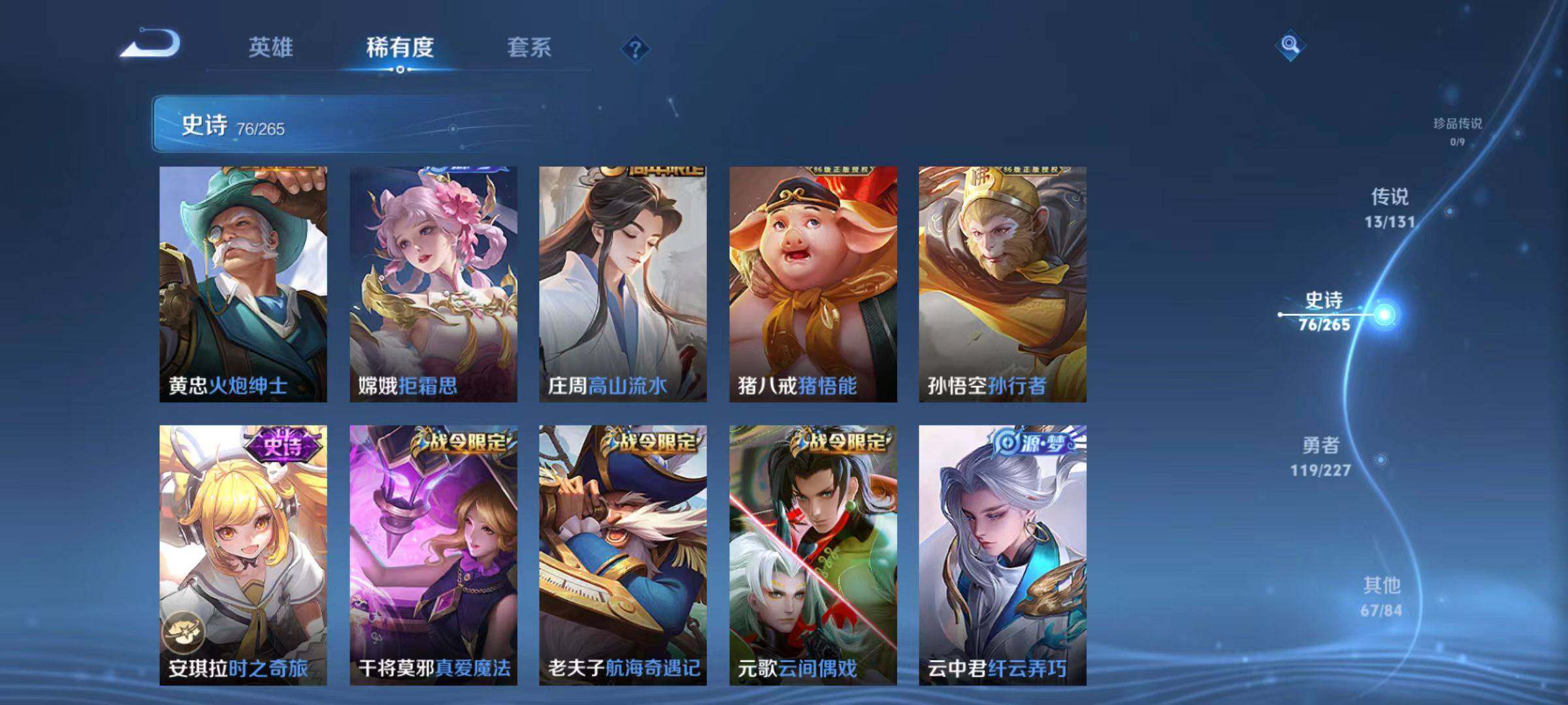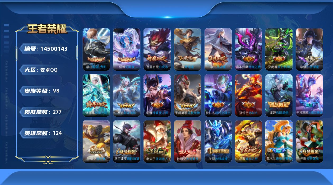 [14500143]安卓q-v0-最强王者段位-124英雄-277皮肤-2典藏皮肤-13传说-76史诗 【英雄全皮】:猪八戒全皮,蒙恬全皮 【荣耀典藏】:李白鸣剑曳影,貂蝉幻阙歌 【传说皮肤】:西施游龙清影,曜李 ,诸葛亮时雨天司,虞姬启明星使,李信一念神魔,干将莫邪久胜战神,百里玄策白虎志,貂蝉仲夏夜之梦,李白凤求凰,孙尚香末日机甲,宫本武藏地狱之眼,孙悟空地狱火,狄仁杰超时空战士 【限定皮肤】:白起狰,狄仁杰阴阳师,虞姬凯尔特女王,赵云皇家上将,墨子神迹守卫,嬴政优雅恋人,嬴政白昼王子,鲁班七号狮舞东方,庄周蜃楼王,庄周高山流水,高渐离死亡摇滚,高渐离玩趣恶龙,孙膑妖精王,扁鹊炼金王,芈月重明,芈月幻夜卜梦,吕布猎兽之王,周瑜赤莲之焰,元歌云间偶戏,夏侯惇朔风刀,甄姬游园惊梦,曹操烛龙,典韦穷奇,马可波罗暗影游猎,狄仁杰魔术师,狄仁杰万华元夜,达摩沙漠行僧,项羽海滩派对,老夫子圣诞老人,老夫子醍醐杖,老夫子航海奇遇记,关羽冰锋战神,程咬金演武夺筹,兰陵王驯魔猎人,兰陵王金庭之子,花木兰青春决赛季,亚瑟潮玩骑士王,孙悟空大圣娶亲,孙悟空孙行者,牛魔御旌,后羿辉光之辰,后羿圣弓游侠,李元芳银河之约,李元芳云中旅人,虞姬启明星使,钟馗神迹守卫,钟馗驱傩正仪,杨玉环遇见飞天,干将莫邪冰霜恋舞曲,干将莫邪真爱魔法,雅典娜单词大作战,雅典娜黎明之约,蔡文姬奇迹圣诞,太乙真人饕餮,太乙真人华丽摇滚,鬼谷子原初探秘者,鬼谷子五谷丰年,诸葛亮时雨天司,黄忠火炮绅士,苏烈千军破阵,百里玄策白虎志,百里玄策原初追逐者,弈星混沌棋,梦奇顽趣,沈梦溪星空之诺,沈梦溪大漠名商,明世隐疑决卦,裴擒虎李小龙,裴擒虎擒涛扼浪,狂铁御狮,米莱狄御霄,云中君纤云弄巧,盾山御銮,猪八戒西部大镖客,猪八戒猪悟能,上官婉儿梁祝,上官婉儿神器万象笔,嫦娥拒霜思,嫦娥暖冬兔眠,曜李 ,蒙犽狂想玩偶喵,鲁班大师探海日志,桑启海盐诗旅,暃星界游侠,艾琳女武神,阿古朵江河有灵,张良古海寻踪,蒙恬荣光圣徽,鬼谷子天穹祈灯,沈梦溪龙舞盛年,刘邦剑破天穹 【年限皮肤】:百里玄策白虎志,李白凤求凰,后羿辉光之辰,诸葛亮时雨天司 【赛季限定】:庄周蜃楼王,孙膑妖精王,扁鹊炼金王,白起狰,芈月重明,夏侯惇朔风刀,曹操烛龙,典韦穷奇,狄仁杰万华元夜,达摩沙漠行僧,老夫子醍醐杖,程咬金演武夺筹,兰陵王金庭之子,张良古海寻踪,牛魔御旌,李元芳