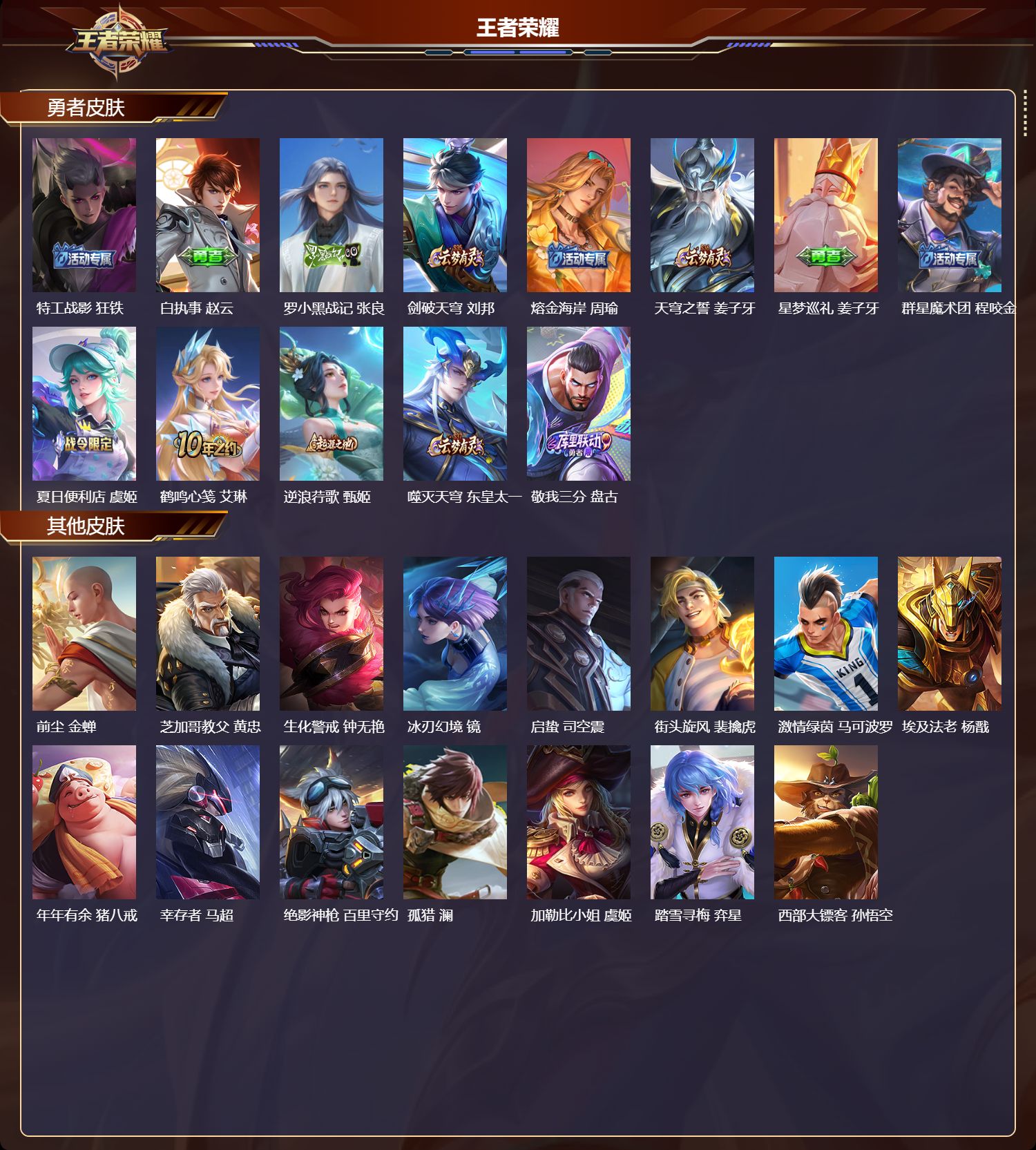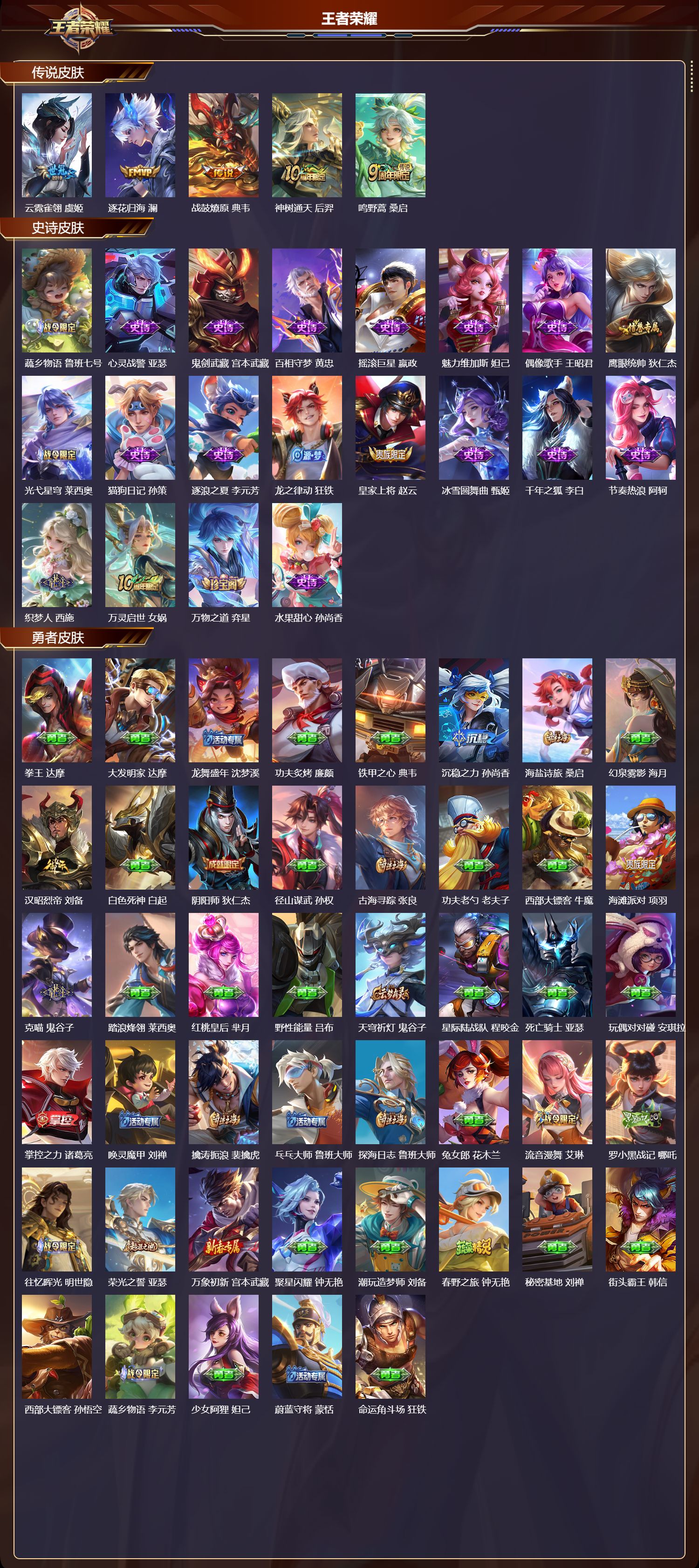 安卓qq/至圣王者/97皮肤/123英雄/0典藏/0珍品无双/0无双/0珍品传说/5传说/20史诗/5稀有英雄【5 传说皮肤】云霓雀翎 虞姬逐花归海 澜战鼓燎原 典韦神树通天 后羿鸣野蒿 桑启【20 史诗皮肤】蔬乡物语 鲁班七号心灵战警 亚瑟鬼剑武藏 宫本武藏百相守梦 黄忠摇滚巨星 嬴政魅力维加斯 妲己偶像歌手 王昭君鹰眼统帅 狄仁杰光弋星穹 莱西奥猫狗日记 孙策逐浪