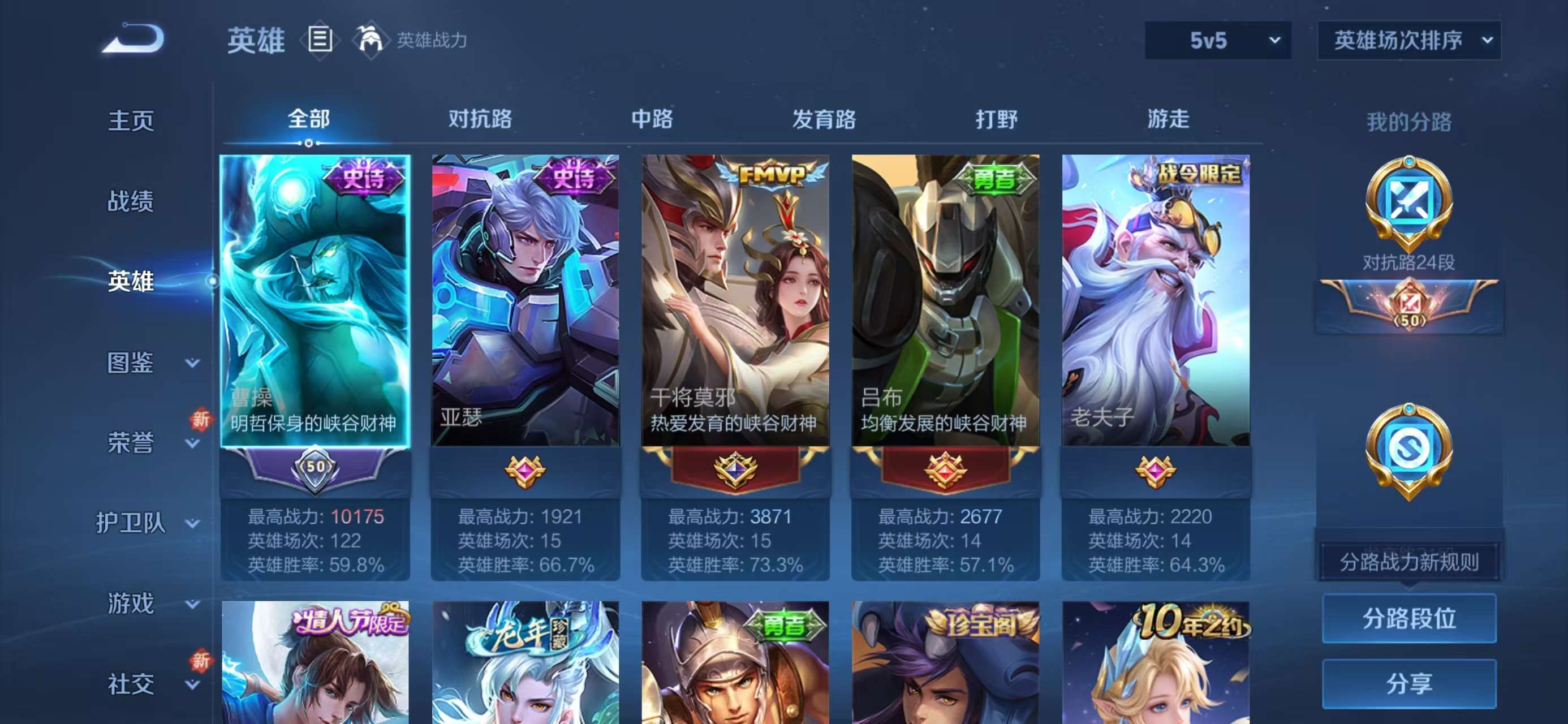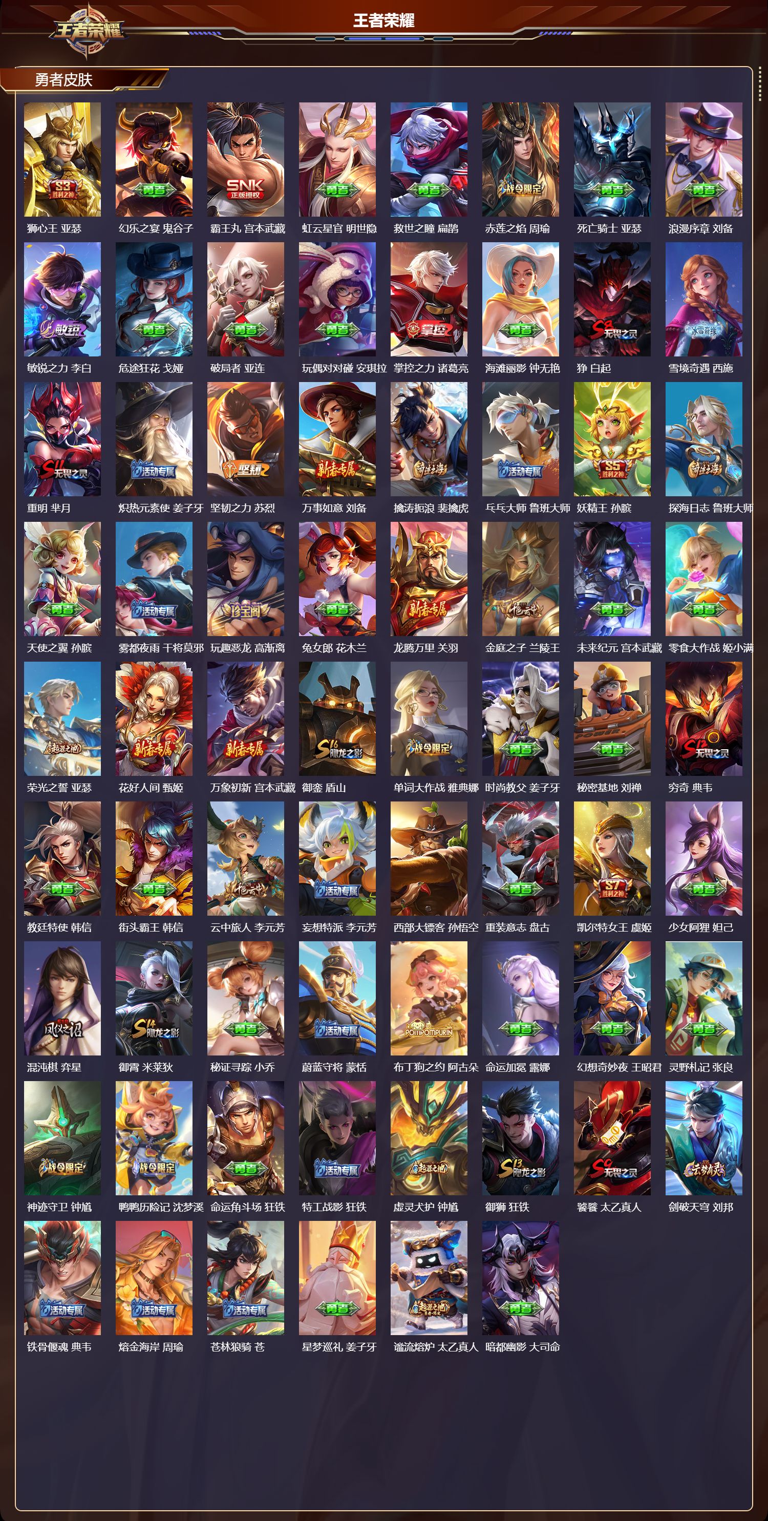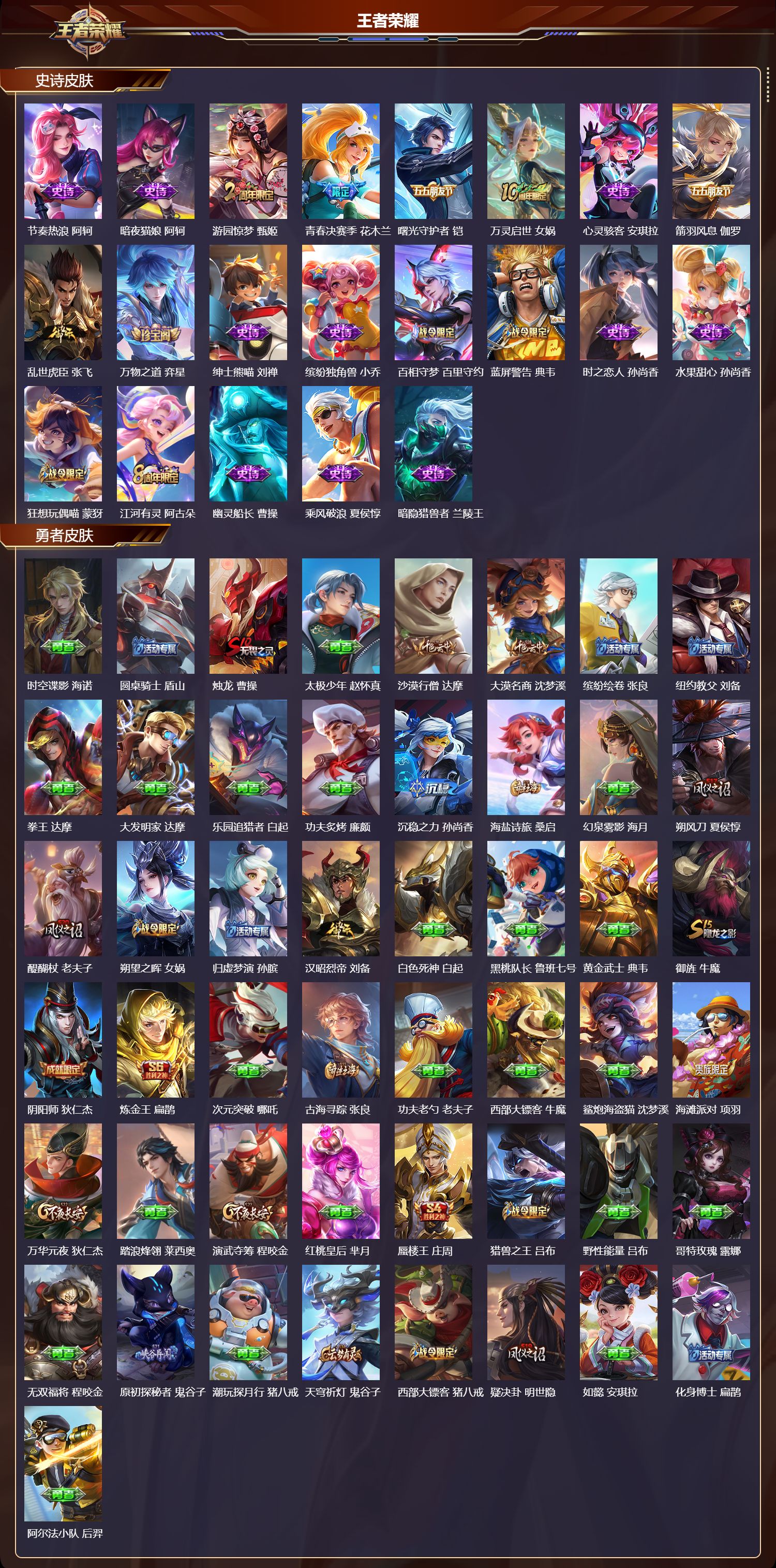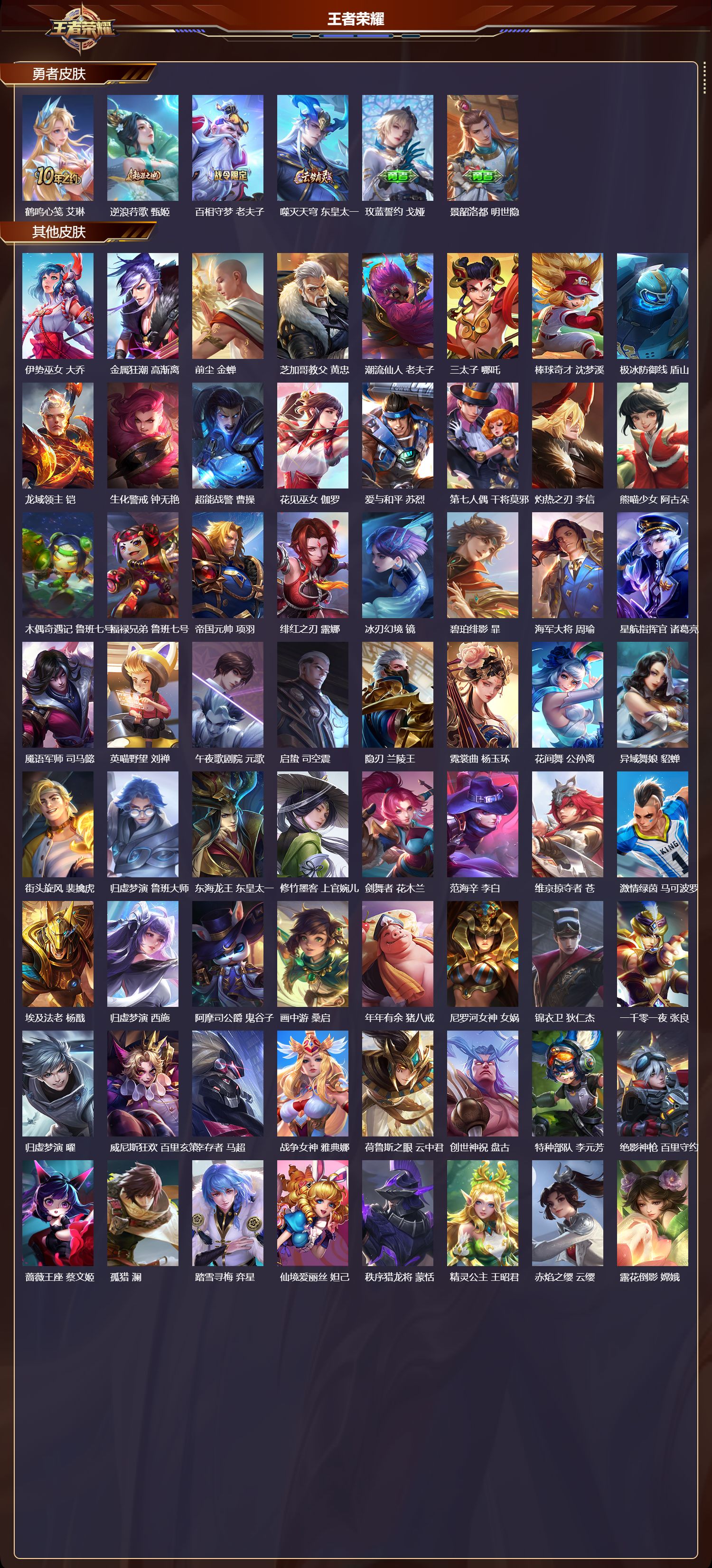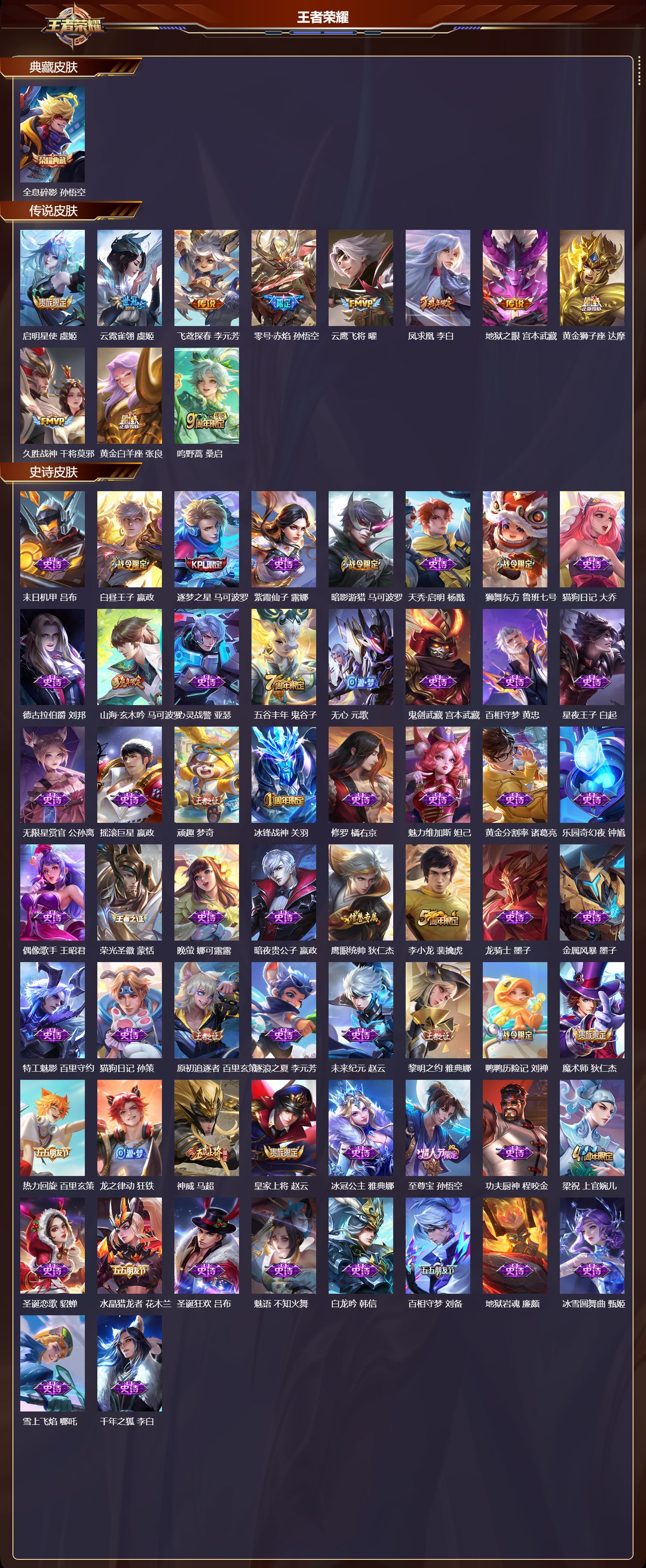 安卓qq/荣耀王者/285皮肤/127英雄/1典藏/0珍品无双/0无双/0珍品传说/11传说/79史诗/9稀有英雄【1 典藏皮肤】全息碎影 孙悟空【11 传说皮肤】启明星使 虞姬云霓雀翎 虞姬飞鸢探春 李元芳零号·赤焰 孙悟空云鹰飞将 曜凤求凰 李白地狱之眼 宫本武藏黄金狮子座 达摩久胜战神 干将莫邪黄金白羊座 张良鸣野蒿 桑启【79 史诗皮肤】末日机甲 吕布白昼王子 嬴