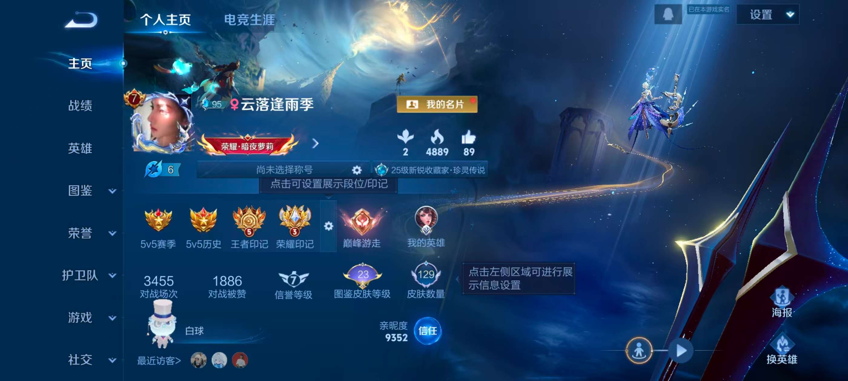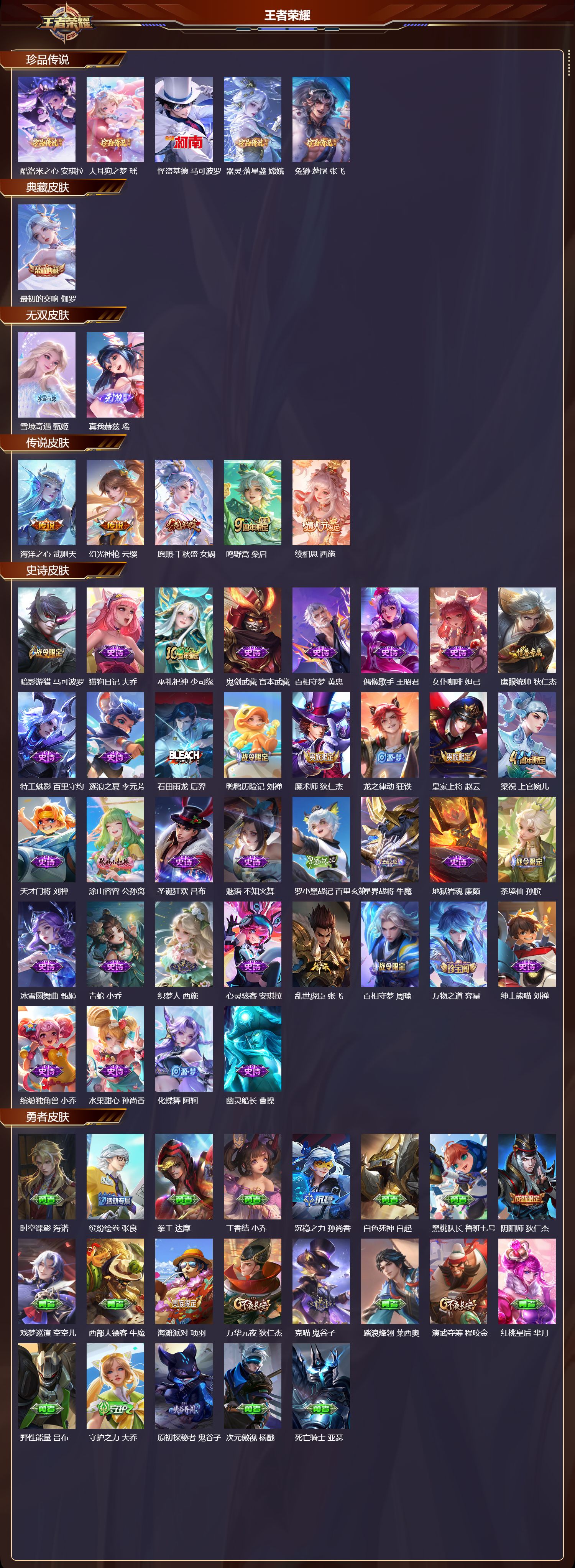 安卓qq/荣耀王者/129皮肤/107英雄/1典藏/0珍品无双/2无双/5珍品传说/5传说/36史诗/5稀有英雄【5 珍品传说】酷洛米之心 安琪拉大耳狗之梦 瑶怪盗基德 马可波罗器灵·落星盏 嫦娥兔狲·蓬尾 张飞【1 典藏皮肤】最初的交响 伽罗【2 无双皮肤】雪境奇遇 甄姬真我赫兹 瑶【5 传说皮肤】海洋之心 武则天幻光神呛 云缨愿照·千秋盛 女娲鸣野蒿