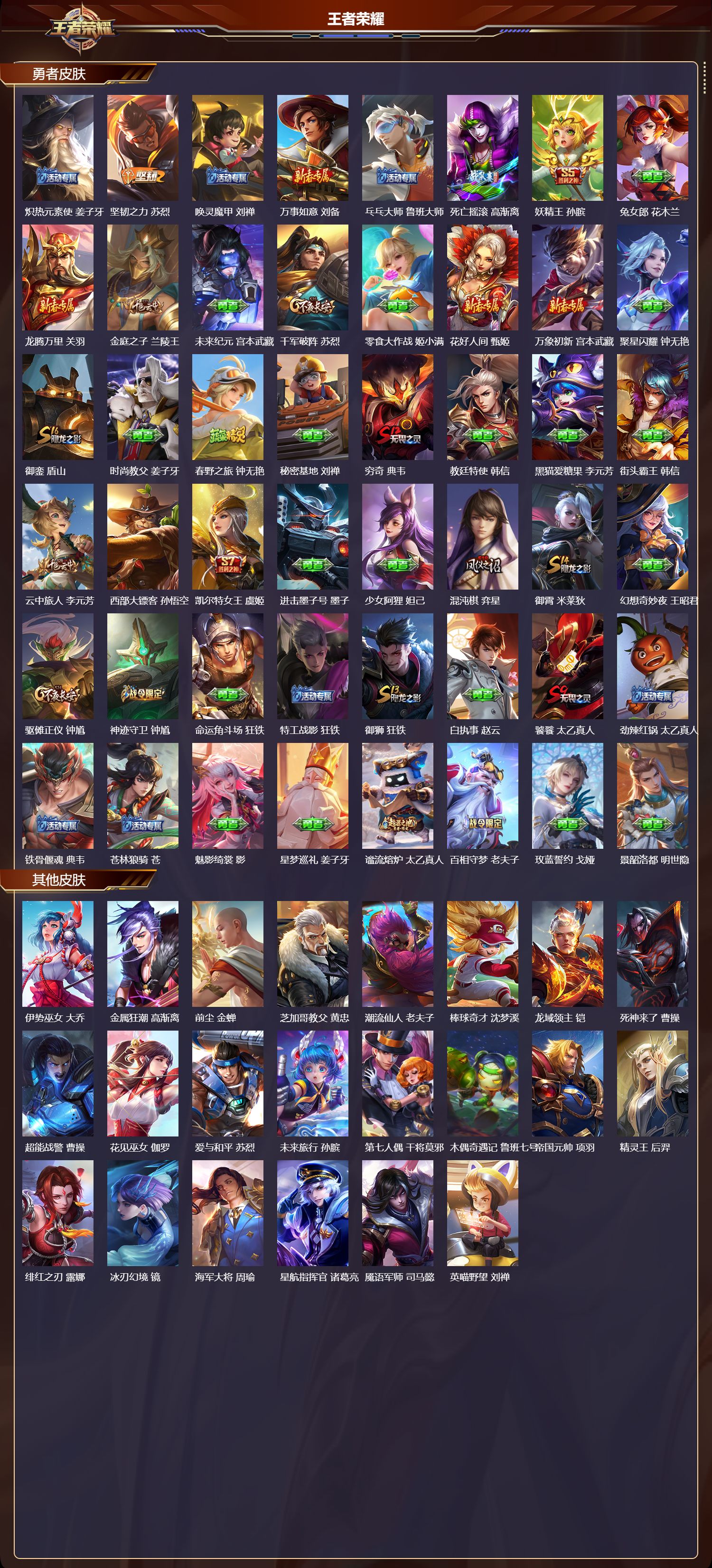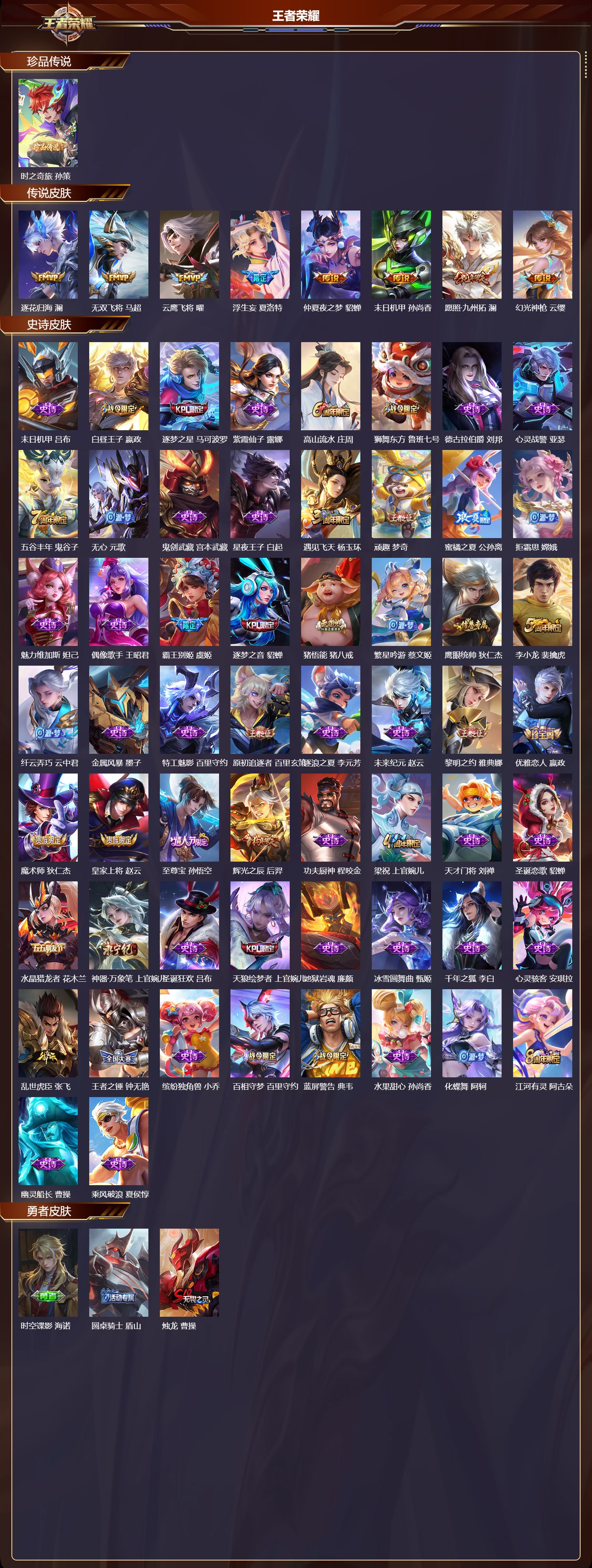 安卓qq/永恒钻石/251皮肤/124英雄/0典藏/0珍品无双/0无双/1珍品传说/8传说/58史诗/8稀有英雄【1 珍品传说】时之奇旅 孙策【8 传说皮肤】逐花归海 澜无双飞将 马超云鹰飞将 曜浮生妄 夏洛特仲夏夜之梦 貂蝉末日机甲 孙尚香愿照·九州拓 澜幻光神呛 云缨【58 史诗皮肤】末日机甲 吕布白昼王子 嬴政逐梦之星 马可波罗紫霞仙子 露娜高山