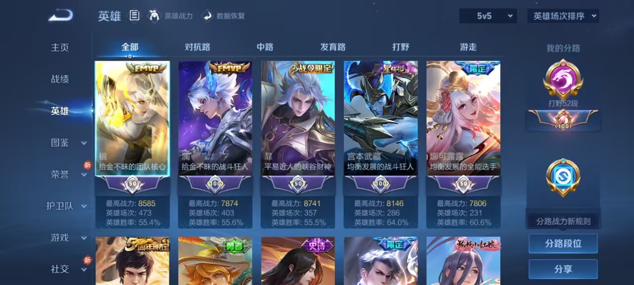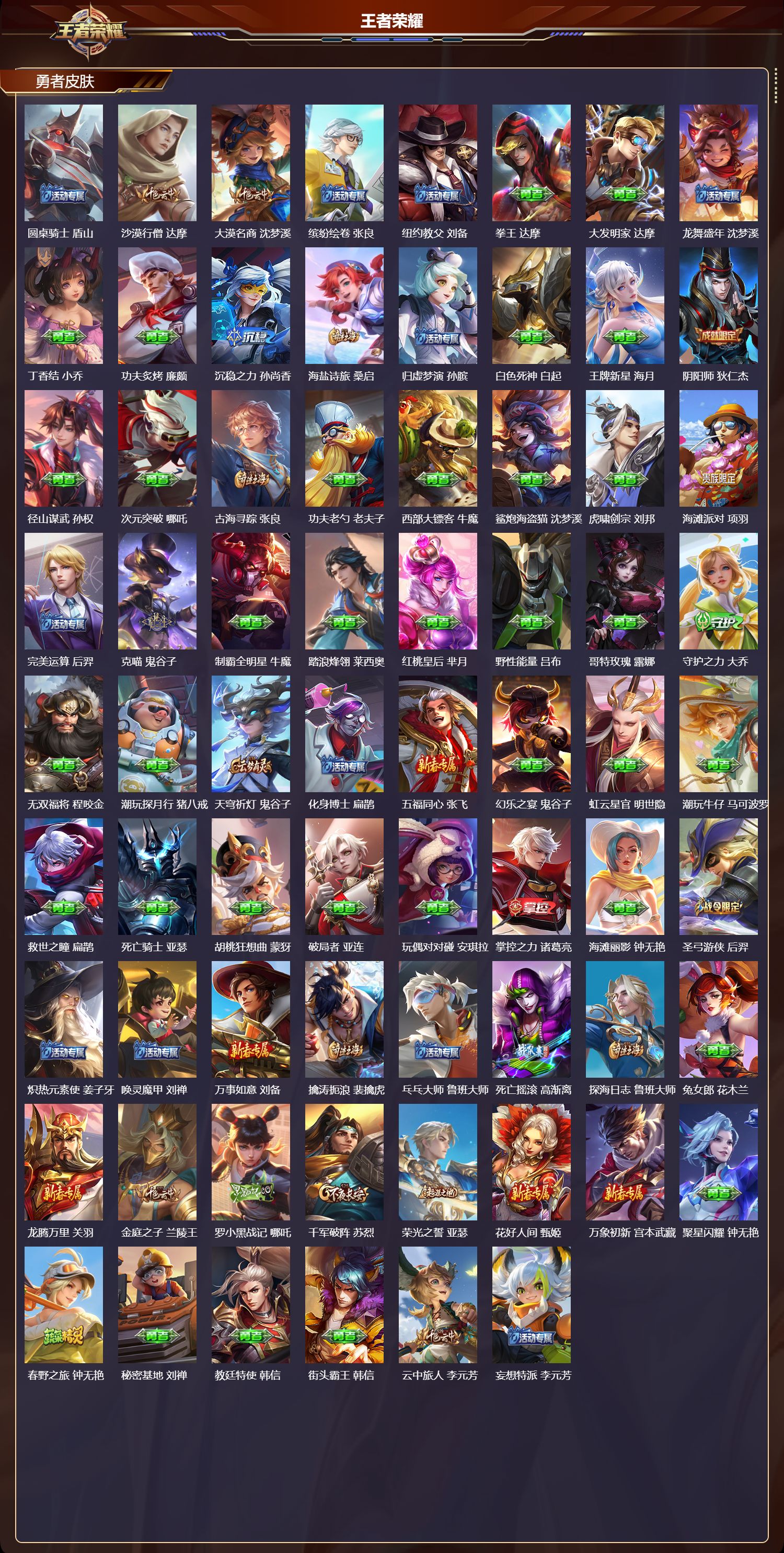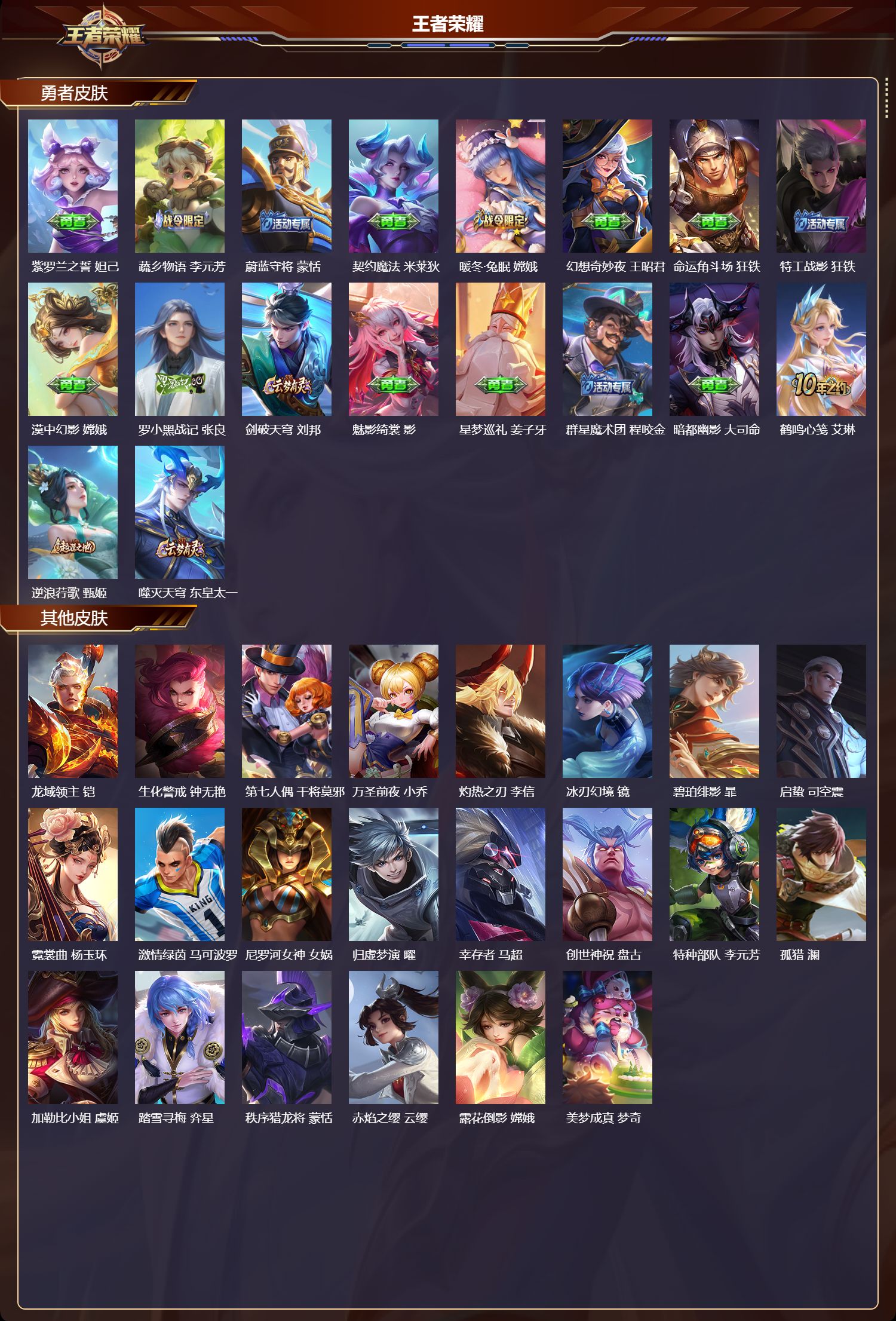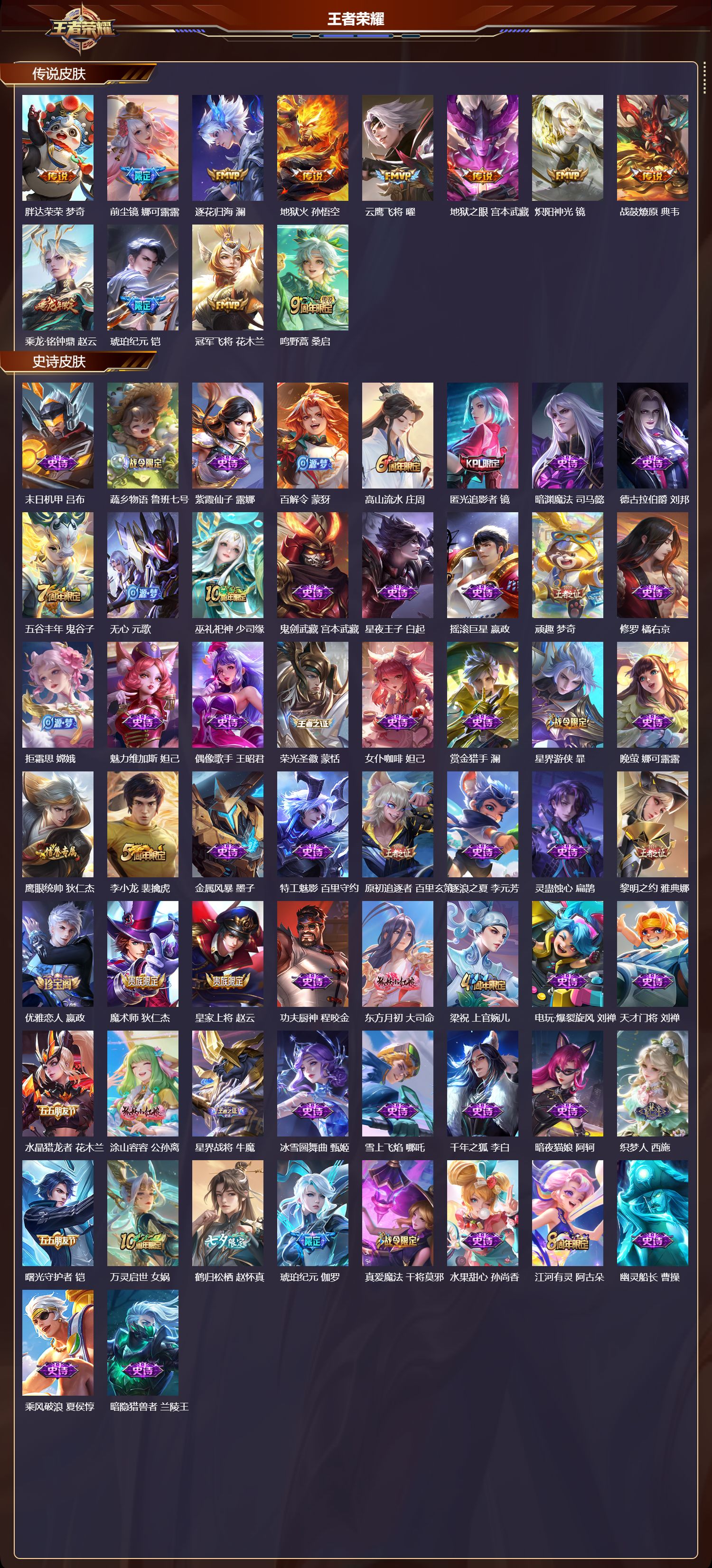 安卓qq/绝世王者/183皮肤/127英雄/0典藏/0珍品无双/0无双/0珍品传说/12传说/58史诗/9稀有英雄【12 传说皮肤】胖达荣荣 梦奇前尘镜 娜可露露逐花归海 澜地狱火 孙悟空云鹰飞将 曜地狱之眼 宫本武藏炽阳神光 镜战鼓燎原 典韦乘龙·铭钟鼎 赵云琥珀纪元 铠冠军飞将 花木兰鸣野蒿 桑启【58 史诗皮肤】末日机甲 吕布蔬乡物语 鲁班七号紫霞仙子 露娜百解