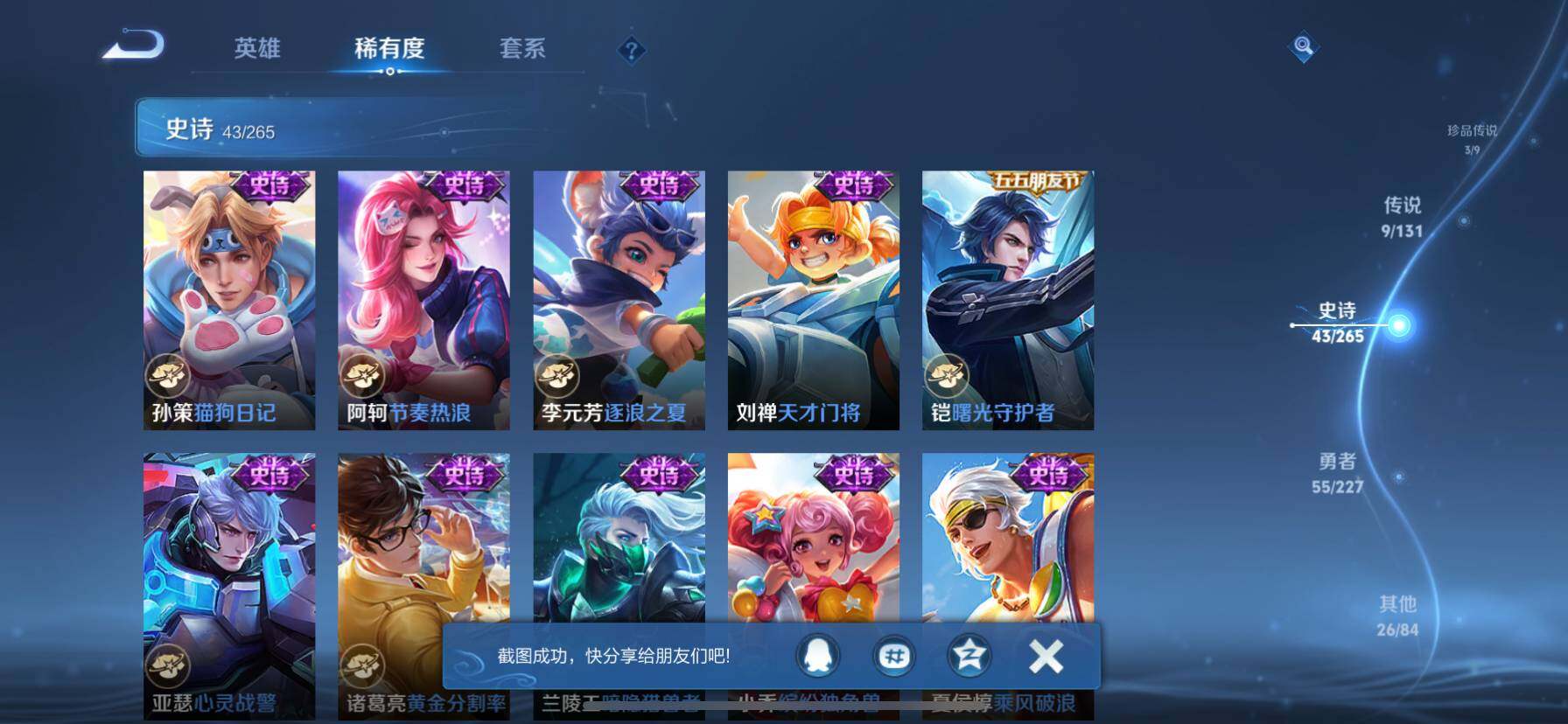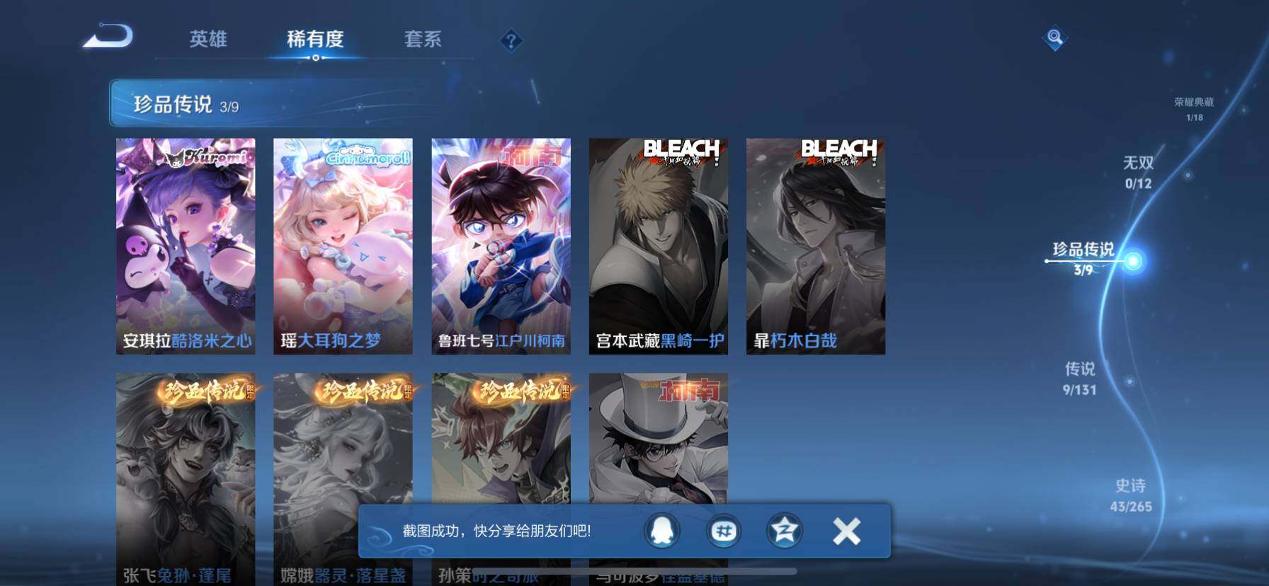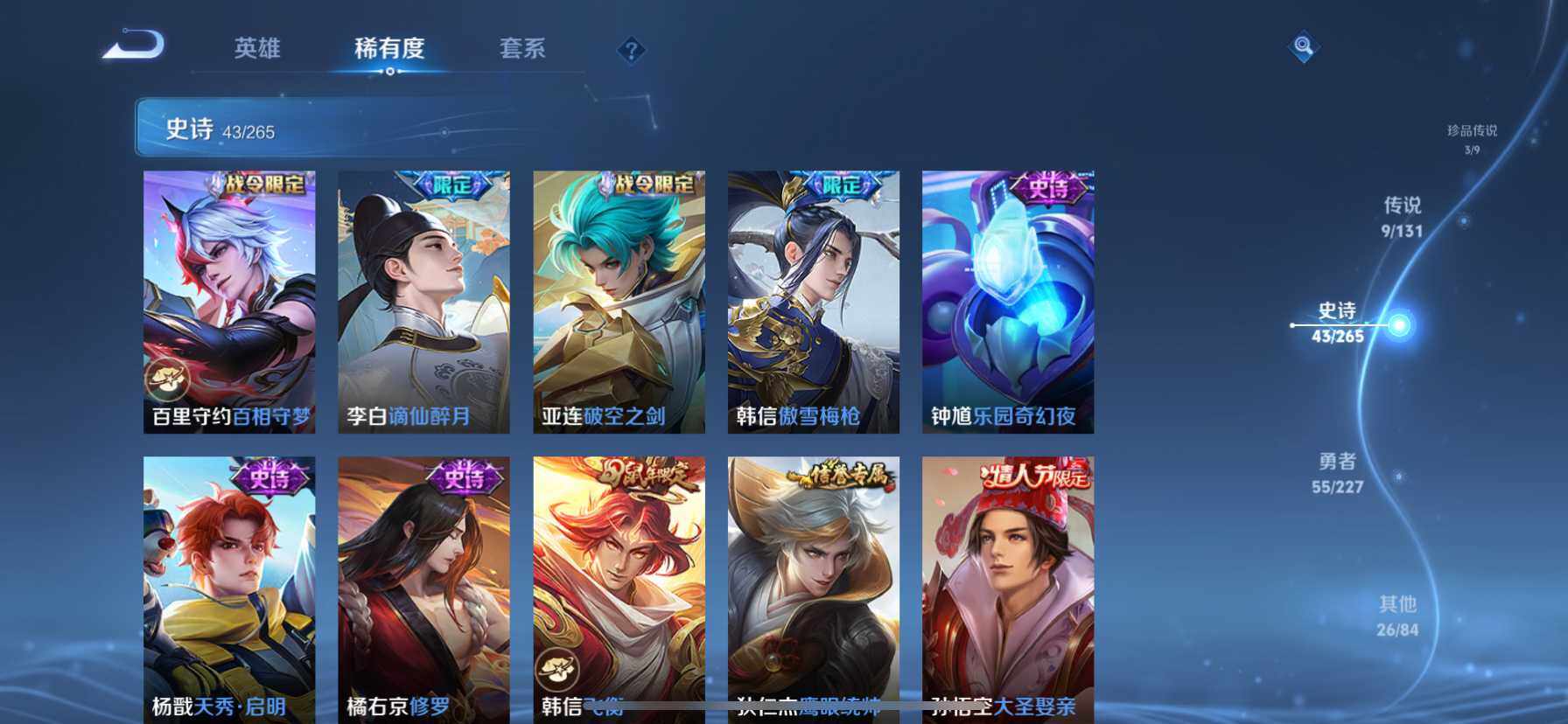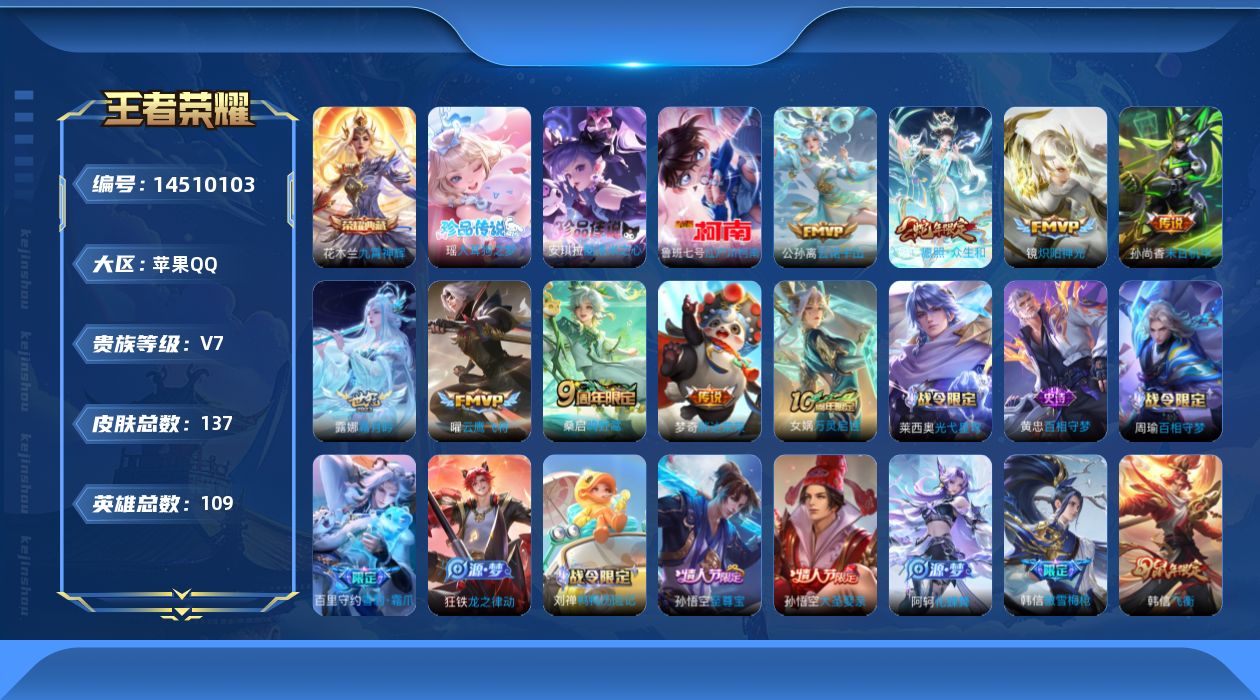 [14510103]苹果q-v7-至尊星耀iv段位-109英雄-137皮肤-1典藏皮肤-3珍品传说-9传说-43史诗 【荣耀典藏】:花木兰九霄神辉 【珍品传说】:鲁班七号江户川柯南,瑶大耳狗之梦,安琪拉酷洛米之心 【传说皮肤】:后羿神树通天,公孙离云诺千山,妲己愿照众生和,桑启鸣野蒿,露娜霜月吟,镜炽阳神光,曜云鹰飞将,梦奇胖达荣荣,孙尚香末日机甲 【限定皮肤】:虞姬夏日便利店,姜子牙天穹之誓,李白谪仙醉月,狄仁杰阴阳师,赵云皇家上将,孙尚香蔷薇恋人,狄仁杰魔术师,项羽海滩派对,韩信飞衡,韩信傲雪梅呛,孙悟空至尊宝,孙悟空大圣娶亲,西施玲珑珍味,沈梦溪龙舞盛年 【年限皮肤】:韩信飞衡 【赛季限定】:姜子牙天穹之誓 【战令限定】:虞姬夏日便利店,西施玲珑珍味 【史诗皮肤】:露娜紫霞仙子,赵云皇家上将,貂蝉圣诞恋歌,狄仁杰魔术师,宫本武藏鬼剑武藏,孙尚香蔷薇恋人,孙尚香水果甜心,嬴政摇滚巨星,妲己魅力维加斯,墨子金属风暴,李白千年之狐,孙悟空至尊宝,花木兰水晶猎龙者,夏侯惇乘风破浪,小乔缤纷独角兽,兰陵王暗隐猎兽者,诸葛亮黄金分割率,亚瑟心灵战警,铠曙光守护者,刘禅天才门将,李元芳逐浪之夏,阿轲节奏热浪,孙策猫狗日记,孙悟空大圣娶亲,狄仁杰鹰眼统帅,韩信飞衡,橘右京修罗,杨戬天秀启明,钟馗乐园奇幻夜,韩信傲雪梅呛,亚连破空之剑,李白谪仙醉月,百里守约百相守梦,孙膑茶境仙,阿轲化蝶舞,刘禅鸭鸭历险记,狂铁龙之律动,百里守约雪豹霜爪,周瑜百相守梦,黄忠百相守梦,莱西奥光弋星穹,女娲万灵启世,少司缘巫礼祀神 【其他皮肤】:项羽海滩派对,韩信教廷特使,韩信街头霸王,程咬金星际陆战队,妲己少女阿狸,典韦黄金武士,甄姬花好人间,后羿阿尔法小队,狄仁杰阴阳师,刘备纽约教父,关羽龙腾万里,钟无艳海滩丽影,狂铁命运角斗场,孙尚香沉稳之力,诸葛亮掌控之力,李白敏锐之力,小乔丁香结,鲁班大师乓乓大师,典韦铁甲之心,海月幻泉雾影,西施玲珑珍味,沈梦溪龙舞盛年,姜子牙天穹之誓,虞姬夏日便利店,孙悟空神迹守卫,盘古敬我三分,东皇太一噬灭天穹,老夫子百相守梦,干将莫邪雾都夜雨,苍苍林狼骑,太乙真人谧流熔炉,典韦铁骨偃魂,马超访茗客,西施雪境奇遇,达摩爆裂喵拳,明世隐景韶洛都,戈娅玫蓝誓约,刘备浪漫序章,钟馗虚灵犬护,沈梦溪鸭鸭历险记,苏烈春野闲踪,张良灵野札记,阿古朵布丁狗之约,露娜命运加冕,姬小满小满鸭,白起死霸装