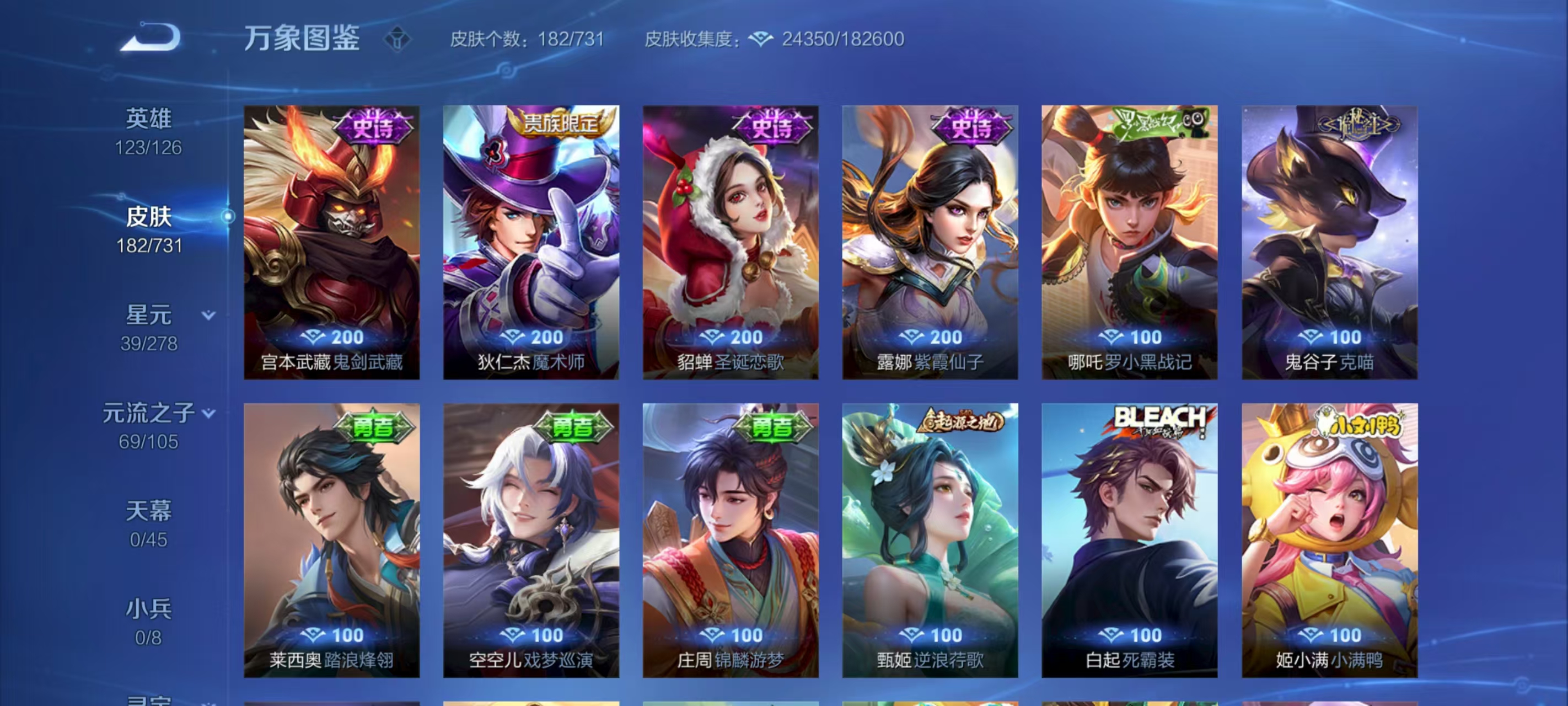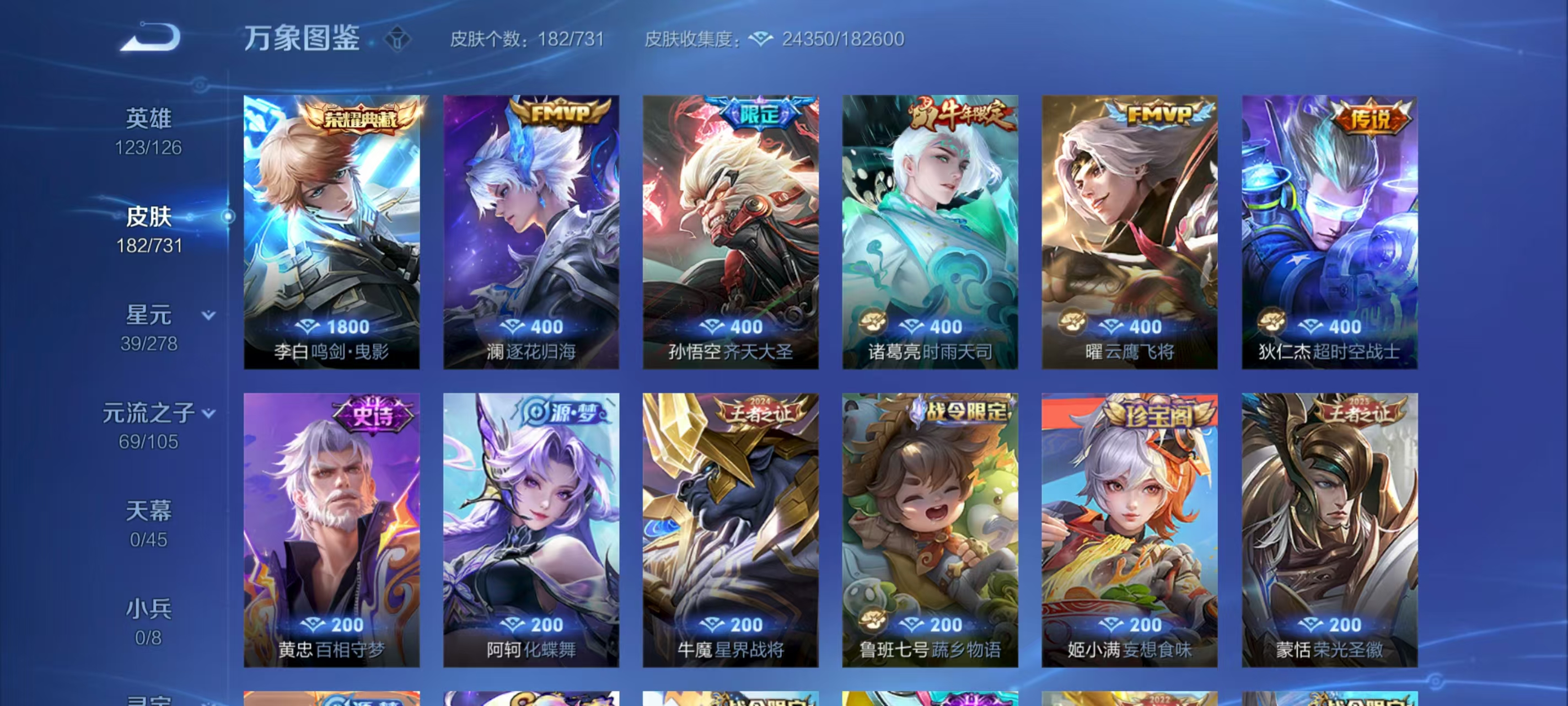 _2301714-实名:可修改贵族等级:v5英雄数:123皮肤数:182荣耀水晶:鸣剑·曳影星传说:幽冥之眼星际治安官传说皮:云鹰飞将超时空战士-狄仁杰澜逐花归海限定皮:李小龙时雨天司飞衡孙行者五谷丰年齐天大圣亮点:【精品号手慢无】1典藏2星传说鸣剑曳影热门限定齐天大圣时雨天司云鹰飞将新年限定传说澜逐花归海