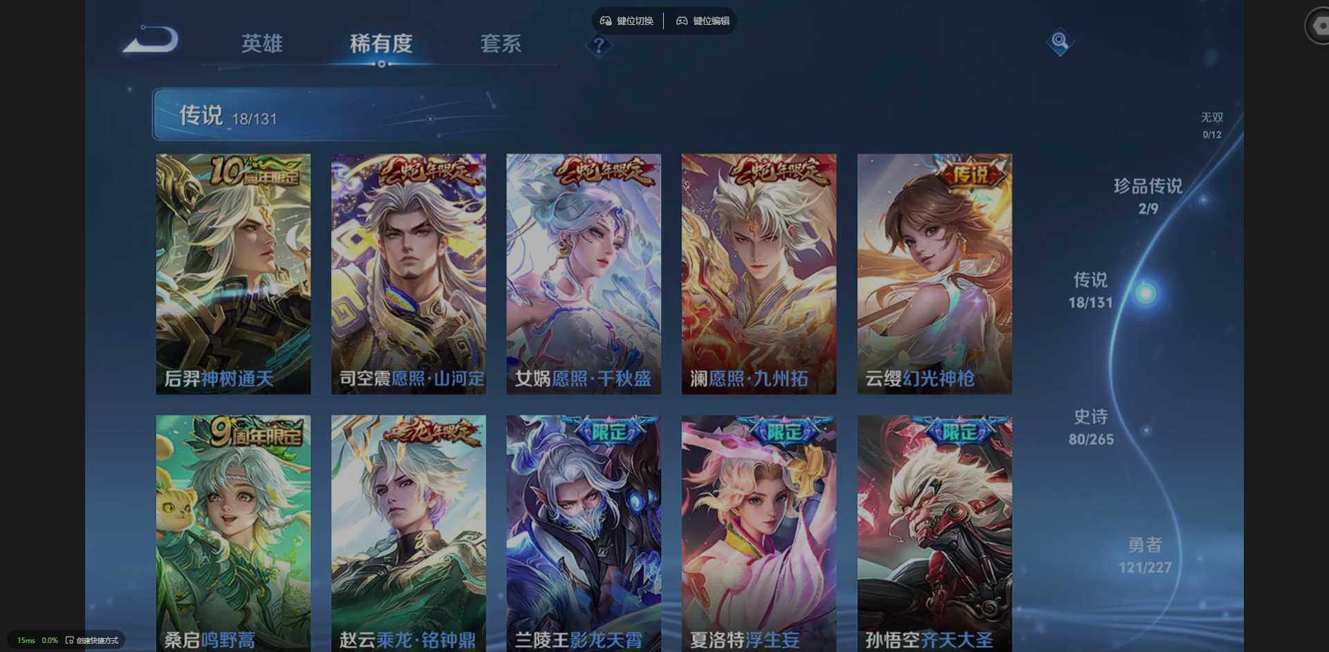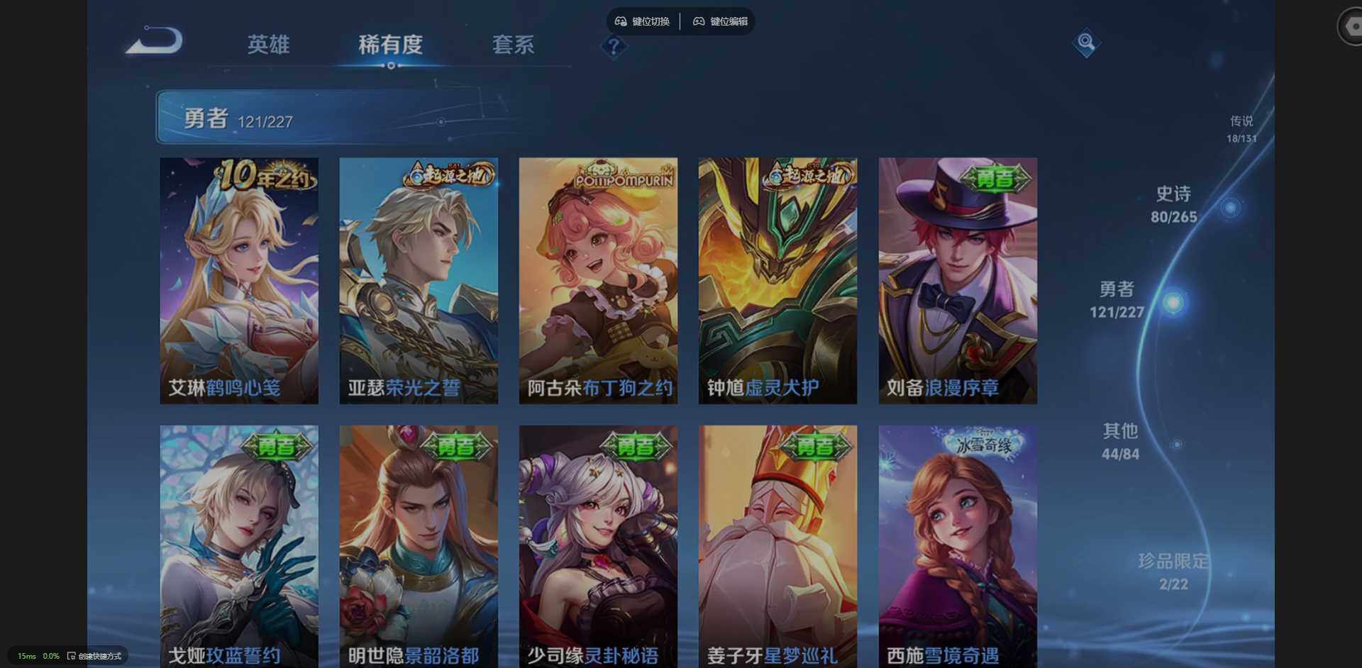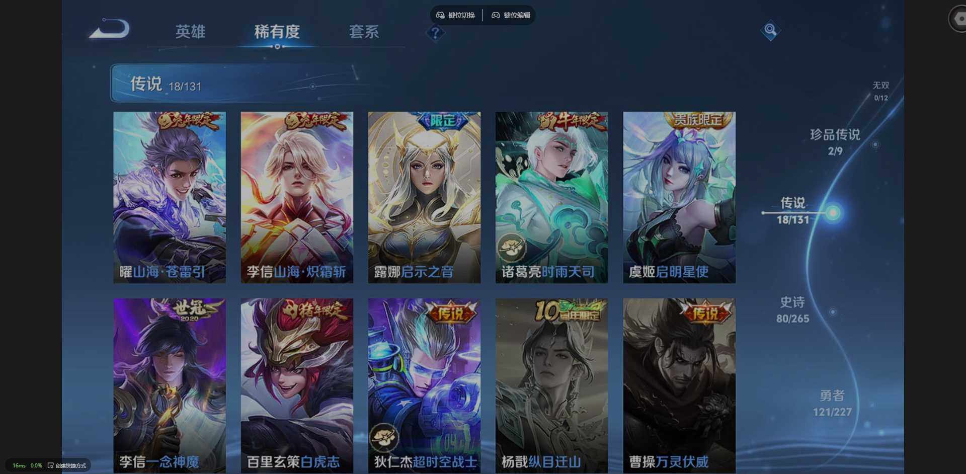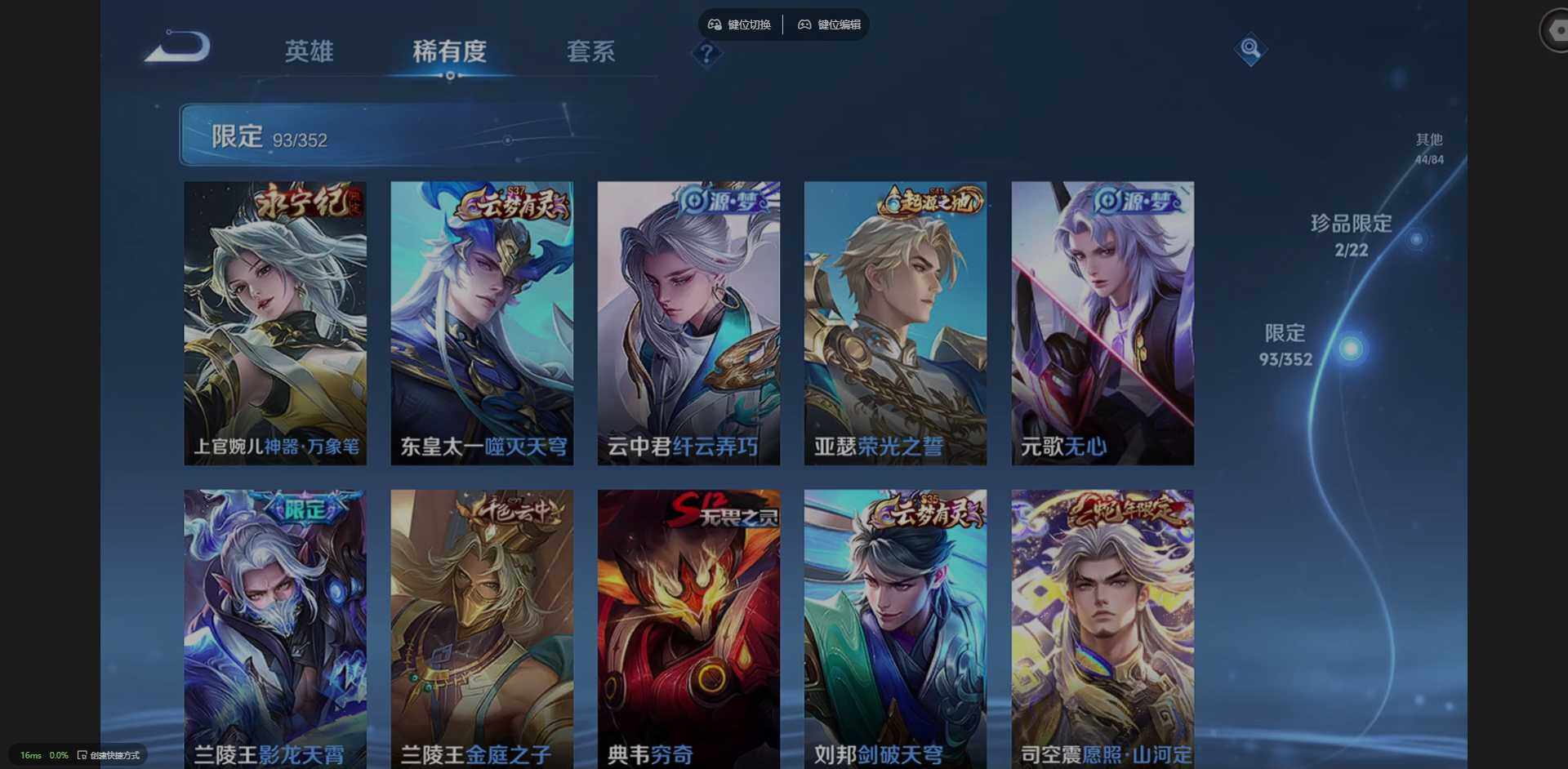 127英雄-266皮肤-实名: 可修改 贵族等级: v8 英雄数: 127 皮肤数: 266 荣耀水晶: 弑呛猎影 珍品传说: 时之奇旅-孙策器灵·落星盏 星传说: 星际治安官 传说皮: 一念神魔超时空战士-狄仁杰山海·炽霜斩山海·苍雷引浮生妄乘龙·铭钟鼎幻光神呛神树通天 限定皮: 遇见飞天李小龙时雨天