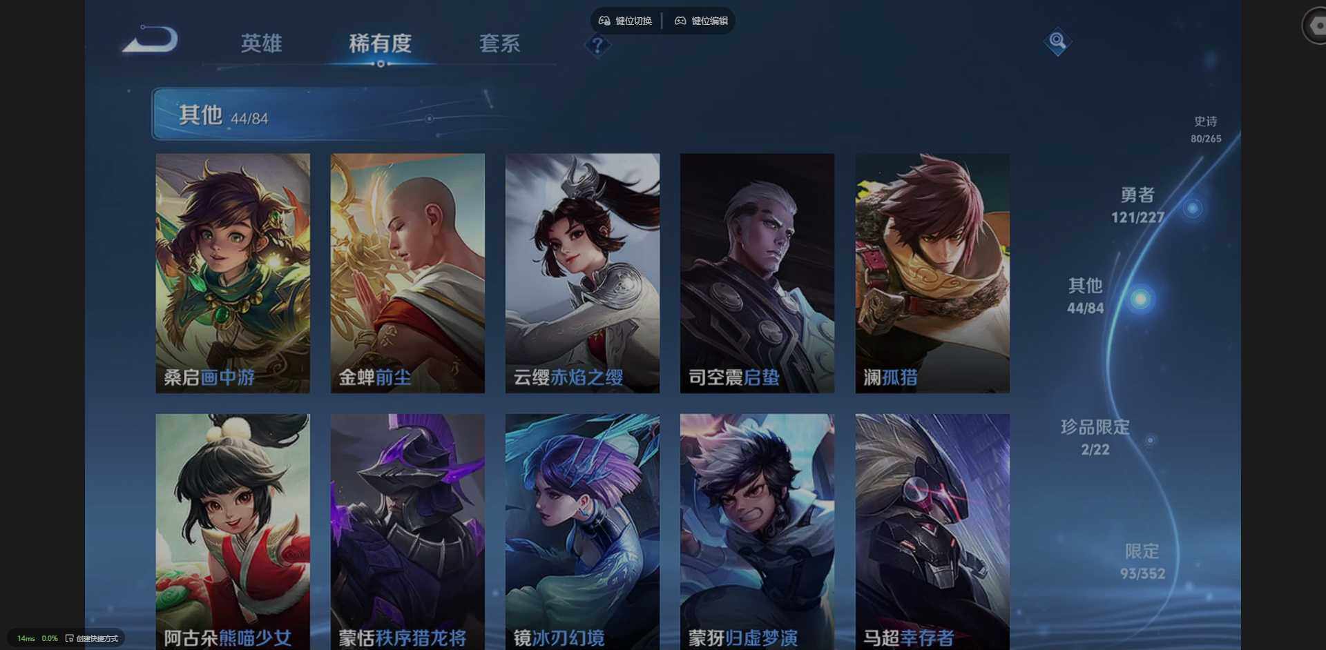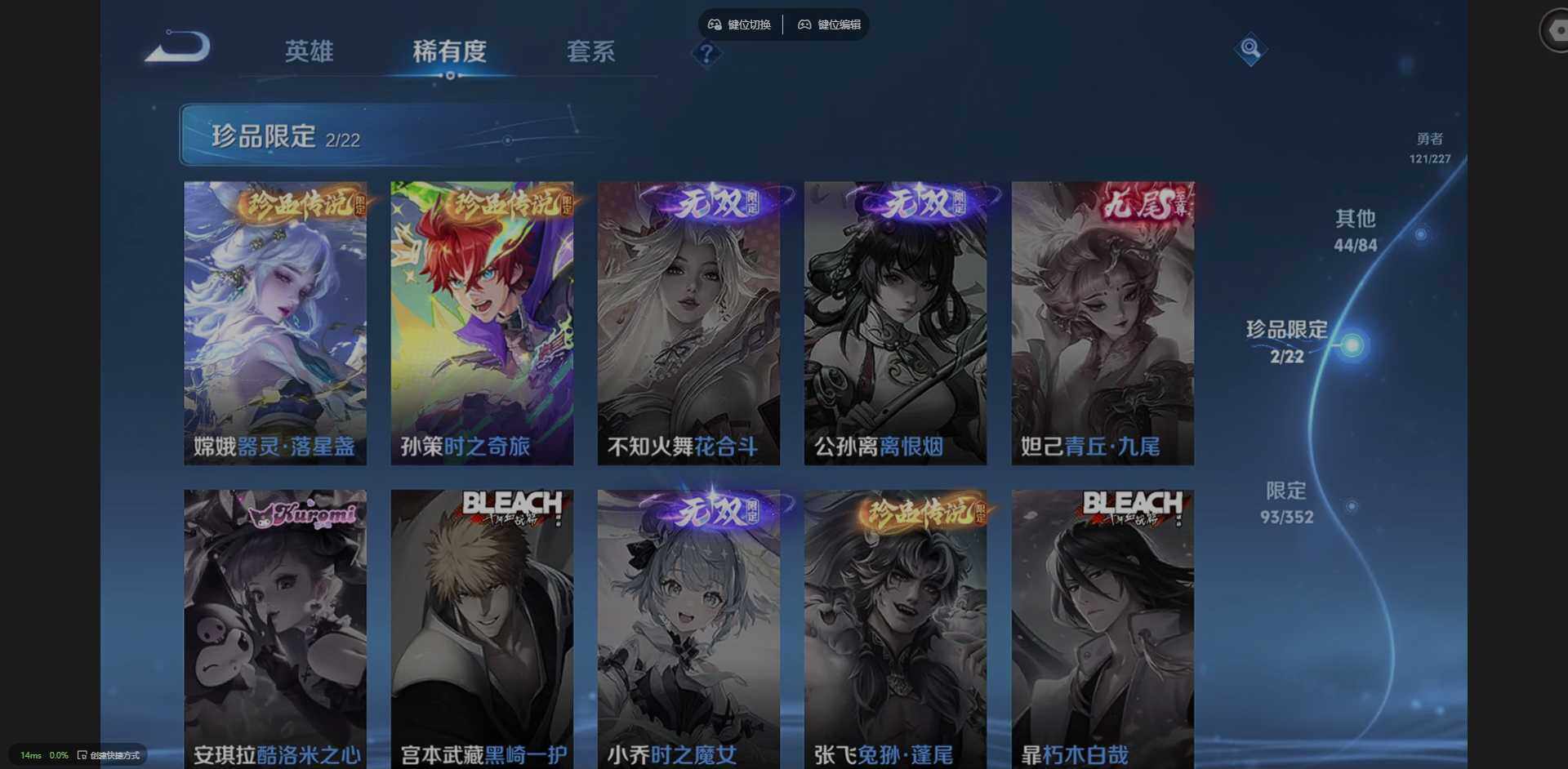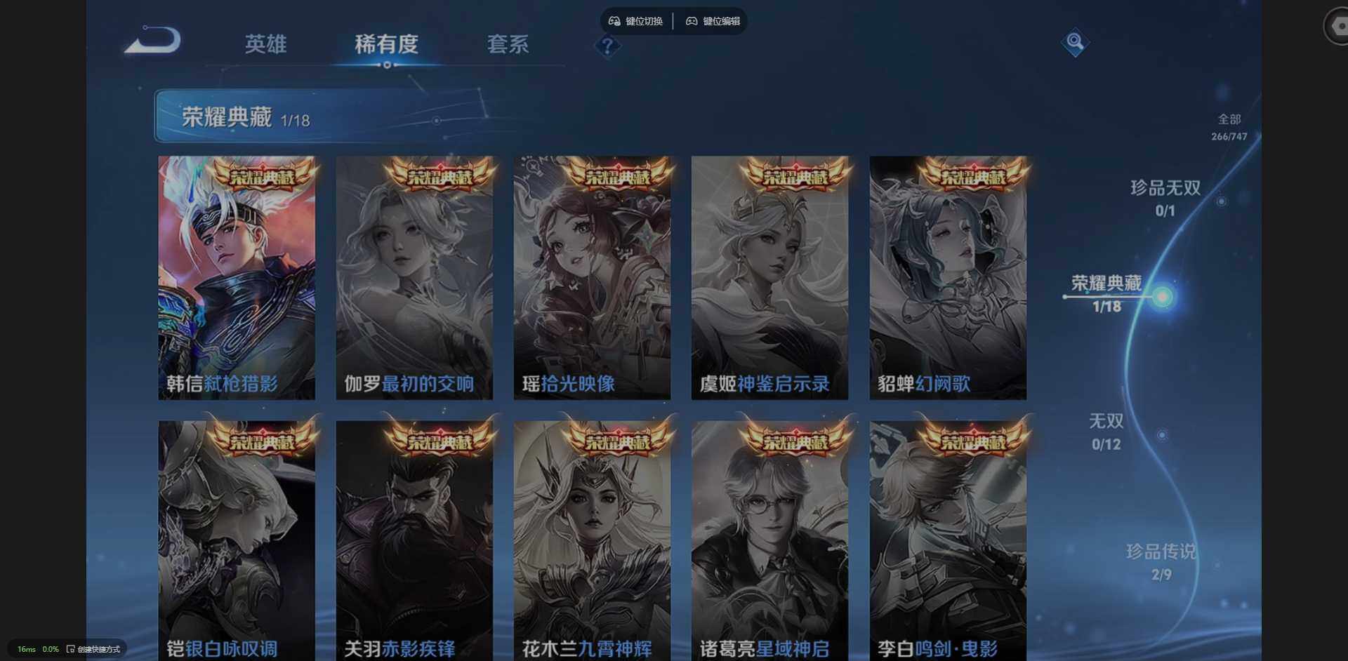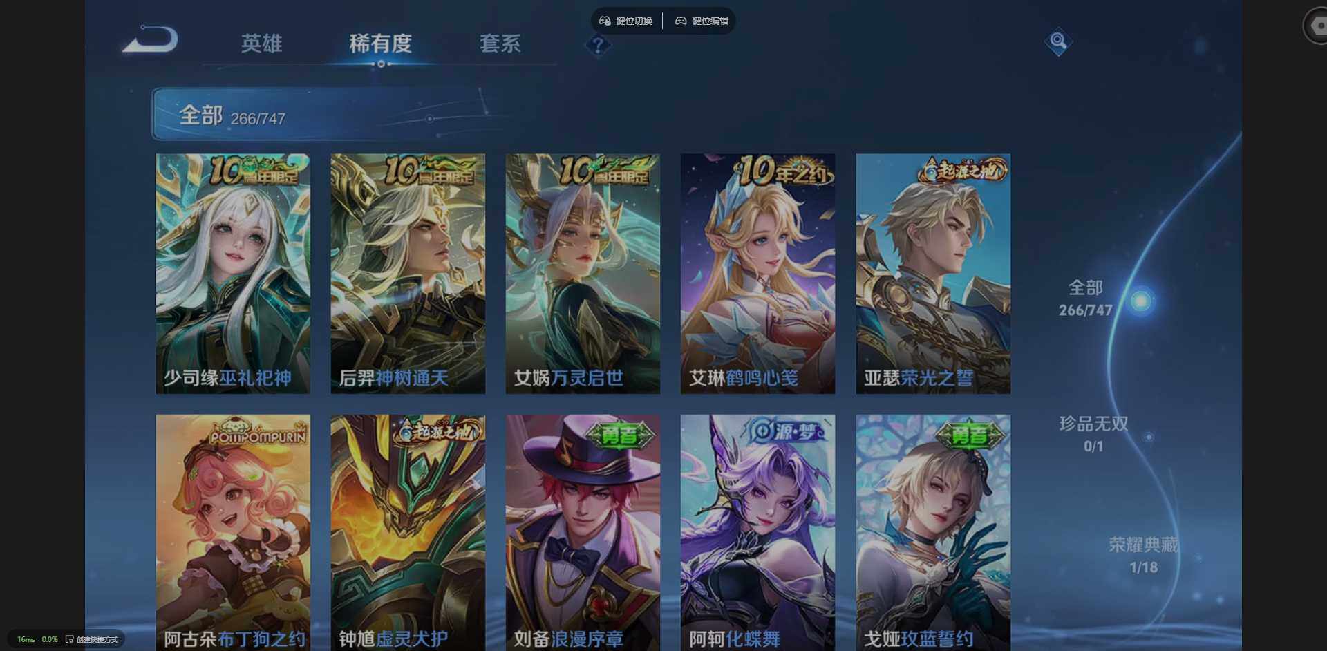 127英雄-266皮肤-实名: 可修改 贵族等级: v8 英雄数: 127 皮肤数: 266 荣耀水晶: 弑呛猎影 珍品传说: 时之奇旅-孙策器灵·落星盏 星传说: 星际治安官 传说皮: 一念神魔超时空战士-狄仁杰山海·炽霜斩山海·苍雷引浮生妄乘龙·铭钟鼎幻光神呛神树通天 限定皮: 遇见飞天李小龙时雨天