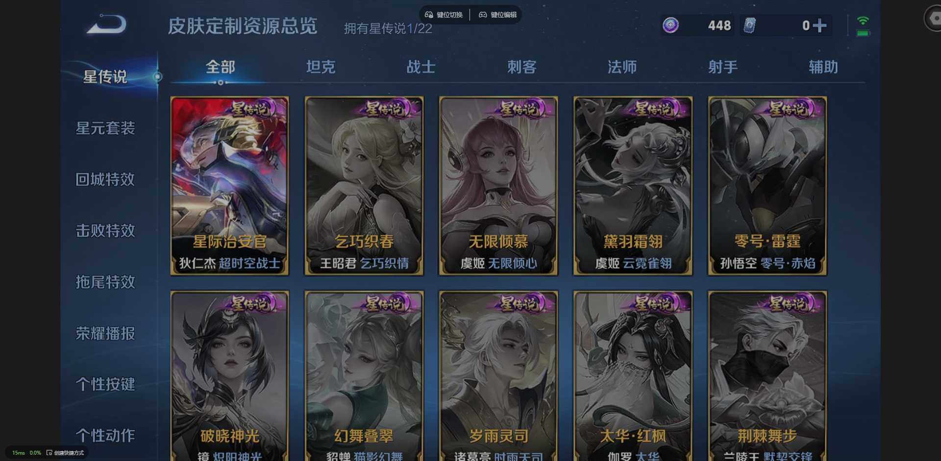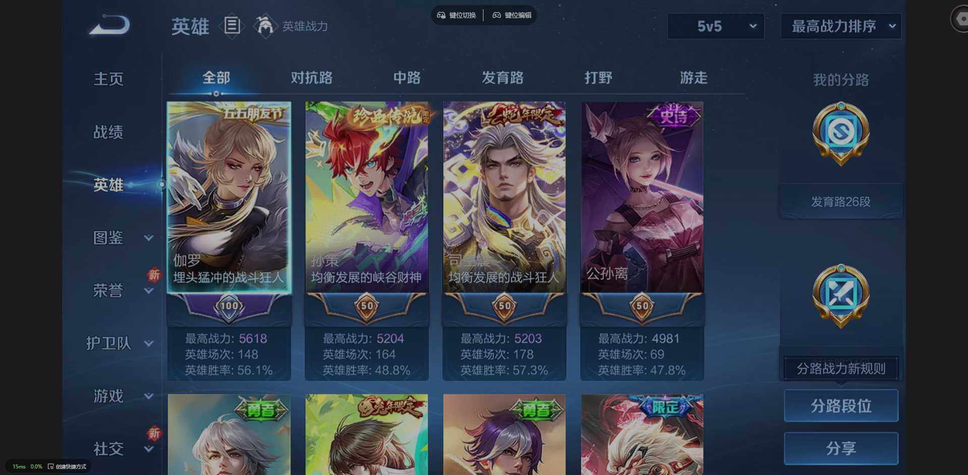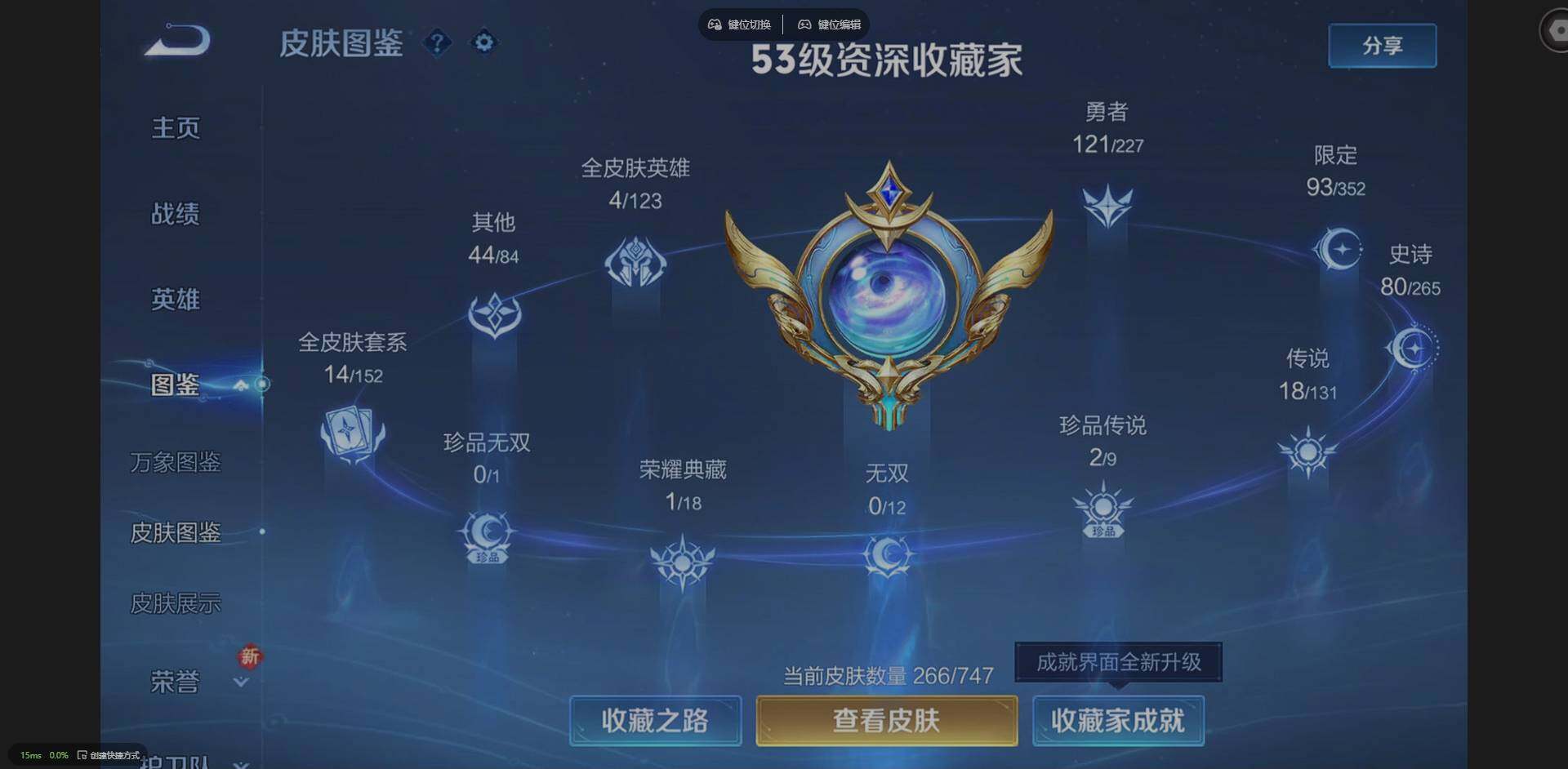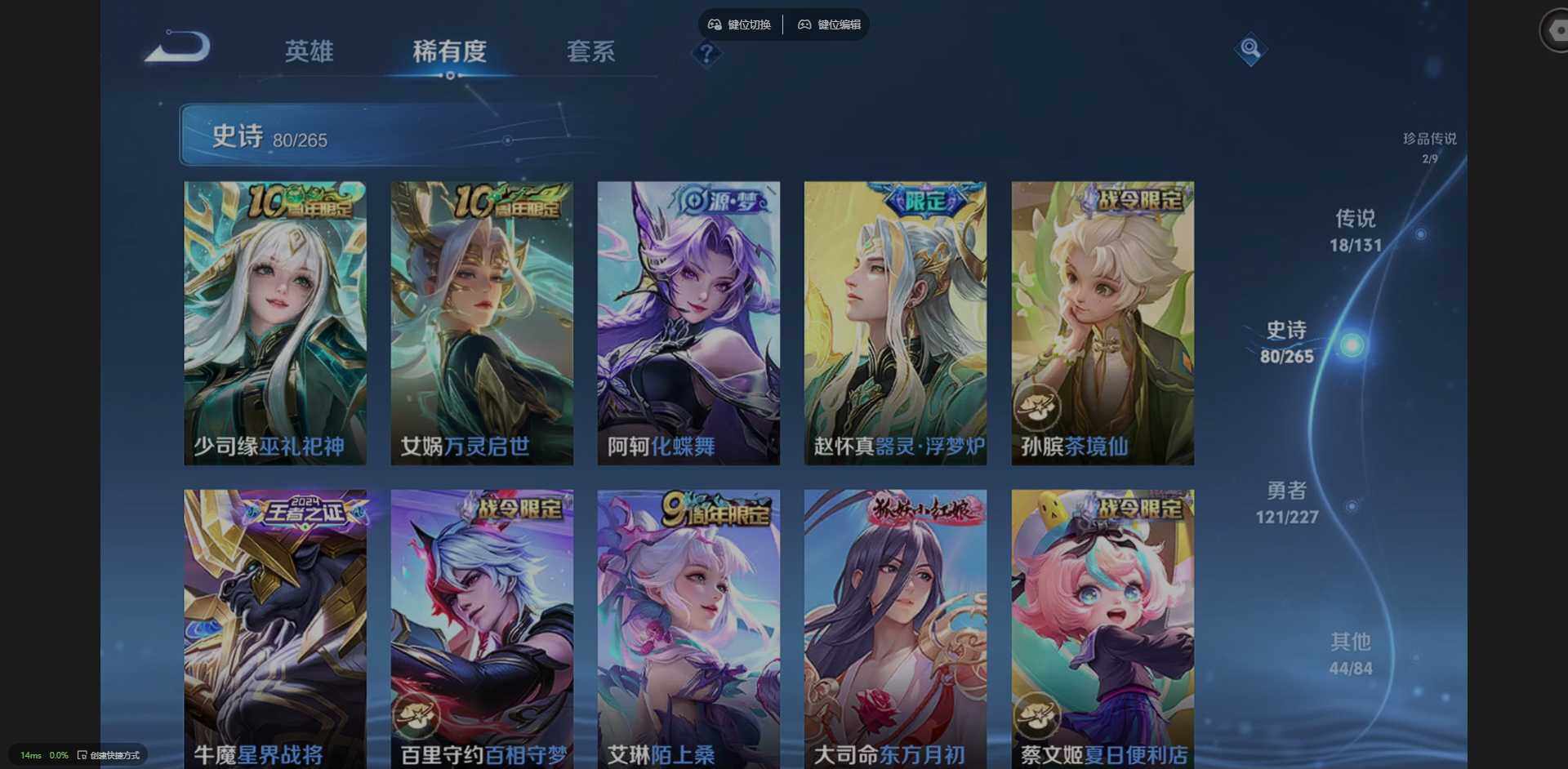 127英雄-266皮肤-实名: 可修改 贵族等级: v8 英雄数: 127 皮肤数: 266 荣耀水晶: 弑呛猎影 珍品传说: 时之奇旅-孙策器灵·落星盏 星传说: 星际治安官 传说皮: 一念神魔超时空战士-狄仁杰山海·炽霜斩山海·苍雷引浮生妄乘龙·铭钟鼎幻光神呛神树通天 限定皮: 遇见飞天李小龙时雨天