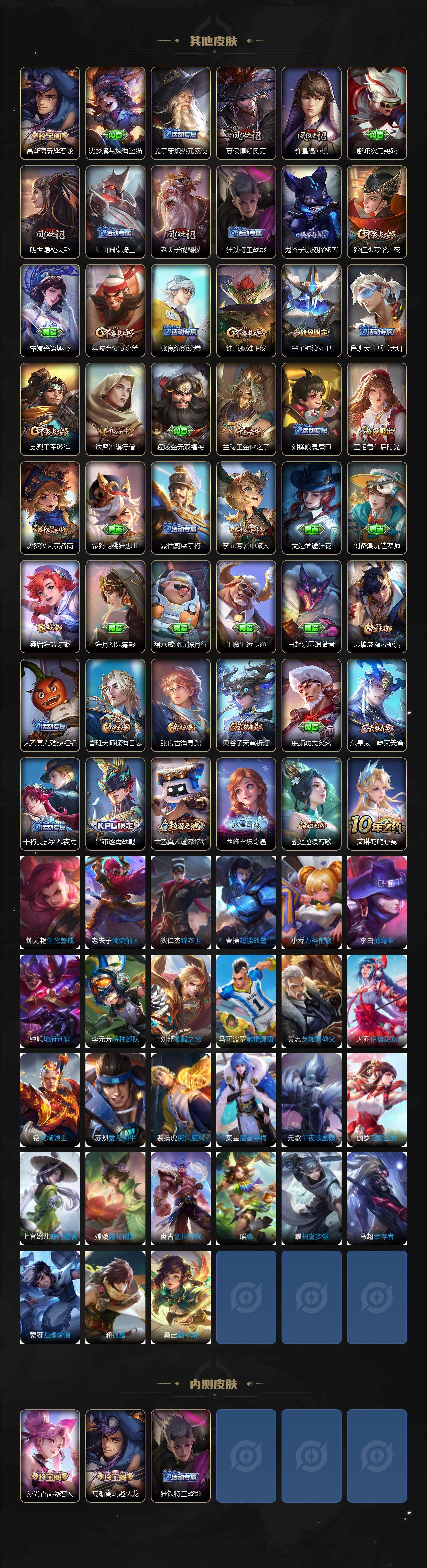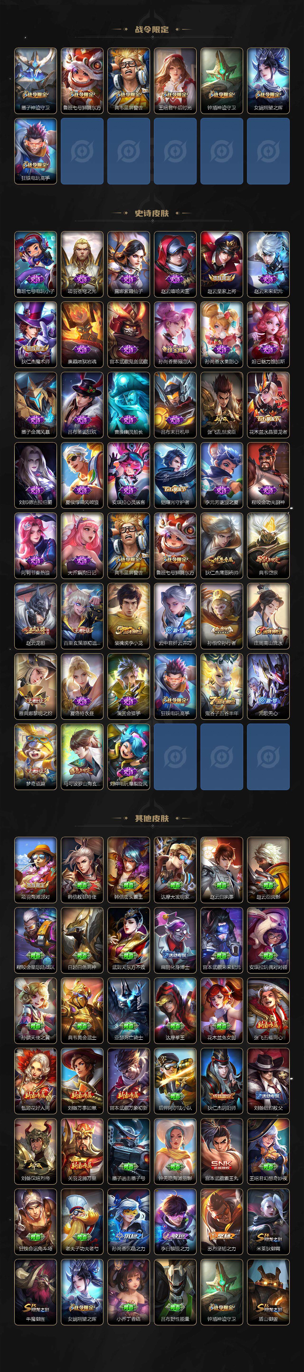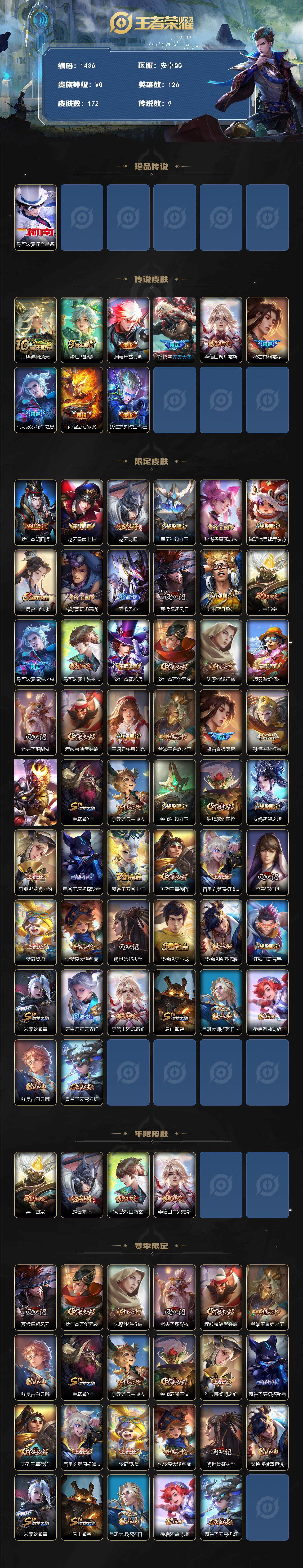 126英雄-172皮肤-贵族0/皮肤172/传说9/史诗45/英雄126/怪盗基德 马可波罗/神树通天 后羿/鸣野蒿 桑启/电玩·雷克斯 澜/齐天大圣 孙悟空/山海·炽霜斩 李信/枫霜尽 橘右京/深海之息 马可波罗/地狱火 孙悟空/超时空战士 狄仁杰/阴阳师 狄仁杰/皇家上将 赵云/龙胆 赵云/神迹守卫 墨子/蔷薇恋人 孙尚香/狮舞东方 鲁班七号/高山流水 庄周/玩趣恶龙 高渐离/无心 元歌/朔风刀 夏侯惇/蓝屏警告