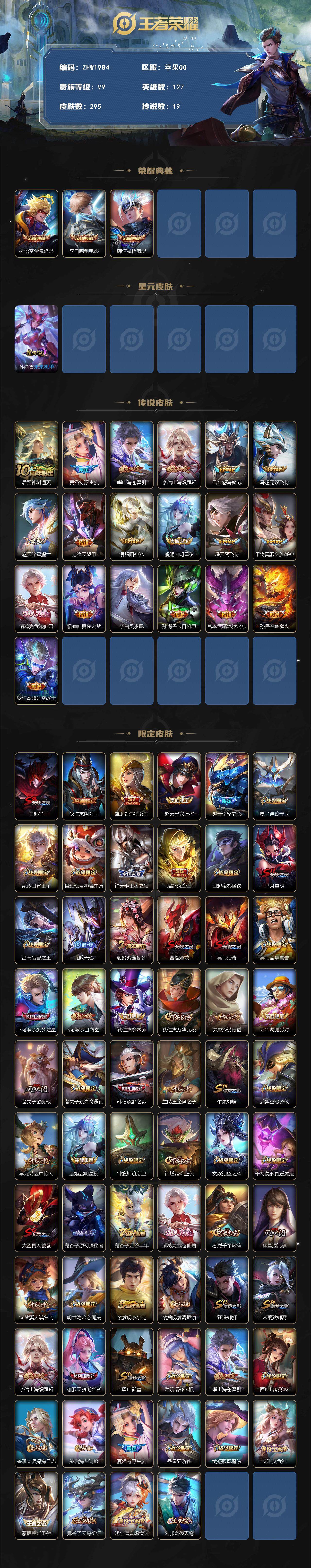 127英雄-295皮肤-【店主推荐捡漏号!可直接换绑】苹果q-v9-最强王者段位-127英雄-295皮肤-3典藏皮肤-19传说-72史诗 【英雄全皮】:孙权全皮,鬼谷子全皮,蒙恬全皮,影全皮 【荣耀典藏】:孙悟空全息碎影,李白鸣剑曳影,韩信弑呛猎影 【传说皮肤】:后羿神树通天,夏洛特浮生妄,曜山海苍雷引,李信山海炽霜斩,吕
