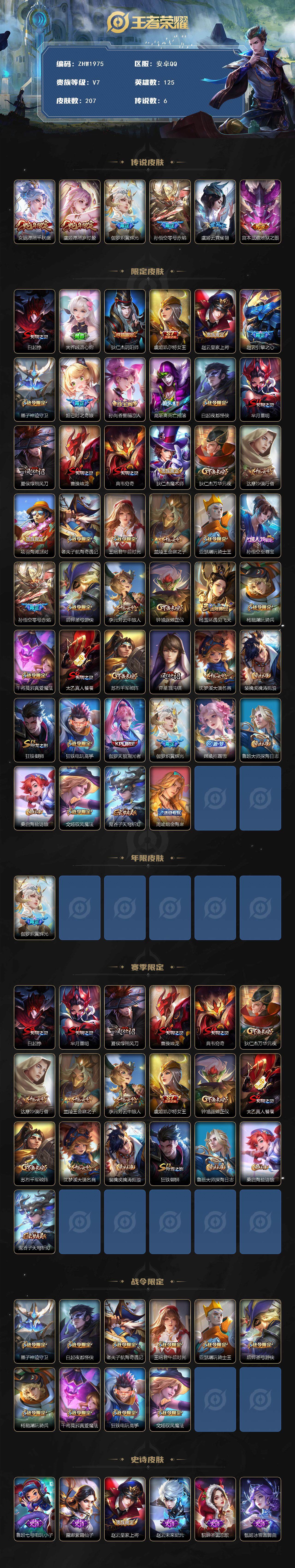 [14513170]【店主推荐捡漏号!可直接换绑】安卓q-v7-最强王者段位-125英雄-207皮肤-6传说-66史诗 【传说皮肤】:女娲愿照千秋盛,虞姬愿照岁时盈,伽罗炽翼辉光,孙悟空零号赤焰,虞姬云霓雀翎,宫本武藏地狱之眼 【限定皮肤】:白起狰,大乔绒语心约,狄仁杰阴阳师,虞姬凯尔特女王,赵云皇家上将,赵云引擎之心,墨子神迹守卫,妲己时之奇旅,孙尚香蔷薇恋人,高渐离死亡摇滚,白起夜都怪侠,芈月重明,夏侯惇朔风刀,曹操烛龙,典韦穷奇,狄仁杰魔术师,狄仁杰万华元夜,达摩沙漠行僧,项羽海滩派对,老夫子航海奇遇记,王昭君午后时光,兰陵王金庭之子,亚瑟潮玩骑士王,孙悟空至尊宝,孙悟空零号赤焰,后羿圣弓游侠,李元芳云中旅人,钟馗驱傩正仪,杨玉环遇见飞天,杨戬潮玩骑兵,干将莫邪真爱魔法,太乙真人饕餮,苏烈千军破阵,弈星混沌棋,沈梦溪大漠名商,裴擒虎擒涛扼浪,狂铁御狮,狂铁电玩高手,伽罗天狼溯光者,伽罗炽翼辉光,嫦娥拒霜思,鲁班大师探海日志,桑启海盐诗旅,戈娅驭风魔法,鬼谷子天穹祈灯,周瑜熔金海岸 【年限皮肤】:伽罗炽翼辉光 【赛季限定】:白起狰,芈月重明,夏侯惇朔风刀,曹操烛龙,典韦穷奇,狄仁杰万华元夜,达摩沙漠行僧,兰陵王金庭之子,李元芳云中旅人,虞姬凯尔特女王,钟馗驱傩正仪,太乙真人饕餮,苏烈千军破阵,弈星混沌棋,沈梦溪大漠名商,裴擒虎擒涛扼浪,狂铁御狮,鲁班大师探海日志,桑启海盐诗旅,鬼谷子天穹祈灯 【战令限定】:墨子神迹守卫,白起夜都怪侠,老夫子航海奇遇记,王昭君午后时光,亚瑟潮玩骑士王,后羿圣弓游侠,杨戬潮玩骑兵,干将莫邪真爱魔法,狂铁电玩高手,戈娅驭风魔法 【史诗皮肤】:鲁班七号电玩小子,露娜紫霞仙子,赵云皇家上将,赵云未来纪元,貂蝉圣诞恋歌,甄姬冰雪圆舞曲,狄仁杰魔术师,廉颇地狱岩魂,宫本武藏鬼剑武藏,孙尚香蔷薇恋人,孙尚香水果甜心,嬴政暗夜贵公子,嬴政摇滚巨星,妲己魅力维加斯,妲己女仆咖啡,墨子龙骑士,墨子金属风暴,吕布圣诞狂欢,刘禅绅士熊喵,曹操幽灵船长,李白千年之狐,吕布末日机甲,张飞乱世虎臣,韩信白龙吟,孙悟空至尊宝,赵云引擎之心,花木兰水晶猎龙者,刘邦德古拉伯爵,夏侯惇乘风破浪,小乔缤纷独角兽,兰陵王暗隐猎兽者,亚瑟心灵战警,雅典娜冰冠公主,安琪拉心灵骇客,铠曙光守护者,蔡文姬舞动绿茵,李元芳逐浪之夏,程咬金功夫厨神,白起星夜王子,阿轲节奏热浪,杨玉环遇见飞天,孙策猫狗