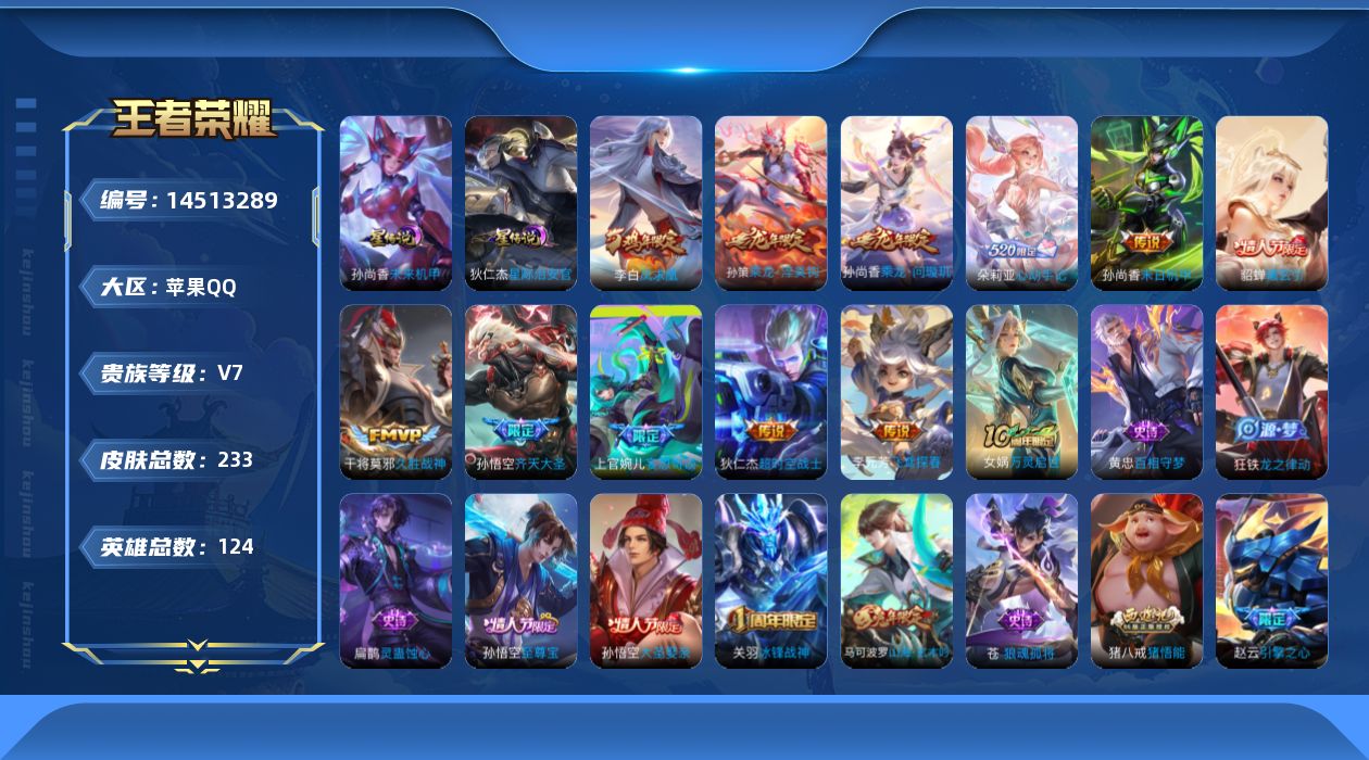 [14513289]【店主推荐捡漏号!可直接换绑/3个市标】:苹果q-v7-最强王者段位-124英雄-233皮肤-12传说-2星元-66史诗 【英雄全皮】:孙权全皮 【传说皮肤】:后羿神树通天,朵莉亚心动手记,貂蝉曦玄引,孙尚香乘龙问璇玑,孙策乘龙淬吴钩,上官婉儿妄想奇谈,孙悟空齐天大圣,李元芳飞鸢探春,干将莫邪久胜战神,李白凤求凰,孙尚香末日机甲,狄仁杰超时空战士 【限定皮肤】:白起狰,姜子牙天穹之誓,狄仁杰阴阳师,小乔纯白花嫁,虞姬凯尔特女王,赵云皇家上将,赵云引擎之心,嬴政优雅恋人,嬴政白昼王子,孙尚香蔷薇恋人,庄周高山流水,孙膑妖精王,扁鹊炼金王,芈月重明,吕布猎兽之王,周瑜真爱至上,元歌无心,夏侯惇朔风刀,甄姬游园惊梦,曹操烛龙,典韦穷奇,马可波罗山海玄木吟,狄仁杰魔术师,狄仁杰万华元夜,达摩沙漠行僧,项羽海滩派对,老夫子醍醐杖,关羽冰锋战神,程咬金演武夺筹,韩信逐梦之影,兰陵王金庭之子,孙悟空至尊宝,孙悟空大圣娶亲,孙悟空齐天大圣,牛魔御旌,李元芳云中旅人,钟馗神迹守卫,钟馗驱傩正仪,杨玉环遇见飞天,雅典娜黎明之约,蔡文姬繁星吟游,太乙真人饕餮,鬼谷子原初探秘者,鬼谷子五谷丰年,苏烈千军破阵,百里玄策原初追逐者,弈星混沌棋,梦奇顽趣,沈梦溪大漠名商,明世隐疑决卦,裴擒虎李小龙,裴擒虎擒涛扼浪,狂铁御狮,米莱狄御霄,云中君纤云弄巧,盾山御銮,猪八戒猪悟能,上官婉儿梁祝,上官婉儿神器万象笔,上官婉儿妄想奇谈,嫦娥拒霜思,鲁班大师探海日志,桑启海盐诗旅,阿古朵江河有灵,张良古海寻踪,蒙犽百解令,蒙恬荣光圣徽,鬼谷子天穹祈灯,孙尚香乘龙问璇玑,孙策乘龙淬吴钩,貂蝉曦玄引,刘邦剑破天穹,上官婉儿群星魔术团,朵莉亚心动手记 【年限皮肤】:李白凤求凰,马可波罗山海玄木吟,孙尚香乘龙问璇玑,孙策乘龙淬吴钩 【赛季限定】:孙膑妖精王,扁鹊炼金王,白起狰,芈月重明,夏侯惇朔风刀,曹操烛龙,典韦穷奇,狄仁杰万华元夜,达摩沙漠行僧,老夫子醍醐杖,程咬金演武夺筹,兰陵王金庭之子,张良古海寻踪,牛魔御旌,李元芳云中旅人,虞姬凯尔特女王,钟馗驱傩正仪,雅典娜黎明之约,太乙真人饕餮,鬼谷子原初探秘者,苏烈千军破阵,百里玄策原初追逐者,弈星混沌棋,梦奇顽趣,沈梦溪大漠名商,明世隐疑决卦,裴擒虎擒涛扼浪,狂铁御狮,米莱狄御霄,盾山御銮,鲁班大师探海日志,桑启海盐诗旅,鬼谷子天穹祈灯,蒙恬荣光圣徽,刘邦剑破天