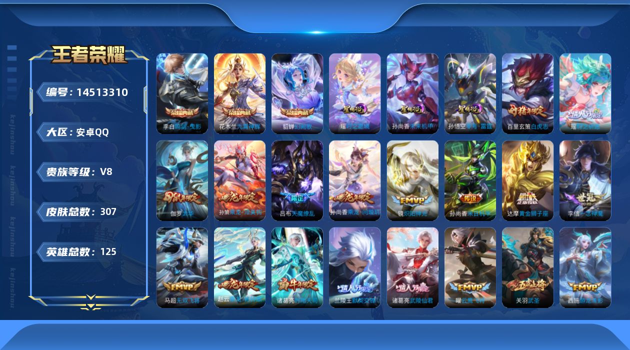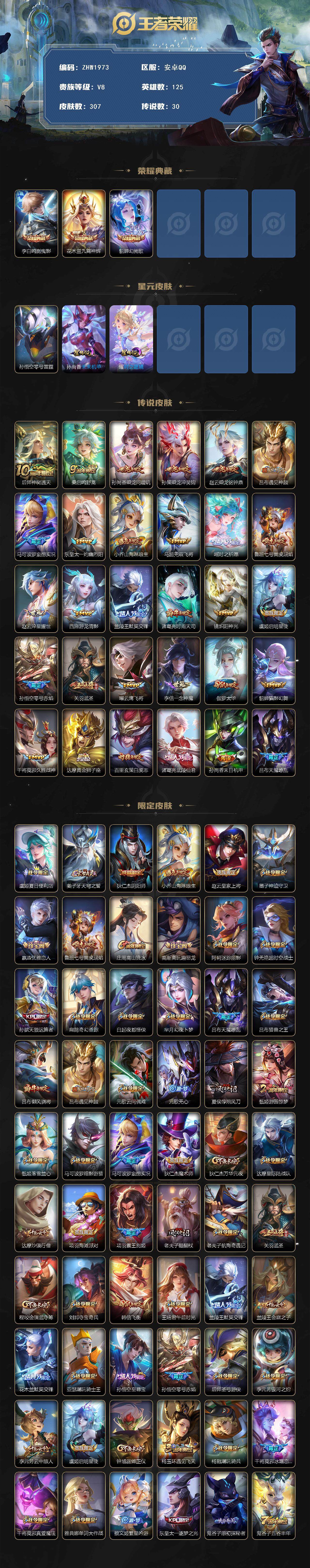 [14513310]【店主推荐捡漏号!可直接换绑】,安卓q-v8-最强王者段位-125英雄-307皮肤-3典藏皮肤-30传说-79史诗 【英雄全皮】:鬼谷子全皮 【荣耀典藏】:李白鸣剑曳影,花木兰九霄神辉,貂蝉幻阙歌 【传说皮肤】:后羿神树通天,桑启鸣野蒿,孙尚香乘龙问璇玑,孙策乘龙淬吴钩,赵云乘龙铭钟鼎,吕布遇见神鼓,马可波罗妄想实况,东皇太一灼幽烈阳,小乔山海琳琅生,马超无双飞将,瑶时之祈愿,鲁班七号寅虎瑞焰,赵云淬星耀世,西施游龙清影,兰陵王默契交锋,诸葛亮时雨天司,镜炽阳神光,虞姬启明星使,孙悟空零号赤焰,关羽武圣,曜云鹰飞将,李信一念神魔,伽罗太华,貂蝉猫影幻舞,干将莫邪久胜战神,达摩黄金狮子座,百里玄策白虎志,诸葛亮武陵仙君,孙尚香末日机甲,吕布天魔缭乱 【限定皮肤】:虞姬夏日便利店,姜子牙天穹之誓,狄仁杰阴阳师,小乔山海琳琅生,赵云皇家上将,墨子神迹守卫,嬴政优雅恋人,鲁班七号寅虎瑞焰,庄周高山流水,高渐离玩趣恶龙,阿轲迷踪丽影,钟无艳超时空战士,孙膑天狼运算者,扁鹊奇幻香踪,白起夜都怪侠,芈月幻夜卜梦,吕布天魔缭乱,吕布猎兽之王,吕布御风骁将,吕布遇见神鼓,元歌云间偶戏,元歌无心,夏侯惇朔风刀,甄姬游园惊梦,甄姬落雪兰心,马可波罗暗影游猎,马可波罗妄想实况,狄仁杰魔术师,狄仁杰万华元夜,达摩星际陆战队,达摩沙漠行僧,项羽海滩派对,项羽霸王别姬,老夫子醍醐杖,老夫子航海奇遇记,关羽武圣,程咬金演武夺筹,刘邦夺宝奇兵,韩信飞衡,王昭君午后时光,兰陵王默契交锋,兰陵王金庭之子,花木兰默契交锋,亚瑟潮玩骑士王,孙悟空至尊宝,孙悟空零号赤焰,后羿圣弓游侠,李元芳银河之约,李元芳云中旅人,虞姬启明星使,钟馗驱傩正仪,杨玉环遇见飞天,杨戬潮玩骑兵,干将莫邪冰霜恋舞曲,干将莫邪真爱魔法,雅典娜单词大作战,蔡文姬繁星吟游,东皇太一逐梦之光,鬼谷子原初探秘者,鬼谷子五谷丰年,诸葛亮武陵仙君,诸葛亮时雨天司,大乔白鹤梁神女,黄忠烈魂,黄忠火炮绅士,苏烈千军破阵,百里玄策白虎志,百里守约朱雀志,弈星混沌棋,沈梦溪星空之诺,沈梦溪大漠名商,明世隐疑决卦,明世隐吟游魔法,裴擒虎李小龙,裴擒虎擒涛扼浪,狂铁电玩高手,米莱狄胡桃异想国,瑶时之祈愿,云中君纤云弄巧,伽罗太华,猪八戒西部大镖客,上官婉儿天狼绘梦者,嫦娥拒霜思,嫦娥暖冬兔眠,蒙犽狂想玩偶喵,鲁班大师探海日志,桑启海盐诗旅,暃星界游侠,艾琳