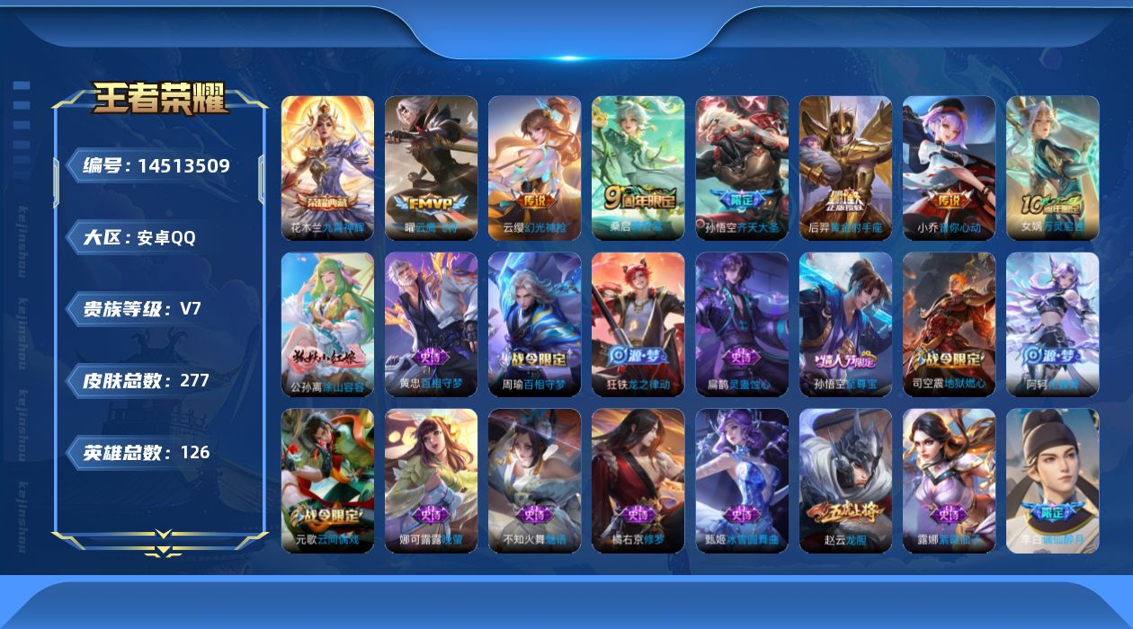 [14513509]可二次 【店主推荐捡漏号!可直接换绑】安卓q-v7-永恒钻石i段位-126英雄-277皮肤-1典藏皮肤-7传说-64史诗 【英雄全皮】:鬼谷子全皮,戈娅全皮 【荣耀典藏】:花木兰九霄神辉 【传说皮肤】:后羿神树通天,云缨幻光神呛,桑启鸣野蒿,孙悟空齐天大圣,小乔音你心动,曜云鹰飞将,后羿黄金射手座 【限定皮肤】:白起狰,大乔绒语心约,姜子牙天穹之誓,李白谪仙醉月,狄仁杰阴阳师,虞姬凯尔特女王,赵云皇家上将,赵云龙胆,嬴政优雅恋人,庄周高山流水,钟无艳超时空战士,扁鹊炼金王,元歌云间偶戏,元歌无心,夏侯惇朔风刀,甄姬落雪兰心,曹操烛龙,狄仁杰魔术师,狄仁杰万华元夜,项羽海滩派对,老夫子醍醐杖,程咬金演武夺筹,刘邦夺宝奇兵,孙悟空至尊宝,孙悟空齐天大圣,李元芳云中旅人,钟馗驱傩正仪,杨玉环遇见飞天,女娲朔望之晖,蔡文姬繁星吟游,太乙真人饕餮,鬼谷子原初探秘者,鬼谷子五谷丰年,弈星混沌棋,明世隐疑决卦,裴擒虎李小龙,裴擒虎擒涛扼浪,狂铁御狮,云中君纤云弄巧,盾山御銮,嫦娥拒霜思,西施玲珑珍味,鲁班大师探海日志,桑启海盐诗旅,戈娅驭风魔法,艾琳流音漫舞,司空震地狱燃心,阿古朵江河有灵,张良古海寻踪,蒙犽百解令,高渐离燃音魔法,妲己灵卜魔法,鬼谷子天穹祈灯,沈梦溪龙舞盛年,鲁班七号蔬乡物语,李元芳蔬乡物语,刘邦剑破天穹,程咬金群星魔术团,刘备异域游侠,周瑜熔金海岸 【年限皮肤】:赵云龙胆 【赛季限定】:扁鹊炼金王,白起狰,夏侯惇朔风刀,曹操烛龙,狄仁杰万华元夜,老夫子醍醐杖,程咬金演武夺筹,张良古海寻踪,李元芳云中旅人,虞姬凯尔特女王,钟馗驱傩正仪,太乙真人饕餮,鬼谷子原初探秘者,弈星混沌棋,明世隐疑决卦,裴擒虎擒涛扼浪,狂铁御狮,盾山御銮,鲁班大师探海日志,桑启海盐诗旅,鬼谷子天穹祈灯,刘邦剑破天穹,姜子牙天穹之誓 【战令限定】:钟无艳超时空战士,元歌云间偶戏,甄姬落雪兰心,刘邦夺宝奇兵,艾琳流音漫舞,女娲朔望之晖,西施玲珑珍味,司空震地狱燃心,戈娅驭风魔法,高渐离燃音魔法,妲己灵卜魔法,鲁班七号蔬乡物语,李元芳蔬乡物语 【史诗皮肤】:露娜紫霞仙子,阿轲暗夜猫娘,赵云皇家上将,貂蝉圣诞恋歌,甄姬冰雪圆舞曲,王昭君偶像歌手,狄仁杰魔术师,廉颇地狱岩魂,宫本武藏鬼剑武藏,孙尚香水果甜心,嬴政优雅恋人,妲己魅力维加斯,妲己女仆咖啡,墨子金属风暴,吕布圣诞狂欢,李白千年之狐,吕布