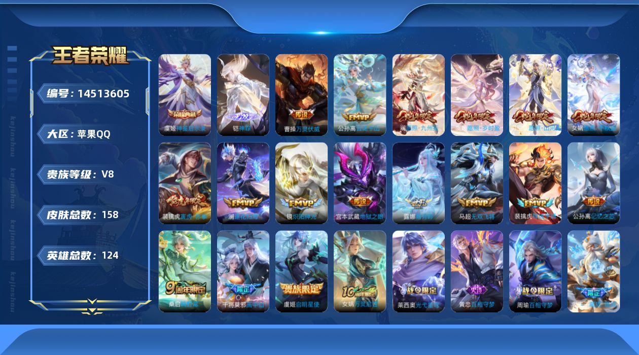 [14513605]0apnth可二次无双1水晶1传说17优质限定12 信用分正常 钱包已注销 水晶皮肤:神鉴启示录 无双皮肤:神罪 新传说限定:愿照·山河定祥瑞亨通愿照·九州拓愿照·千秋盛愿照·岁时盈 传说限定:寅虎·赤拳画中仙启明星使 新传说皮肤:万灵伏威云诺千山 传说皮肤:霜月吟澜逐花归海无双飞将地狱之眼炽阳神光记忆之芯鸣野蒿 新史诗限定:藏狐·褐绒万灵启世 史诗限定:至尊宝山海·玄木吟 新史诗皮肤:糖绘人间战舞者星界特工百相守梦-黄忠飞车小橘子 优质史诗皮肤:晚萤赏金猎手魅语时之恋人-孙尚香 周年皮肤:鹤鸣心笺神树通天 珍宝阁:妄想食味 史诗皮肤:星夜王子圣诞狂欢乘风破浪幽灵船长水晶猎龙者鬼剑武藏千年之狐紫霞仙子冰冠公主曙光守护者缤纷独角兽魅力维加斯女仆咖啡圣诞恋歌偶像歌手黄金分割率水果甜心鹰眼统帅逐浪之夏特工魅影