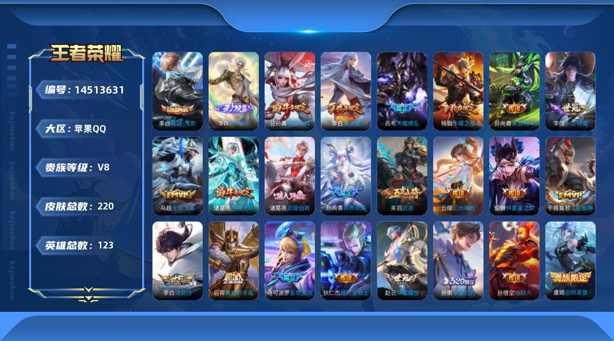 [14513631]0apqjz可二次"220皮肤无双1水晶1传说22优质限定23 qq钱包已注销 信用分合格 李白全皮, 水晶皮肤:鸣剑·曳影 无双皮肤:碎月剑心 传说限定:天魔缭乱武圣永曜之星挚爱之约凤求凰武陵仙君时雨天司异界灵契妄想实况祈雪灵祝启明星使 新传说皮肤:幻光神呛 传说皮肤:一念神魔末日机甲-孙尚香黄金射手座无双飞将淬星耀世诗剑行地狱火仲夏夜之梦久胜战神超时空战士-狄仁杰 新史诗限定:赞萌露比 史诗限定:冰锋战神神威谪仙醉月傲雪梅呛至尊宝辉光之辰蜜橘之夏逐梦之影逐梦之音逐梦之星天狼溯光者 新史诗皮肤:星界特工 优质史诗皮肤:晚萤修罗魅语真我赫兹百里守约 周年皮肤:李小龙游园惊梦梁祝 珍宝阁:女武神 史诗皮肤:地狱岩魂星夜王子圣诞狂欢末日机甲-吕布乘风破浪幽灵船长德古拉伯爵水晶猎龙者心灵战警猫狗日记-孙策暗夜猫娘鬼剑武藏千年之狐紫霞仙子白龙吟暗隐猎兽者黎明之约曙光守护者原初追逐者纤云弄巧缤纷独角兽金属风暴魅力维加斯女仆咖啡摇滚巨星暗夜贵公子圣诞恋歌偶像歌手黄金分割率水果甜心电玩小子鹰眼统帅逐浪之夏特工魅影无限星赏官绅士熊喵天才门将乱世虎臣舞动绿茵繁星吟游 "